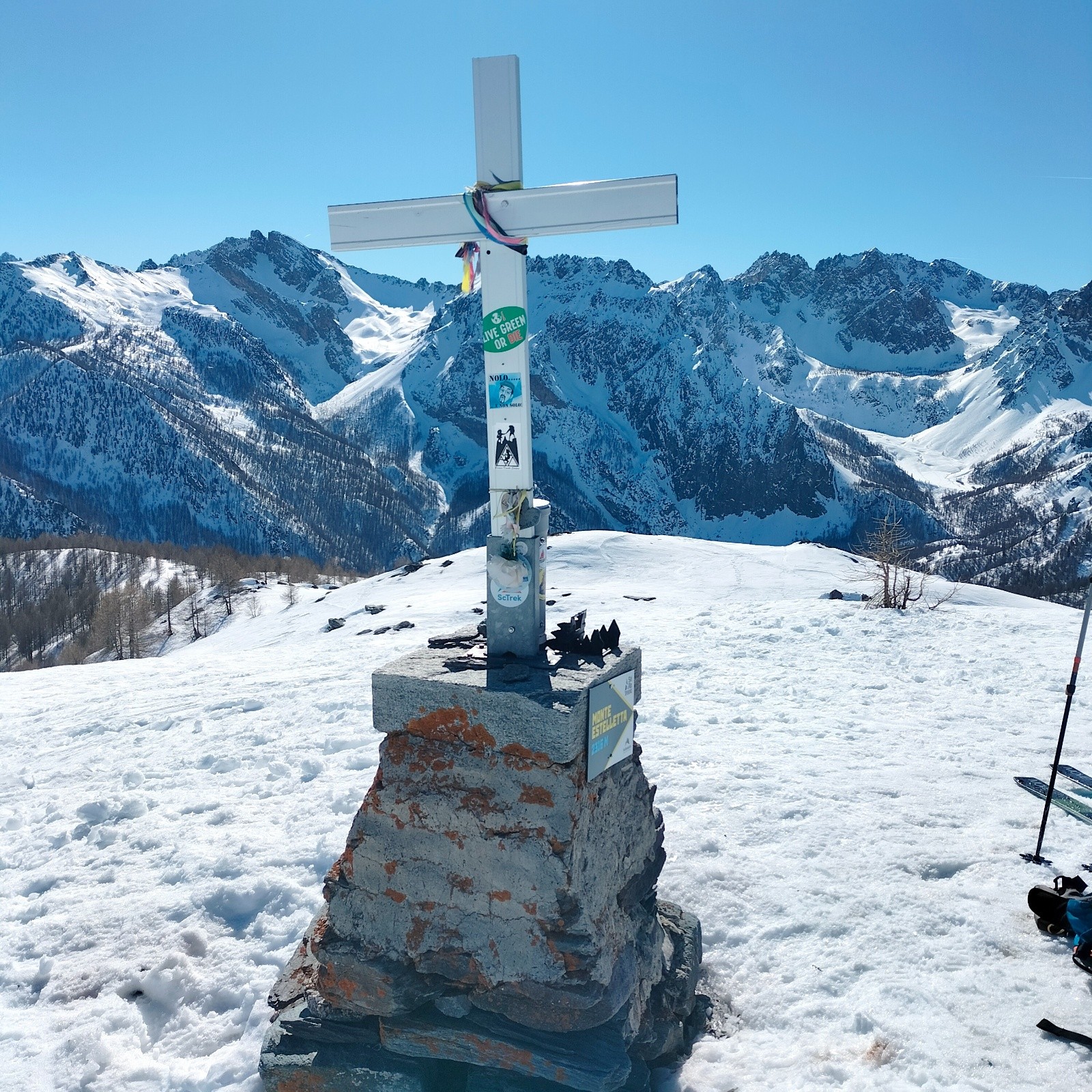 Jeudi 26, départ du Pont de Maira, pour le sommet d'Estelleta. Montée dans la forêt, quelques passages ont nécessité les couteaux. Le point de vue au sommet est magnifique . Descente qui aurait pu attendre un peu pour profiter d'une neige de printemps..