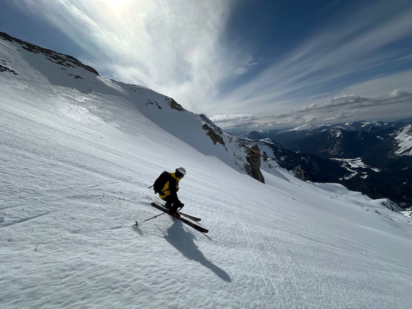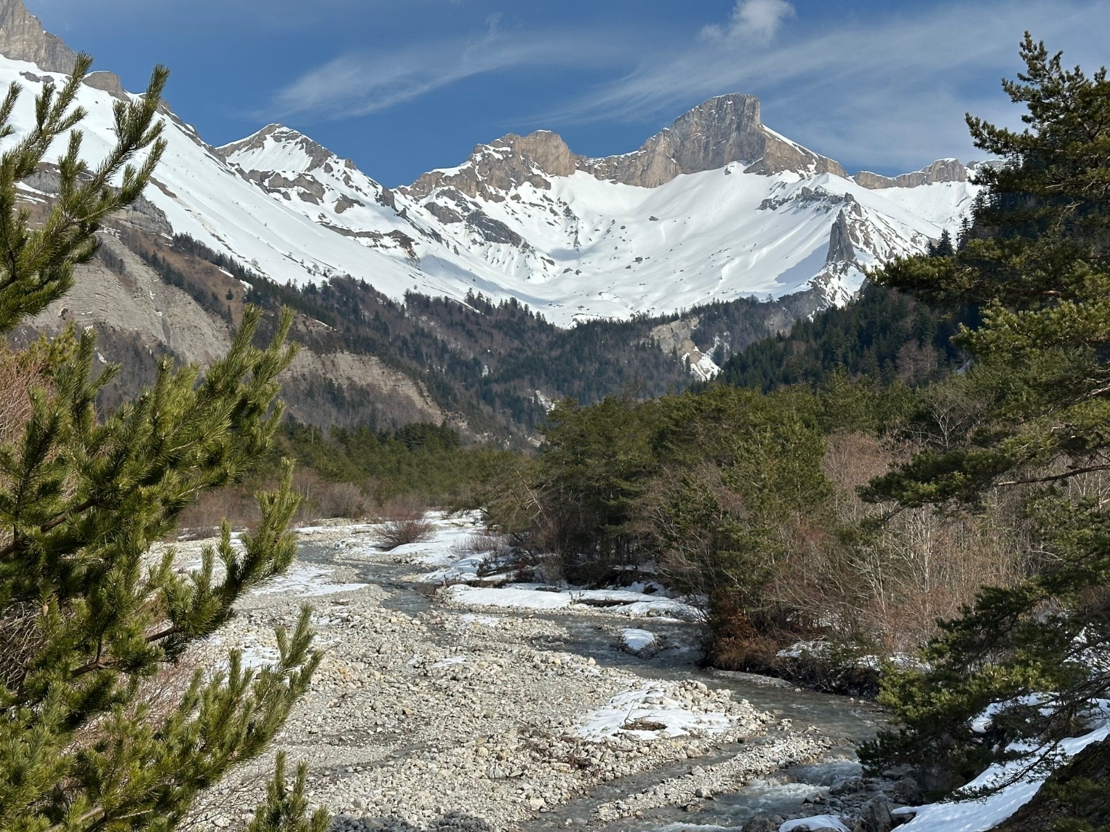 Itinéraire suivi : Nous partons vers 9h15 du centre de vacances au bout de la route de la Jarjatte ( 1070m). Remontée toujours un peu fastidieuse du fond du vallon, puis nous prenons le chemin en rive gauche du Ravin du Fleyrard, jusqu’au vallon, splendide. Montée vers la petite selle qui sépare ce vallon de celui des Clausis, à l’altitude 2180. La descente du vallon a été un régal sur une neige transformée légèrement decaillée. Le chemin par contre, très exigeant !