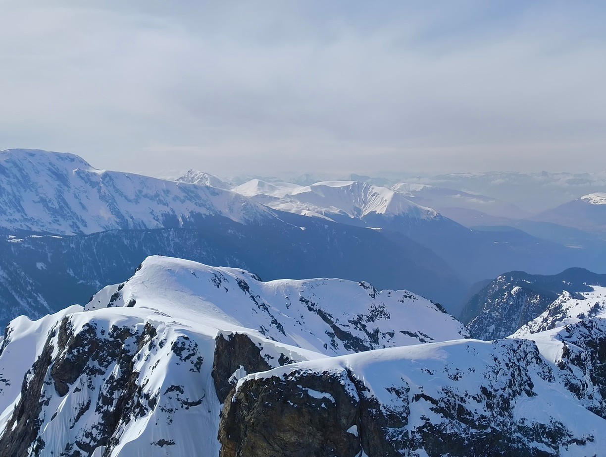 Dès la montée vers la brèche Robert, je la sentais mal cette sortie : neige béton trafolée, voile nuageux. Ca sentait bien le plan loose. Et puis, en descendant l'eulier, j'ai trouvé une trajectoire décaillée (comme quoi le regel ne devait pas être bien puissant). Bon ben tant qu'à être là, on va aller voir si le Sorbier veut bien de moi. Et là miracle, je trouve une trace suffisamment propre pour monter sans les couteaux. Je ne sais pas si vous vous rendez compte. Une belle trace dans le bassin grenoblois. C'est comme trouver un ministre compétent dans un gouvernement Macron. Là, je me suis dit, c'est ton jour. T'as pas de crampons mais si ça se trouve il y a une bonne grosse trace profonde (à pied) dans la dernière pente jusqu'au sommet. Et ben, vous savez quoi ? Il y avait mieux : à partir du dernier coup de cul (celui qui est bien chiant quand on crevé) une belle trace à pied mène jusqu'au sommet -> skis sur le sac = pas la peine de faire des conversions moisies. Au sommet, j'étais un tout petit peu trop tôt, mais la pente finale se skie bien. Dans la combe en serrant à D le ski était plutôt bon. Ne restait plus qu'à cocher les vans. Et là aussi, le ski était bon (en serrant à D). Le bon karma s'est terminé au sommet de la Croix où je me suis fait cueillir par les nuages. Je me suis dit qu'il ne fallait pas forcer le destin et je suis rentré sagement au parking.