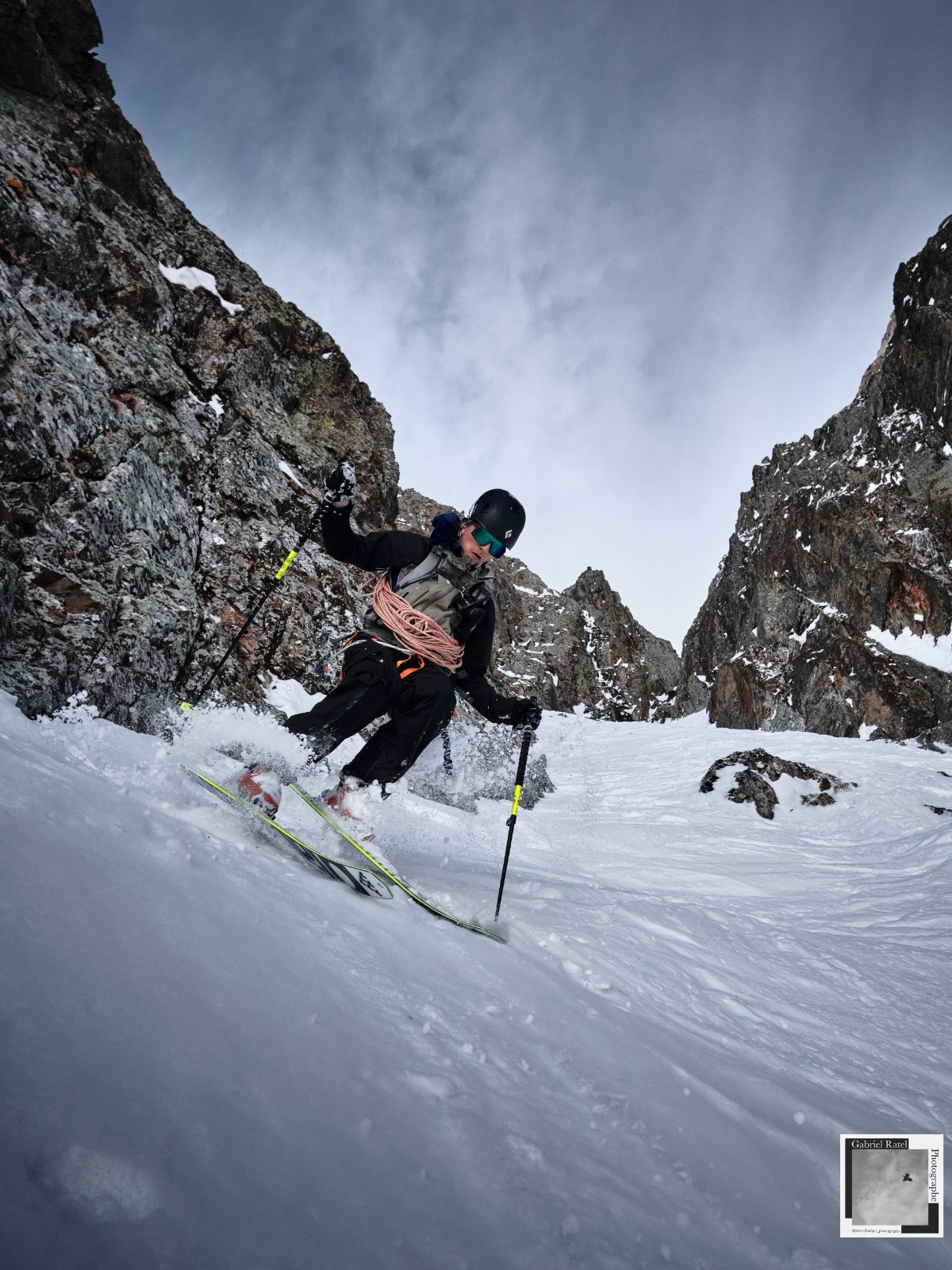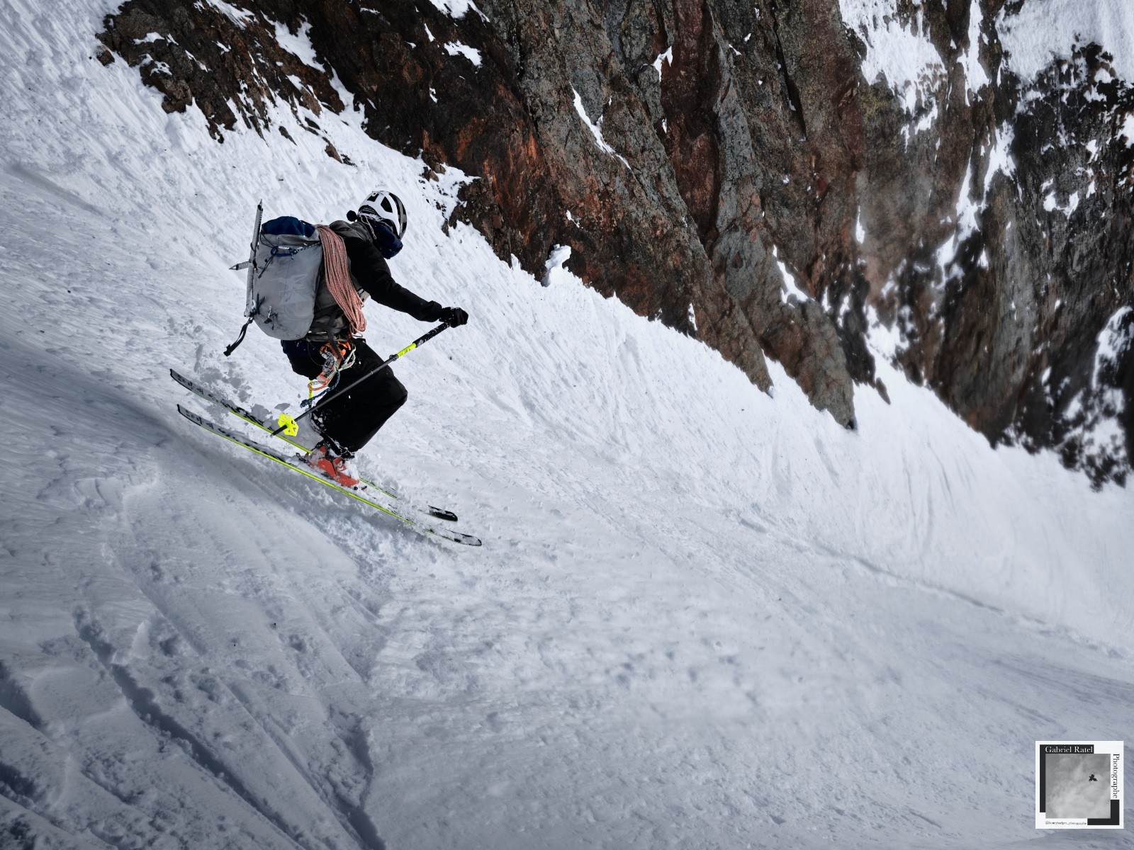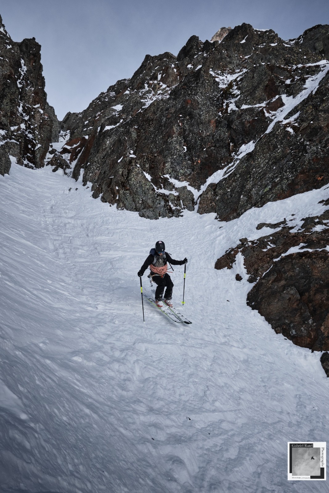 Descente dans le magnifique couloir 5.4. Neige correcte, avec encore les traces de nos prédécesseurs de la semaine dernière.