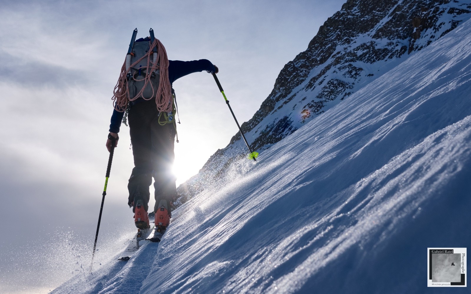 Montée par le couloir en 4.2 qui arrive à proximité du départ du String afin de gagner du temps. Approche efficace, avec une neige bien portante à la montée en peaux. En revanche, dans le couloir, on s’enfonce un peu (la neige reste bonne, il doit y avoir de très bons runs à faire dans ces conditions).