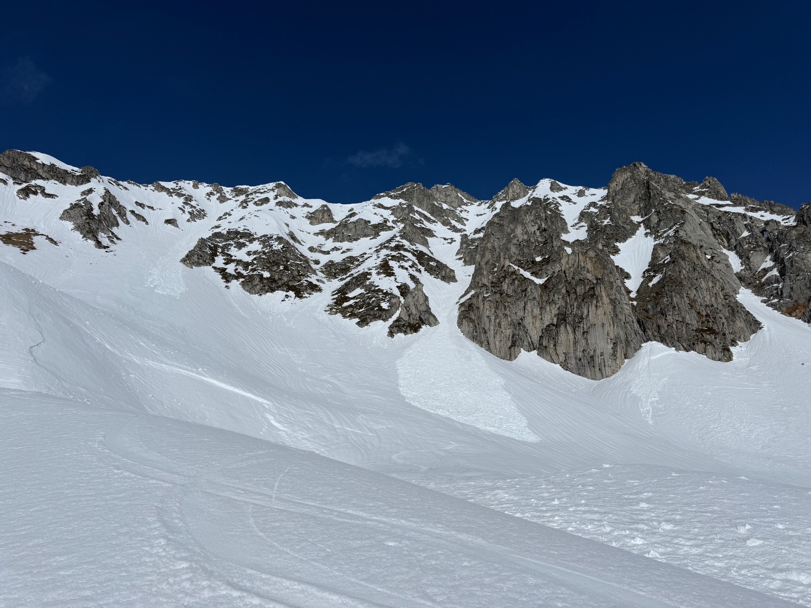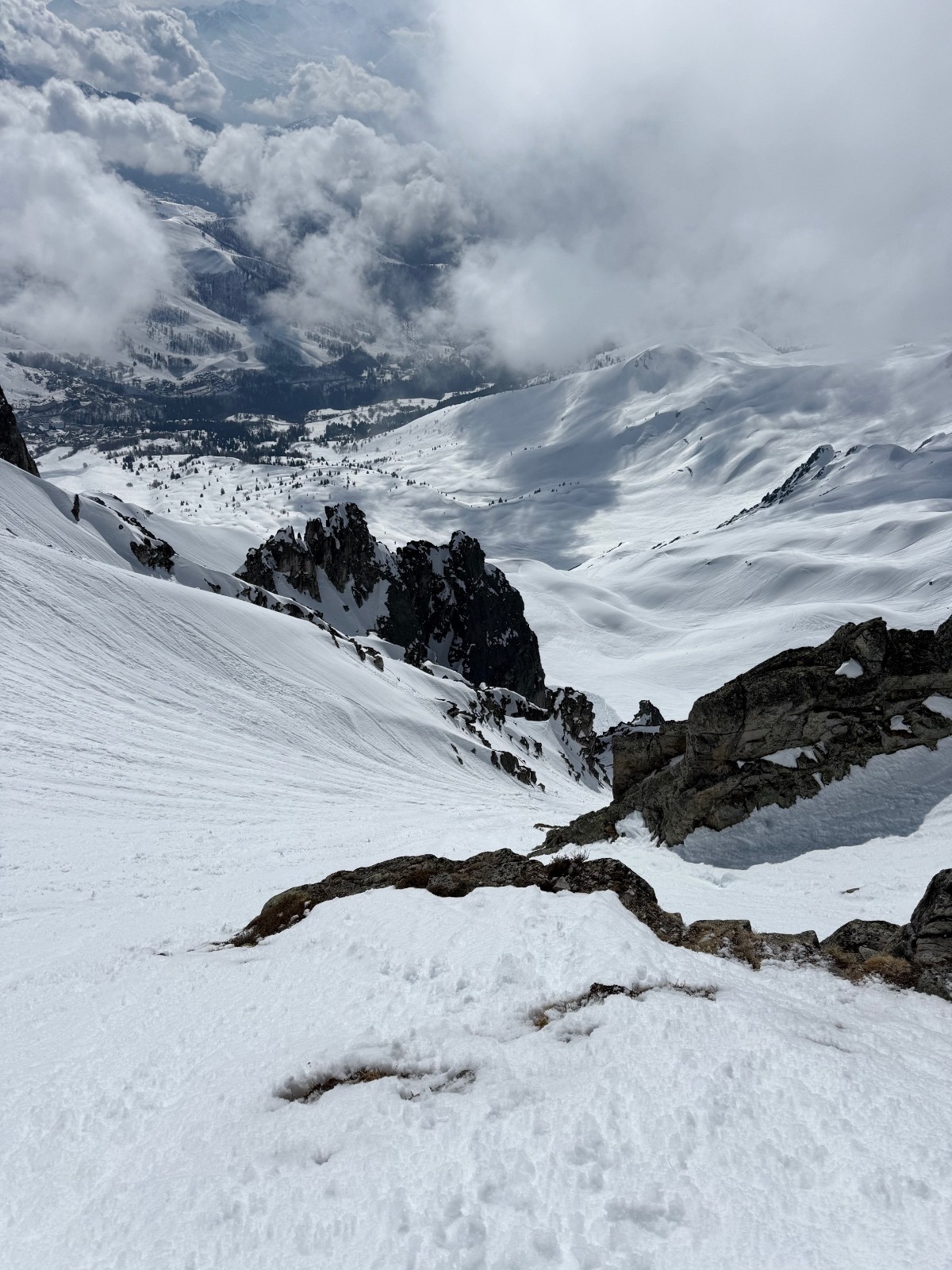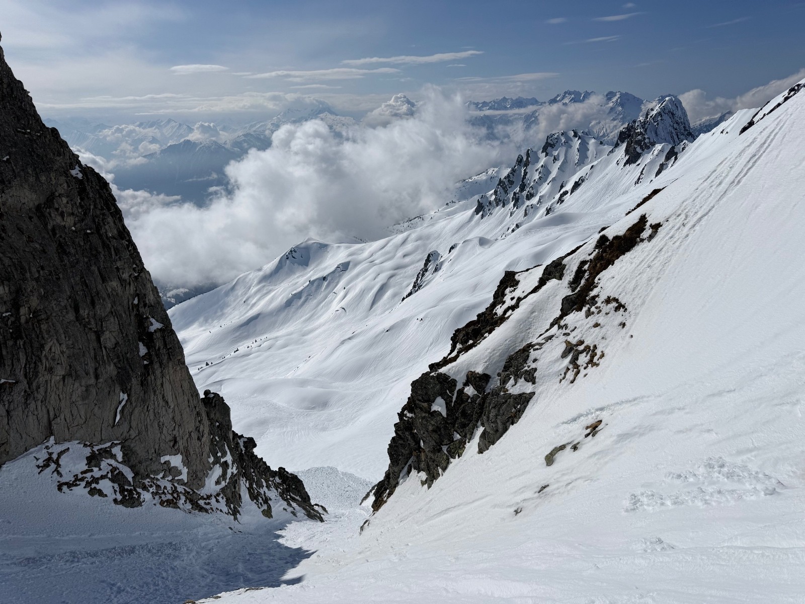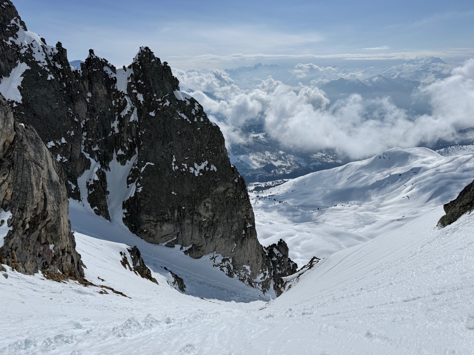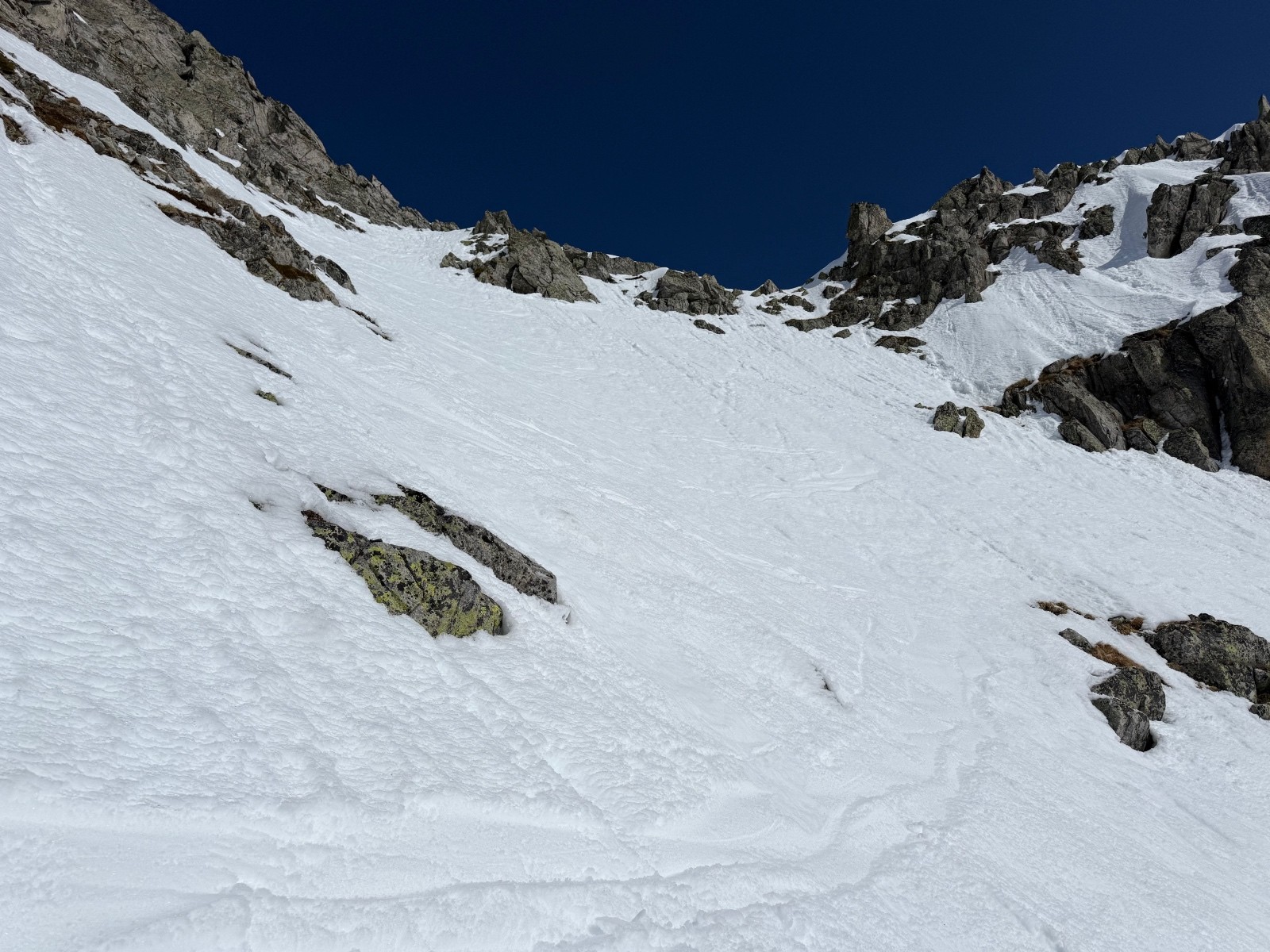 > Couloir purgé. Ça sort et ça chausse sur la crête ( ce n’est pas tjs le cas, final raide, un relai équipé avec des cordelettes pour faire un rappel au départ).