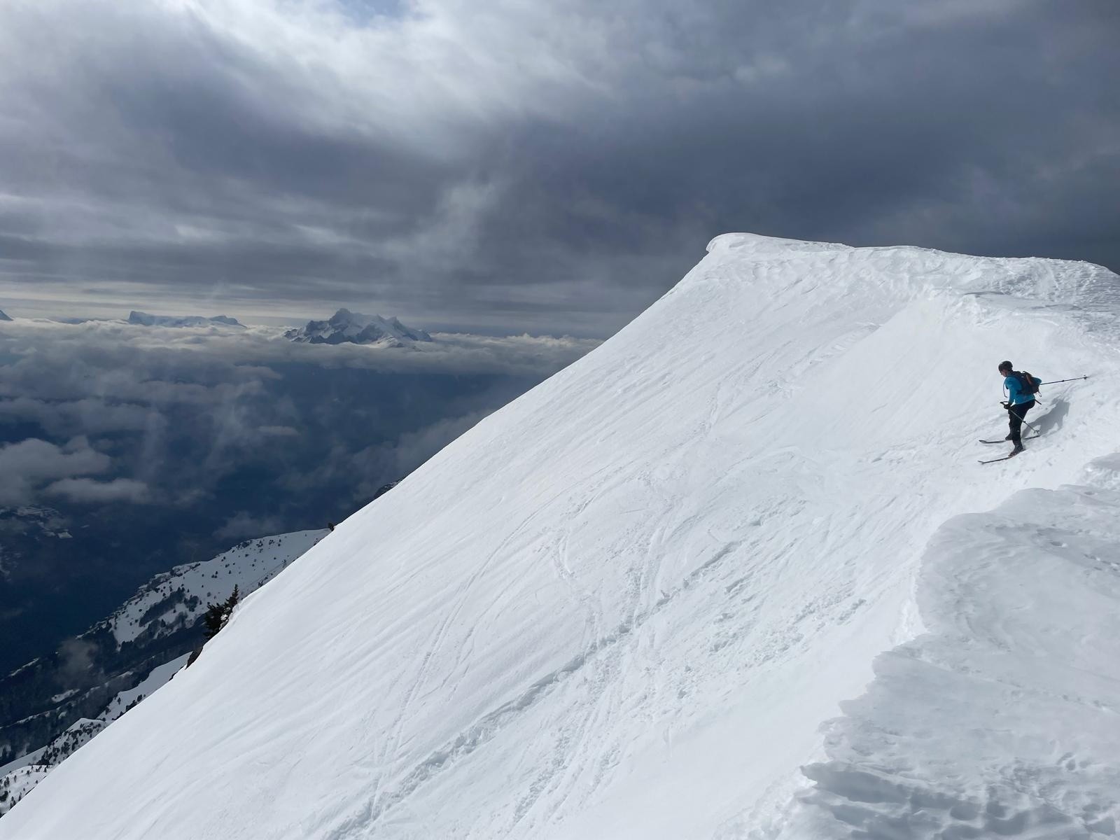 Une fois prêt on rejoint l'entrée du couloir sous le soleil. C'est pas si impressionnant que d'en face depuis le sommet. Je m'engage en premier et au premier virage c'est moquette. Parfait, on va se régaler😍. Le haut était excellent, ensuite au virage c'est toujours aussi bon mais il faut zigzaguer un peu entre les vieilles boulettes. On arrive ensuite dans la face plus large, toujours très bonne puis on rejoint l'entrée du couloir du bas sous la fontaine de la mer. A nouveau on profite de très bons virages, s'en suit une mini traversée de 10 m pour prendre la sortie du couloir. Ici c'est bien plus raide qu'ailleurs et un peu plus étroit mais avec les conditions du jour on est passé sans difficulté et le sourire aux lèvres 😜. En dessous par contre ça fait moins rêver, il y a eu de belles coulées et la neige est bien plus molle. On est descendu jusqu'à 1700 m pour suivre la trace GPX que j'avais prise sur ST. Ensuite repeautage, 50 m un peu pourri où on n'a pas voulu trop traîner, un peu d'herbe à cause d'une avalanche de fond, un peu de boulettes à traverser et ensuite on se sentait mieux. La remontée était plutôt jolie dans une ambiance assez austère avec les nuages qui sont revenus s'accrocher au-dessus de nos têtes et la vallée si proche mais inaccessible en dessous. C'était superbe ce circuit mais si on devait le refaire on ne ferait que le petit circuit sans descendre jusqu'en bas, ça vaut plus le coup et les conditions y sont meilleures. On a ensuite pris le brouillard et on est remonté dans un gros jour blanc sur les crêtes jusqu'au Tabor.