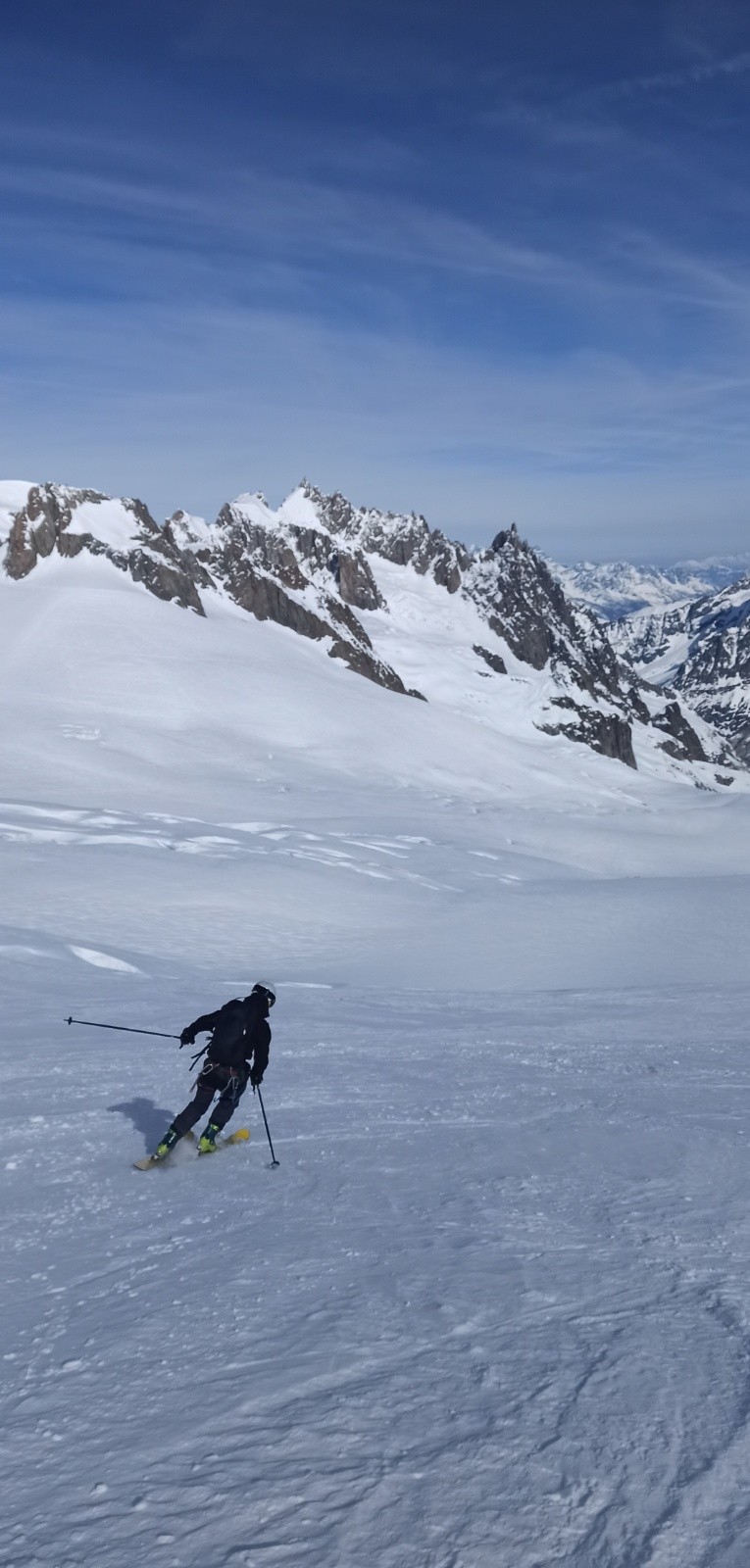 Glacier bien bouché, neige plutôt très agréable à skier, toutefois, une fois la salle a manger rejoint, on s'aperçoit, que la neige tombée en abondance il y a 15 jours, a quasi disparue, la glace repointe son nez à de nombreux endroits .