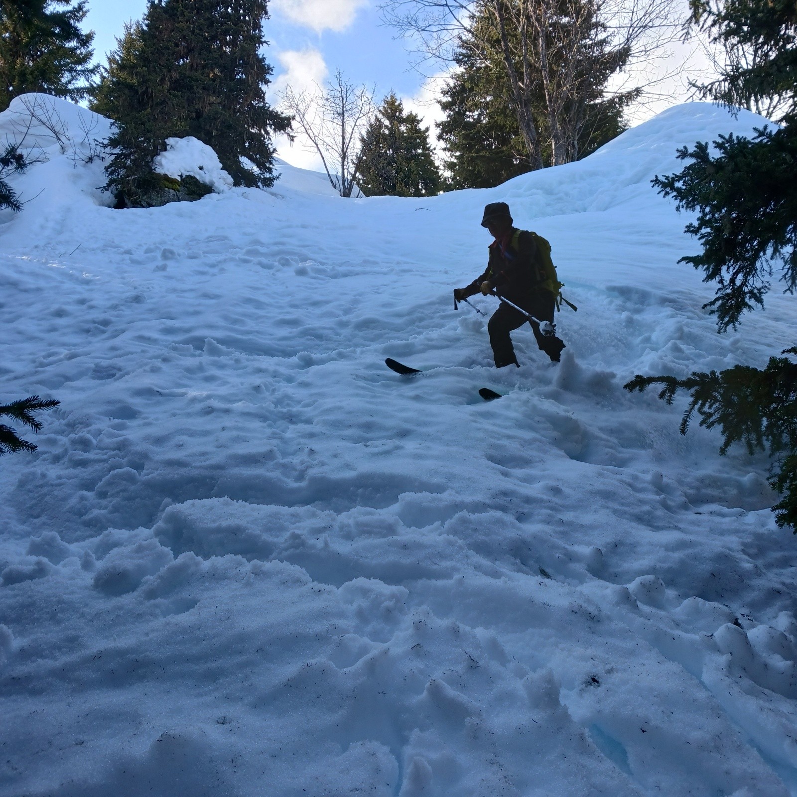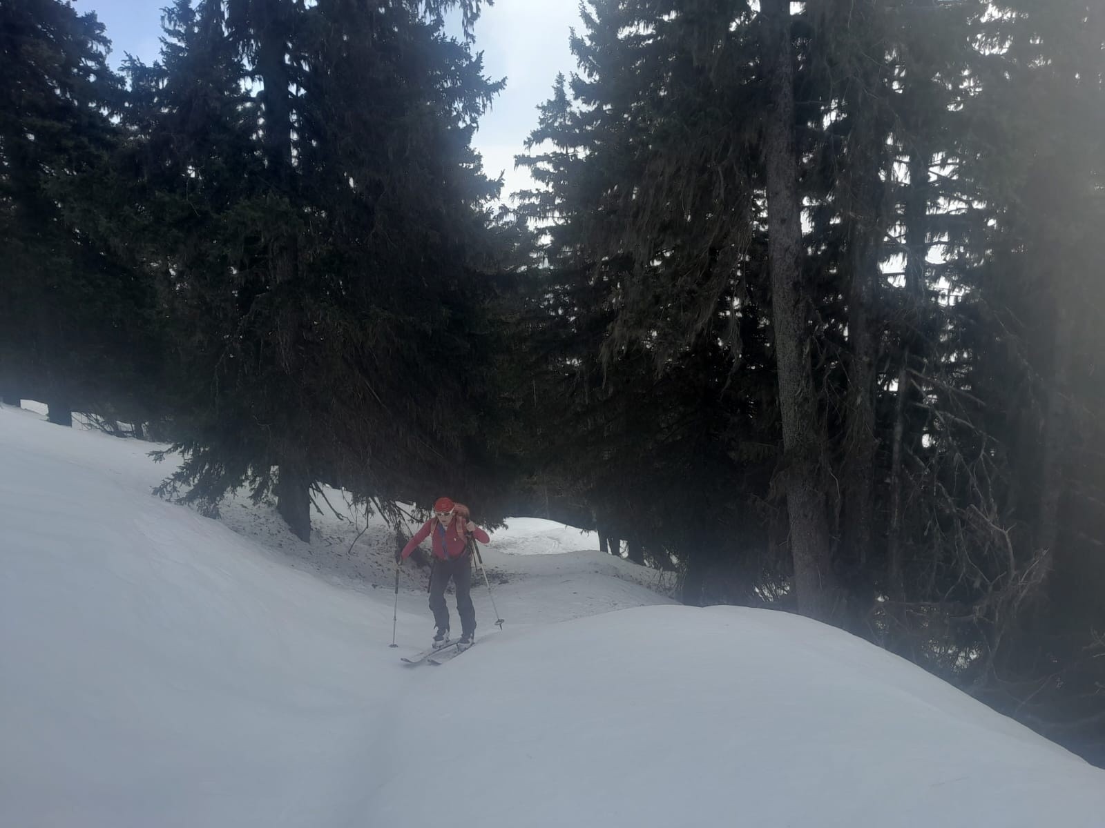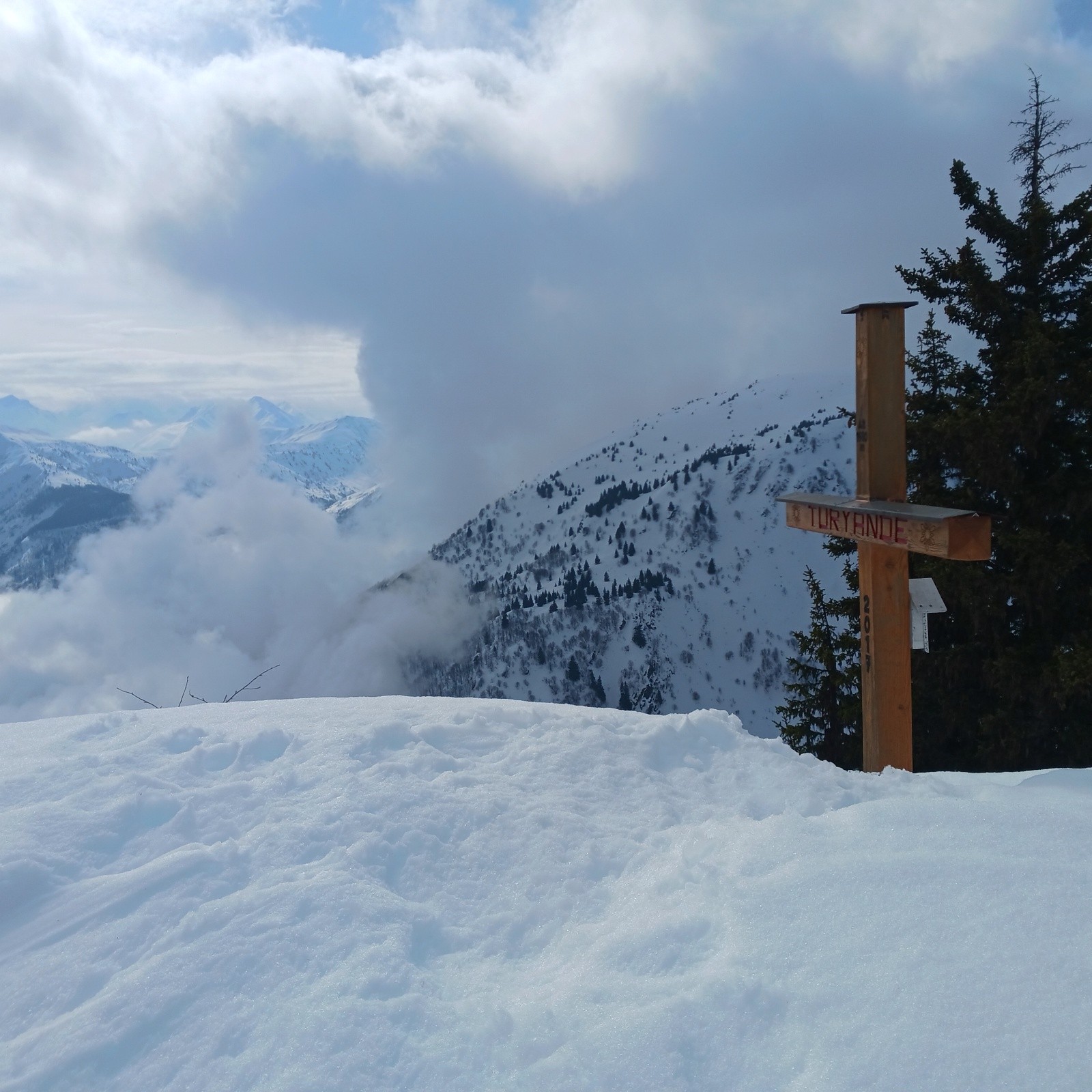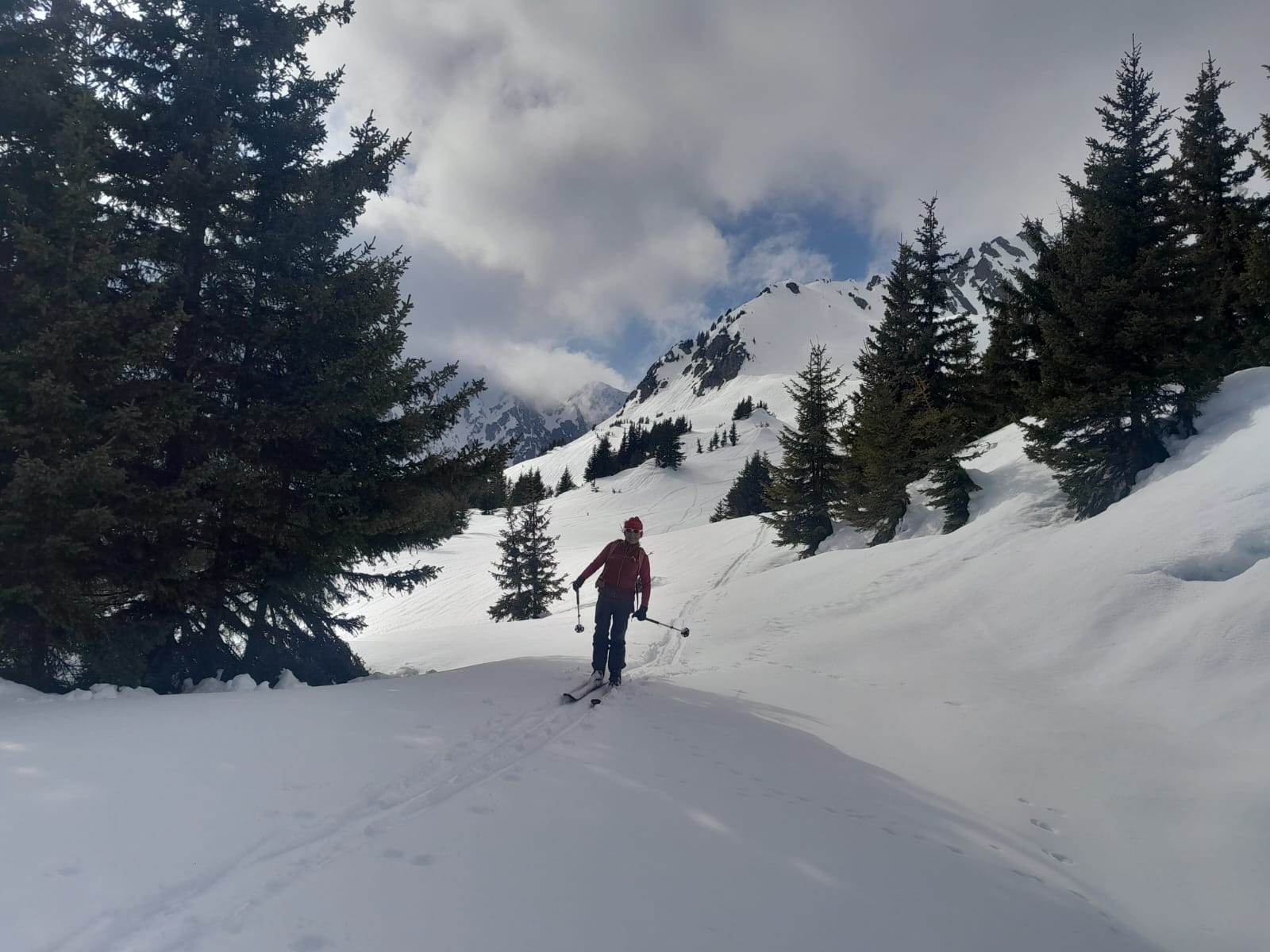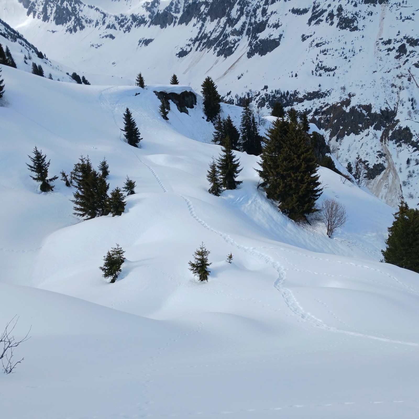 Conditions pour le ski bien meilleures qu'espérées à la montée. Des boules dans la face supérieure, mais ça reste du bon ski. Pas de pousse-bâtons sur le plateau du Triandou. Malgré l'absence de regel et une couche superficielle bien humide, le fond reste portant, même en forêt. Soupe épaisse un peu pénible dans les lacets inférieurs de la piste à 15h.