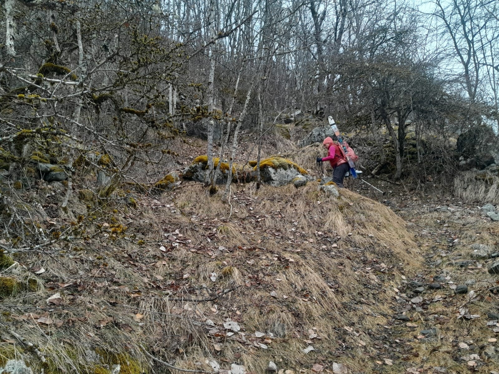 Chaussage/déchaussage 1100m. A cette altitude, seule la piste est enneigée. Enneigement suffisant pour couper les lacets à 1200m.