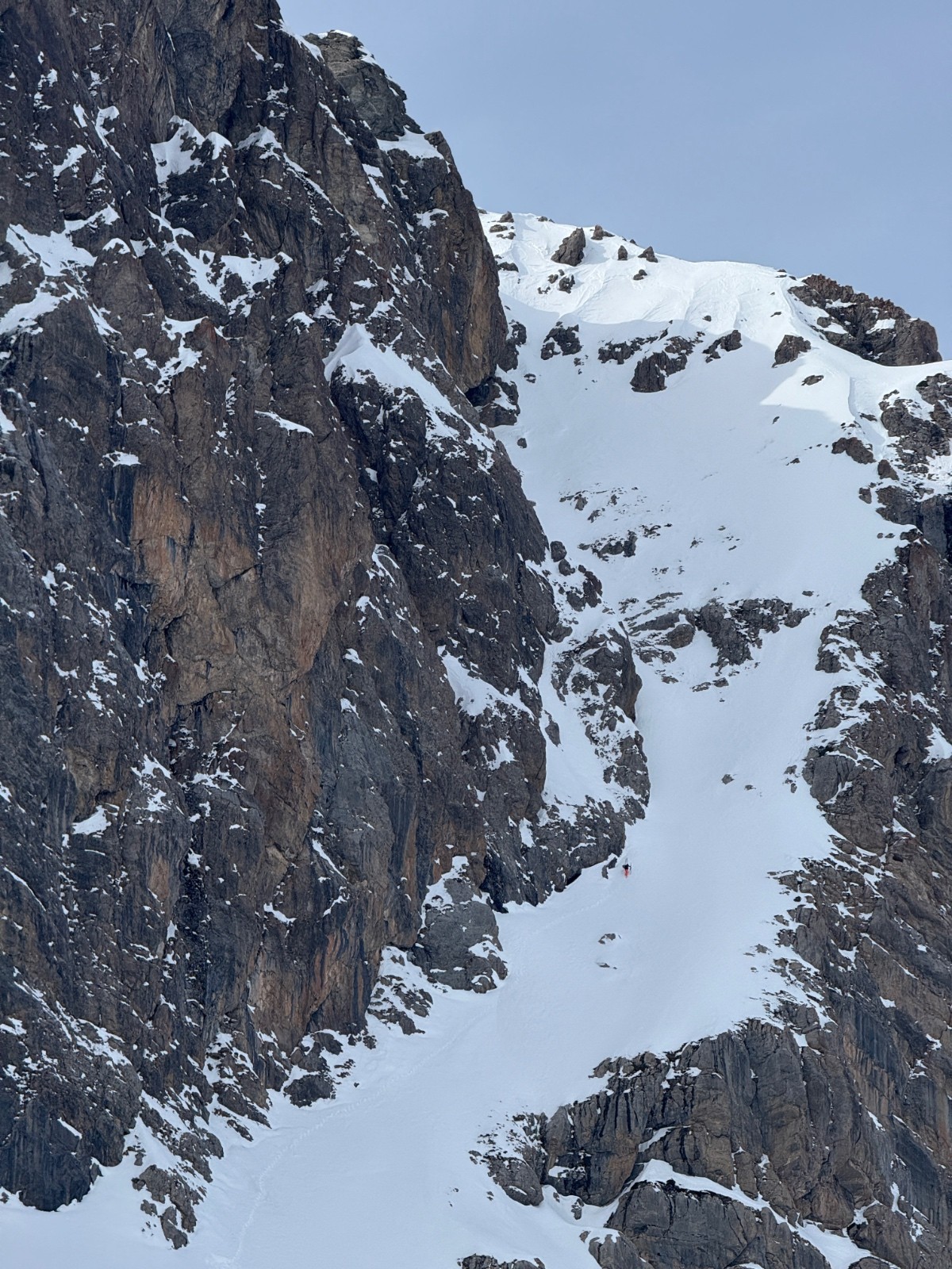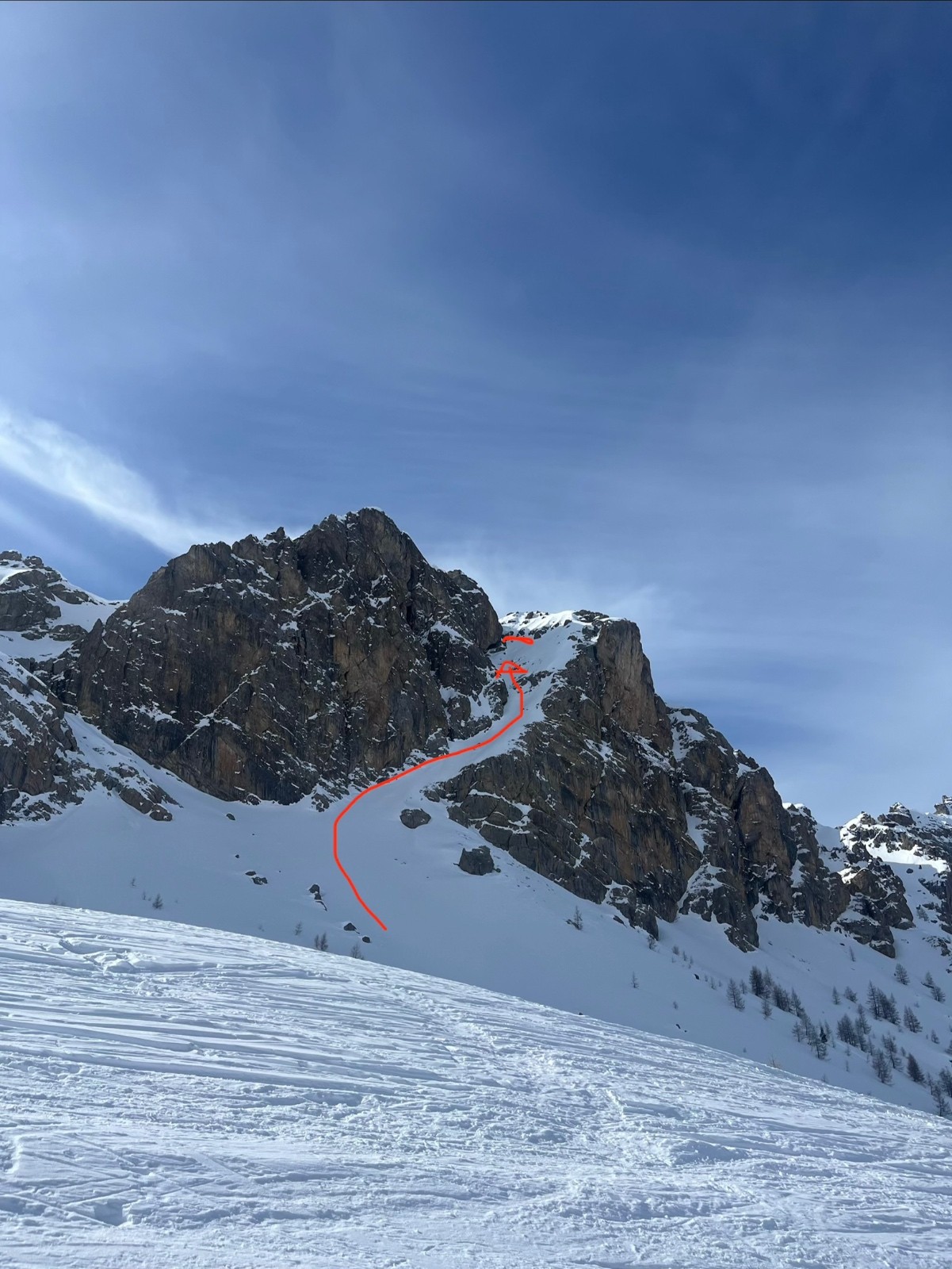 Départ depuis le bas du couloir , montée droite jusqu’à parois , puis on l’a longe sur sa droite, puis je me suis arrêté au niveau d’une marche et passage complexe (en rouge sur photo) neige changeante (dure/poudre/tassée). Mais très bonne sensation