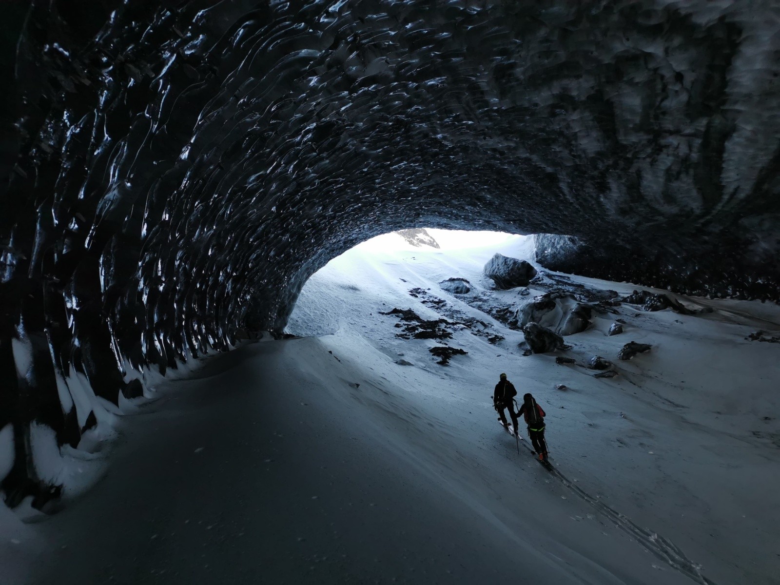 En dessous, 1ere belle descente, moquette, puis poudre, avec la traversée de la grotte de glace (déjà prise à la montée). C'était Waouh..