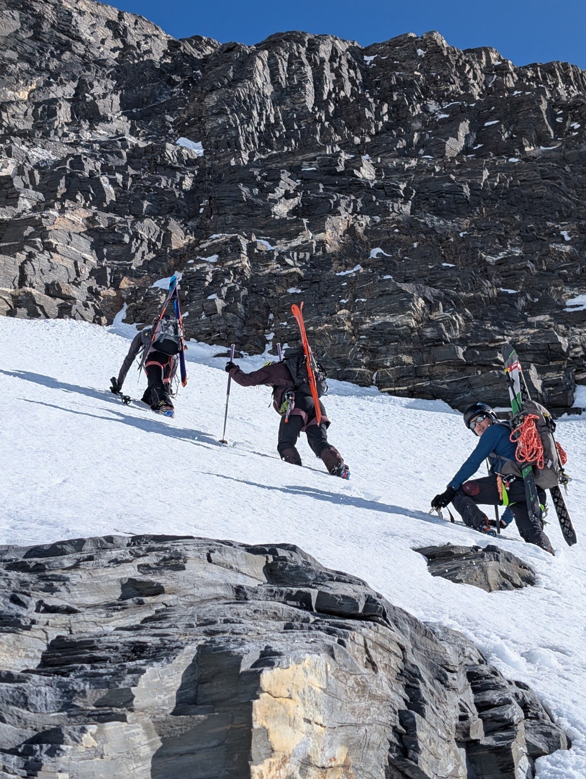 Dans la combe centrale, à partir de 3100, ça se raidit fortement, couteaux puis crampons pour passer le verrou entre les barres rocheuses, au dessus les pentes étaient encore très dures, on a encore remonté 100 m en crampons, pleine face, avant de dire Stop.