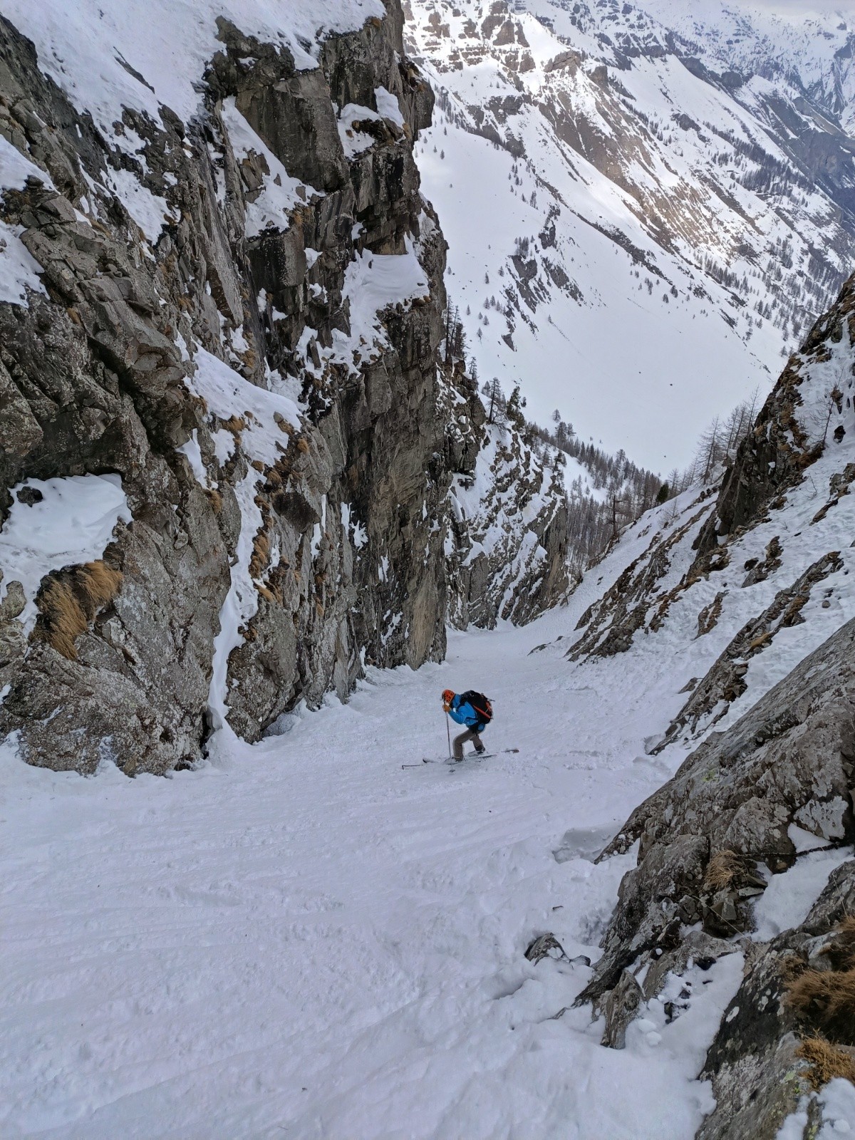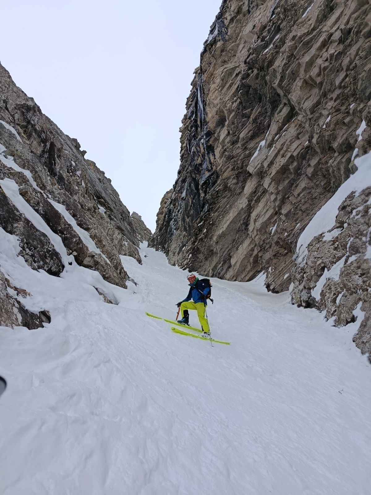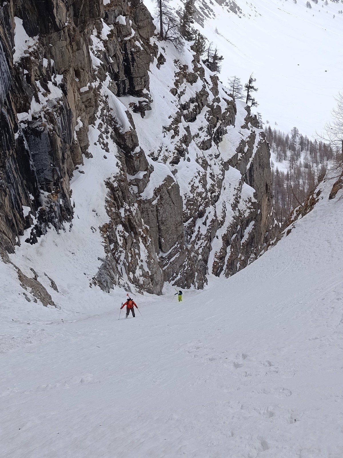 Conditions nivo et activité avalancheuse : ras, le couloir est bien remplie. Temps couvert, pas de coulée même en sud. Attention aux chutes de pierres en haut du couloir