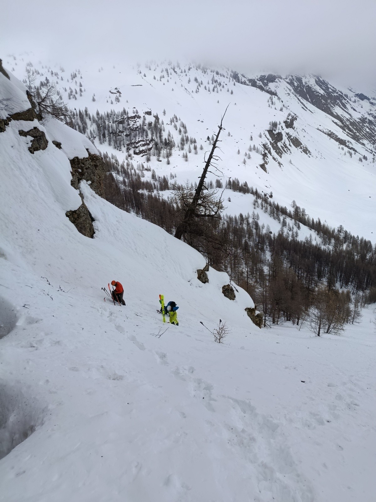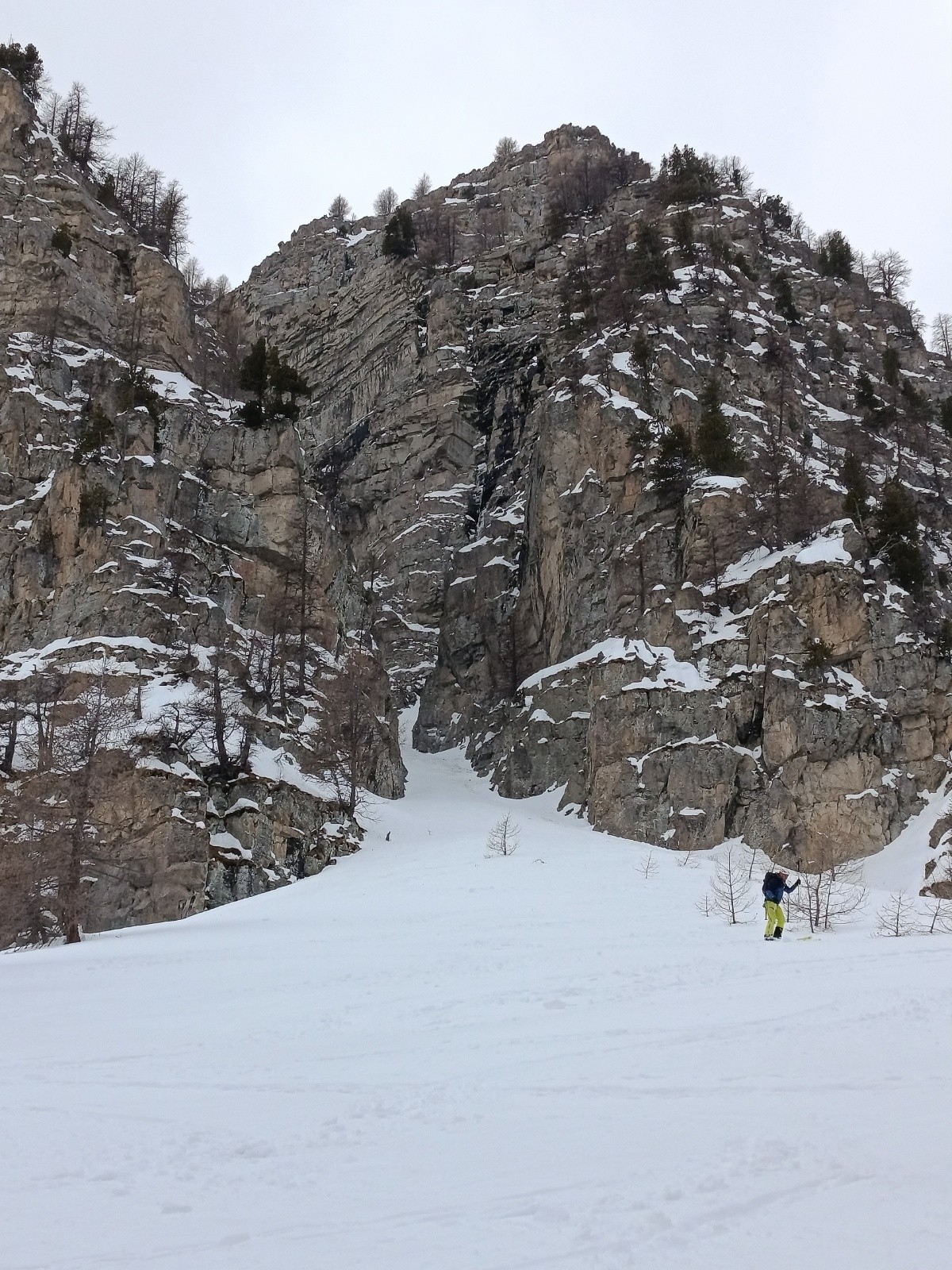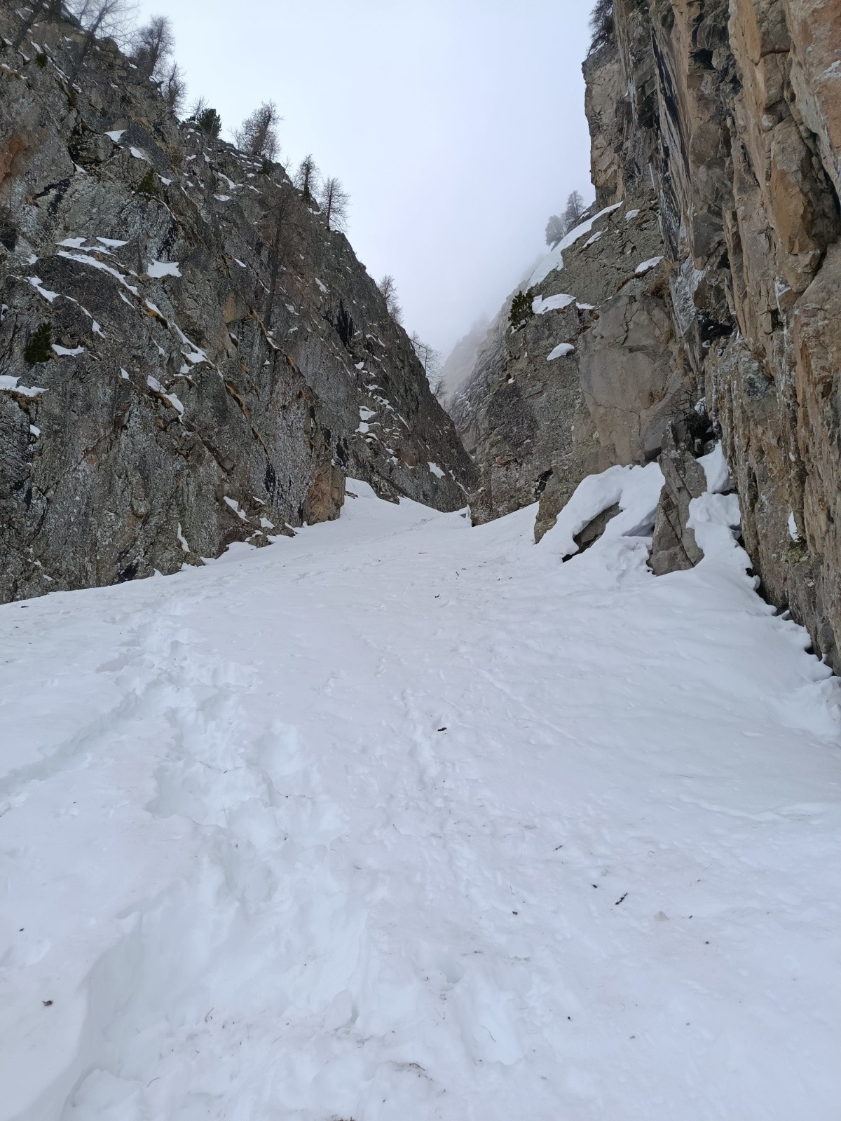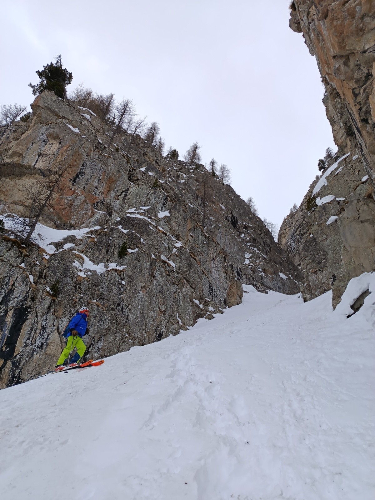 Conditions nivo et activité avalancheuse : ras, le couloir est bien remplie. Temps couvert, pas de coulée même en sud. Attention aux chutes de pierres en haut du couloir