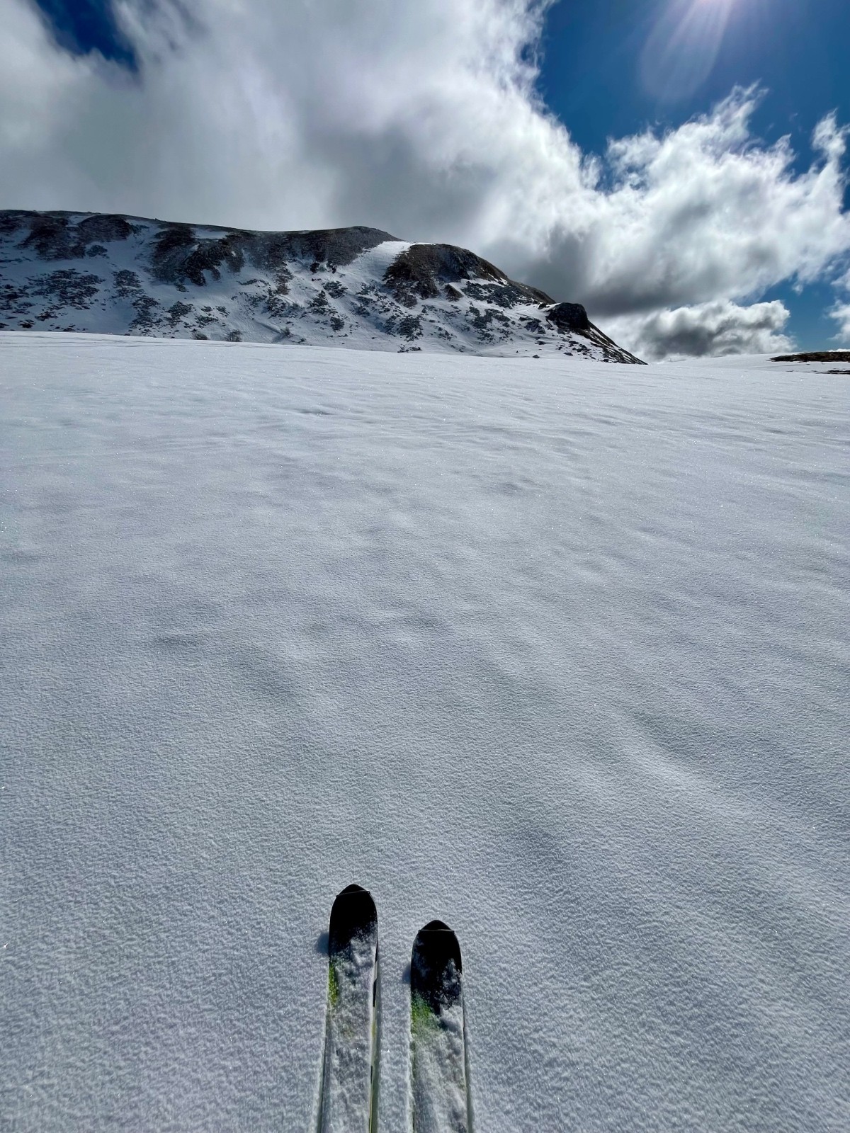 Conditions pour le ski : Neige dure/glacée par plaques à la montée sur les crêtes et sommets (cause : vent), couteaux nécessaires. Descente en neige qui alterne entre glace et soupe malgré 3cm de neige fraîche au delà des 1700m