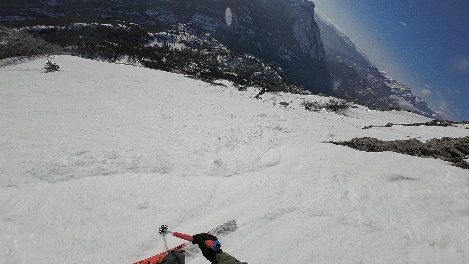 Au pied de la face sur le replat nous tirons à main gauche pour rejoindre le couloir du Guigou, qui passe encore pour quelques jours (une étroiture bien étroite) puis rejoindre la piste tout en bas.
