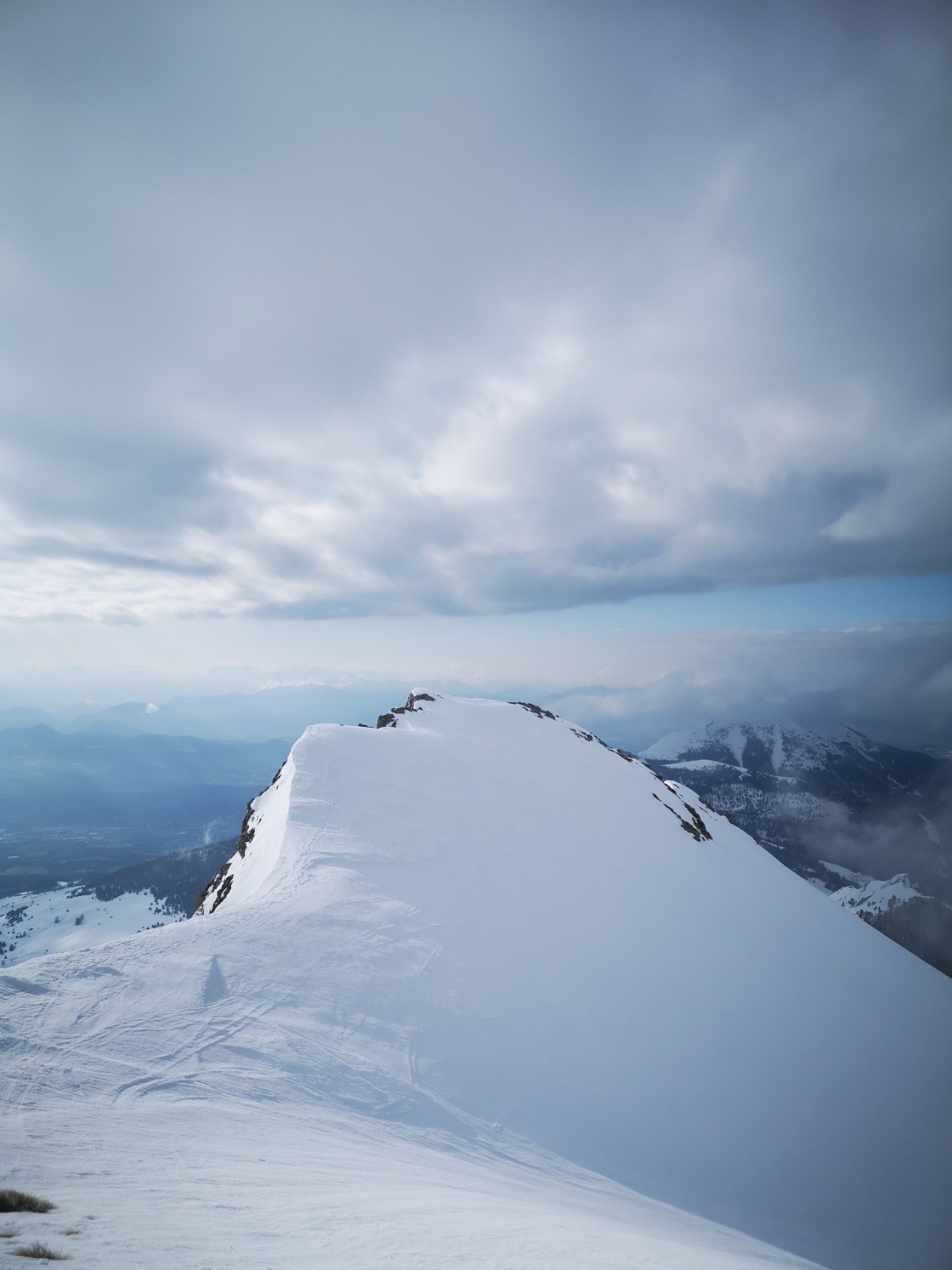 Un Pic un peu venté de S, direction la combe couloir de l'avalanche (comment la nommer autrement, si qq d'entre nous connaît le nom ancestral du lieu?) belle pente bien revenue déjà, ça enchaîne les jambes répondent au mieux...mais sous 1800 chgt brutal, ça mollit! Pas moi, quoique🤔. Retour en bord de piste pour reprendre de l'altitude loin du son des perches...