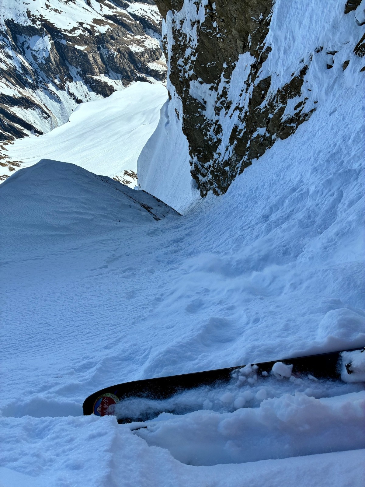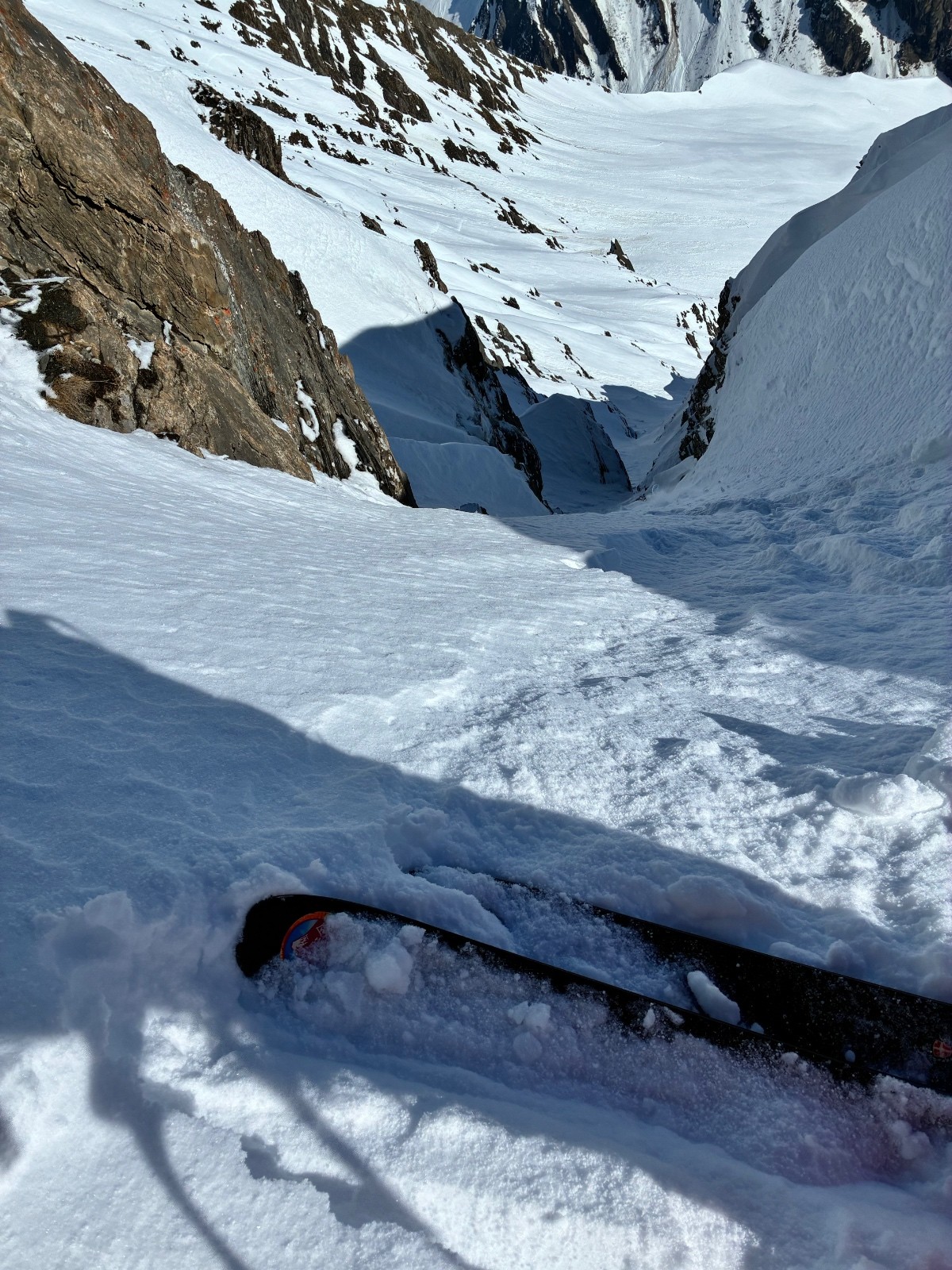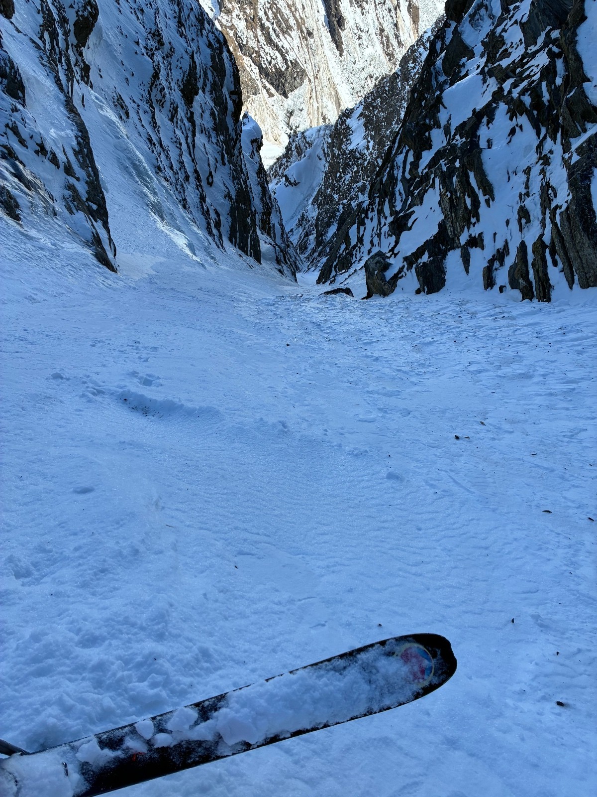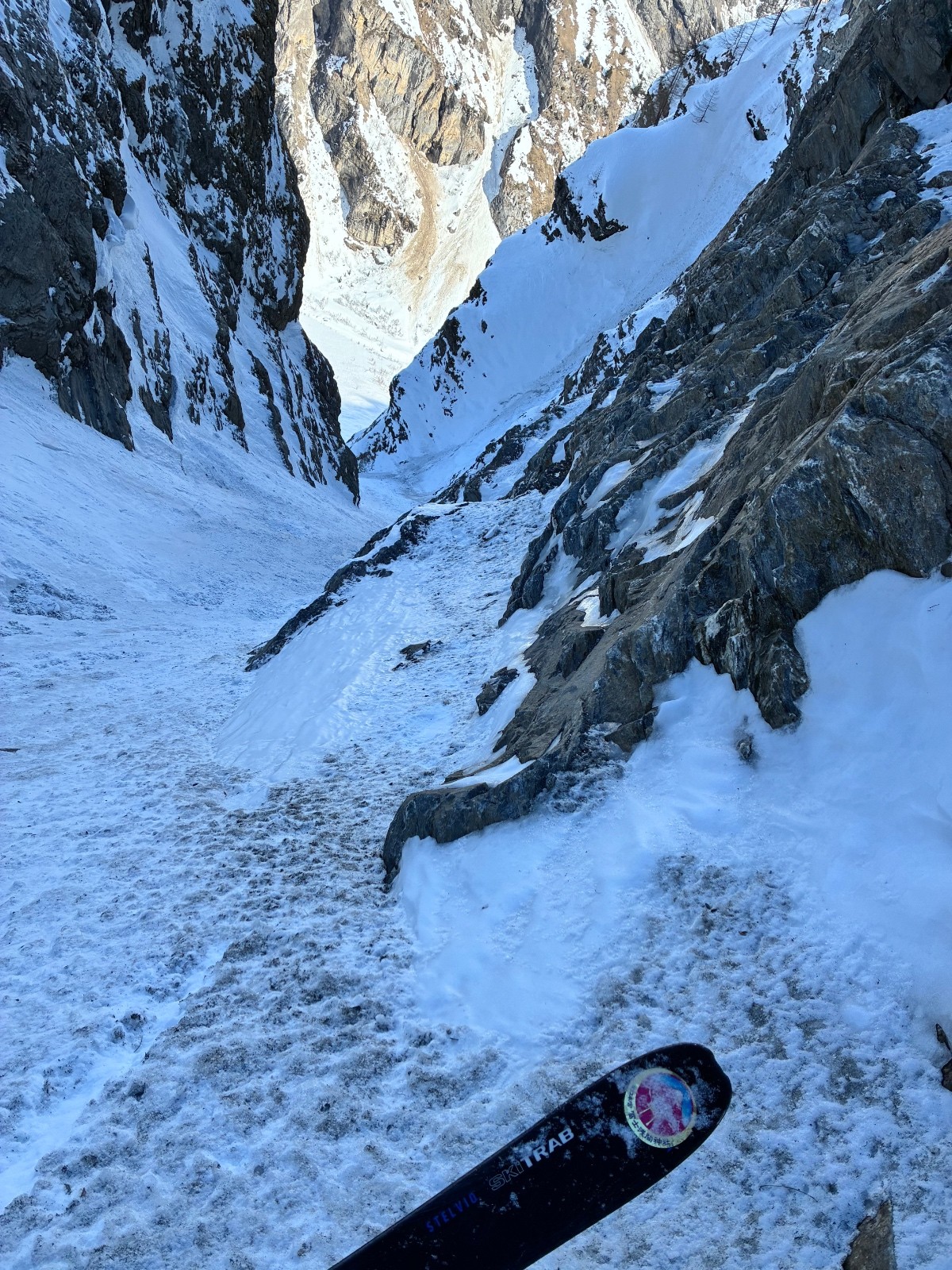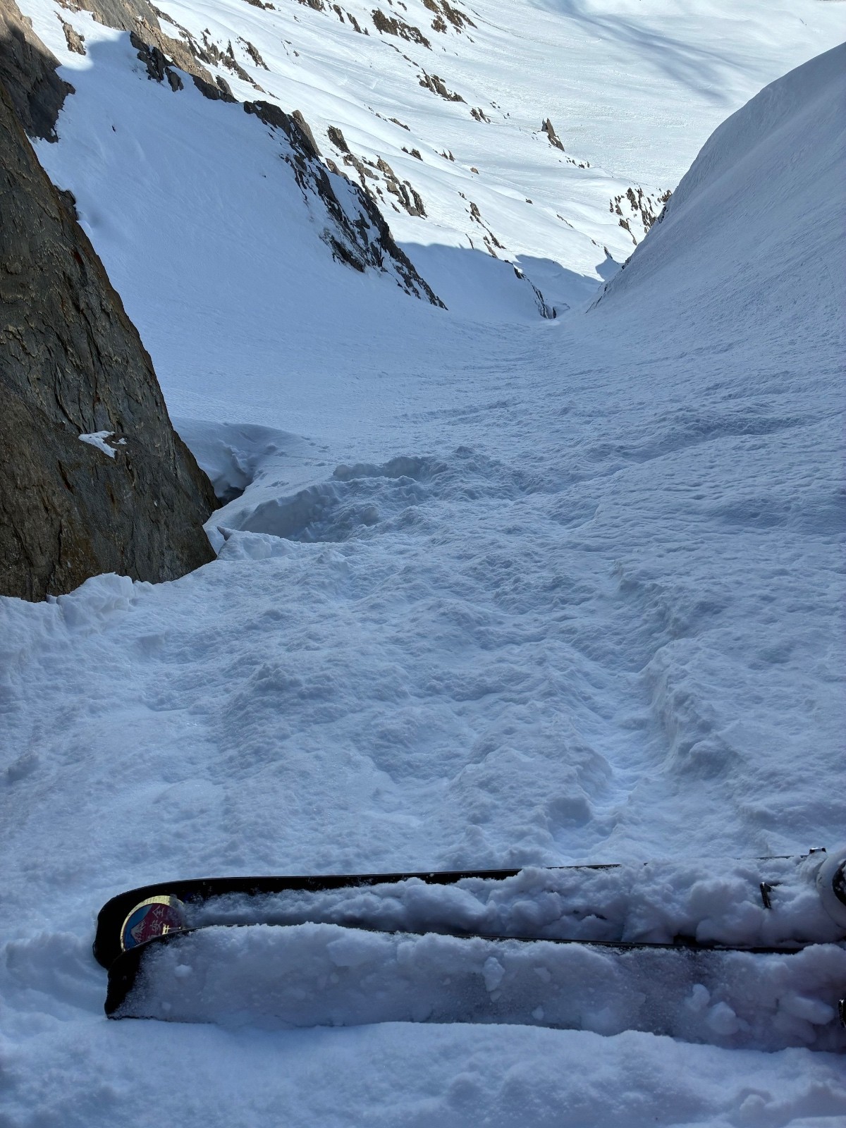 De tout aujourd’hui,premier couloir tout poudré ,une ou deux etroitures lissées par les 2 skieurs des jours précédents ,le départ était bien poudré puisque ils sont descendus à pied jusque au premier rapel (10m sangle enchâssée sur un bloc plus piton et maillon )ça se « saute bien « le ressaut fait 1 m50 ,je n ai pas sortis la corde mais j ai un peu ruiné mes lattes 😅lesquelles ne sont plus à ça prêt .un court ressault étroit où il faut bricoler avec les skis sur le cailloux ,avec mes 165 ça passait pas .