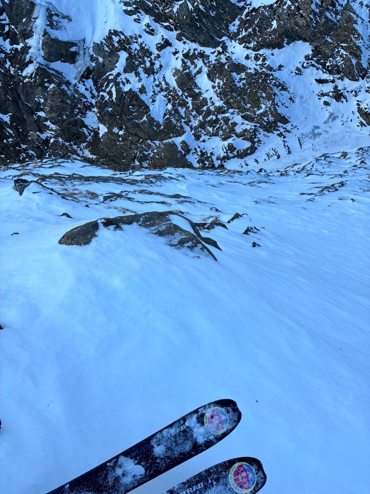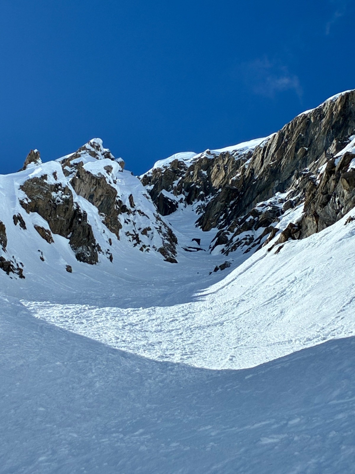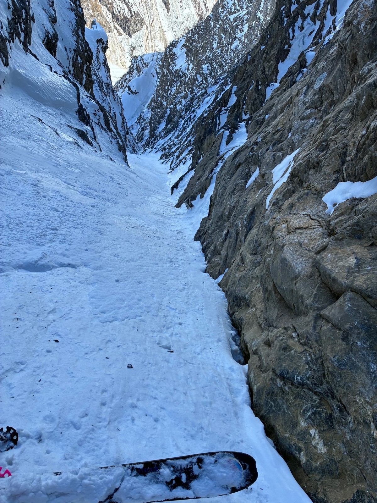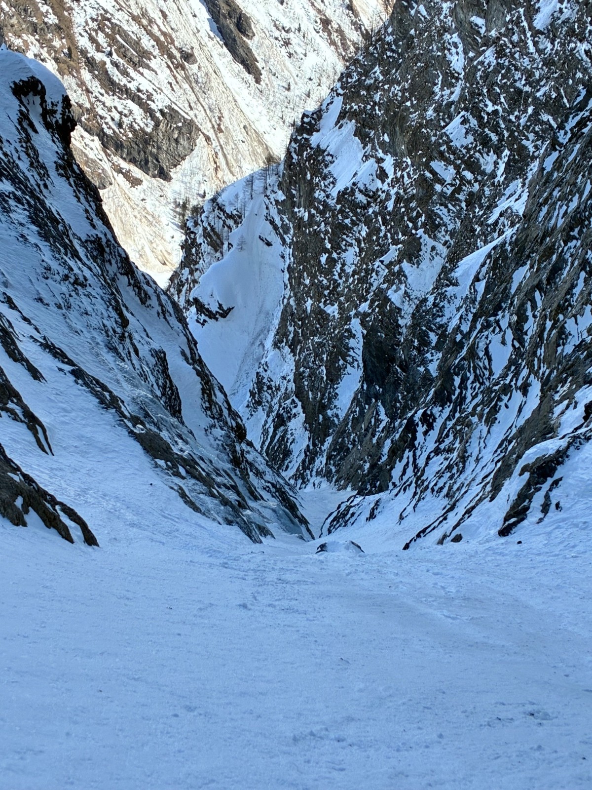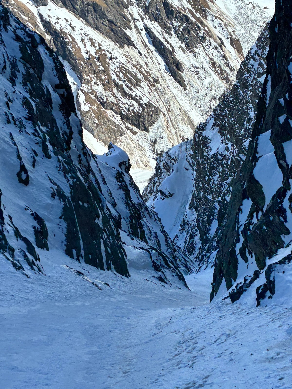 De tout aujourd’hui,premier couloir tout poudré ,une ou deux etroitures lissées par les 2 skieurs des jours précédents ,le départ était bien poudré puisque ils sont descendus à pied jusque au premier rapel (10m sangle enchâssée sur un bloc plus piton et maillon )ça se « saute bien « le ressaut fait 1 m50 ,je n ai pas sortis la corde mais j ai un peu ruiné mes lattes 😅lesquelles ne sont plus à ça prêt .un court ressault étroit où il faut bricoler avec les skis sur le cailloux ,avec mes 165 ça passait pas .