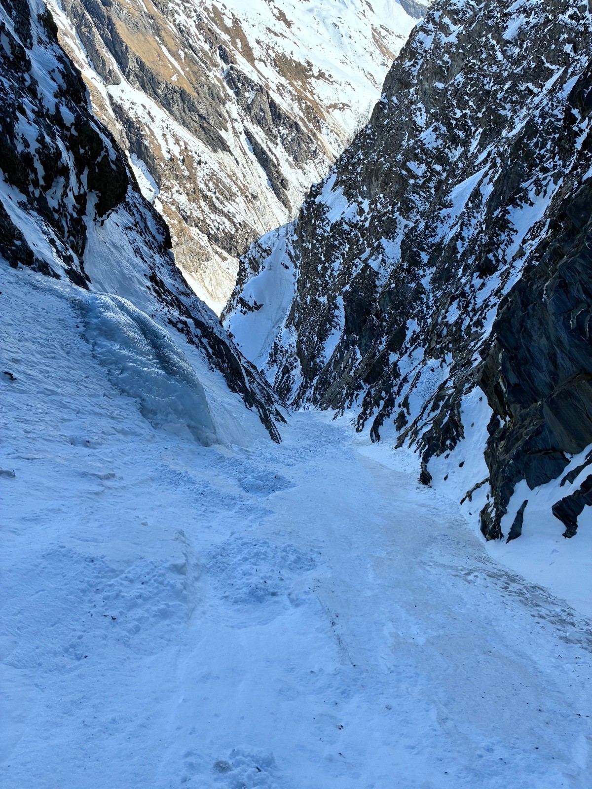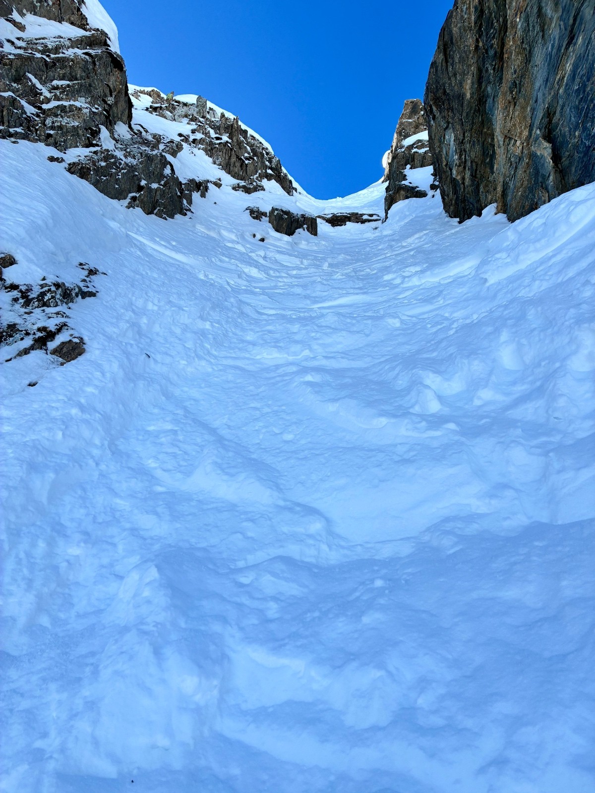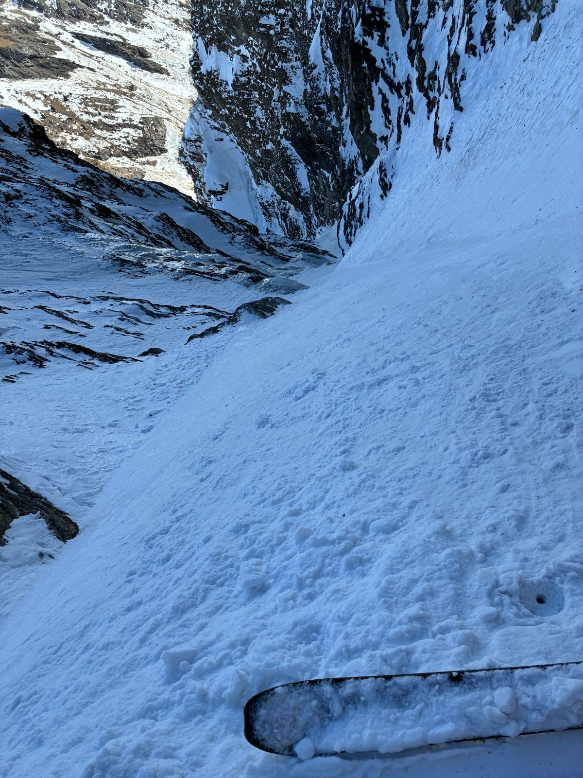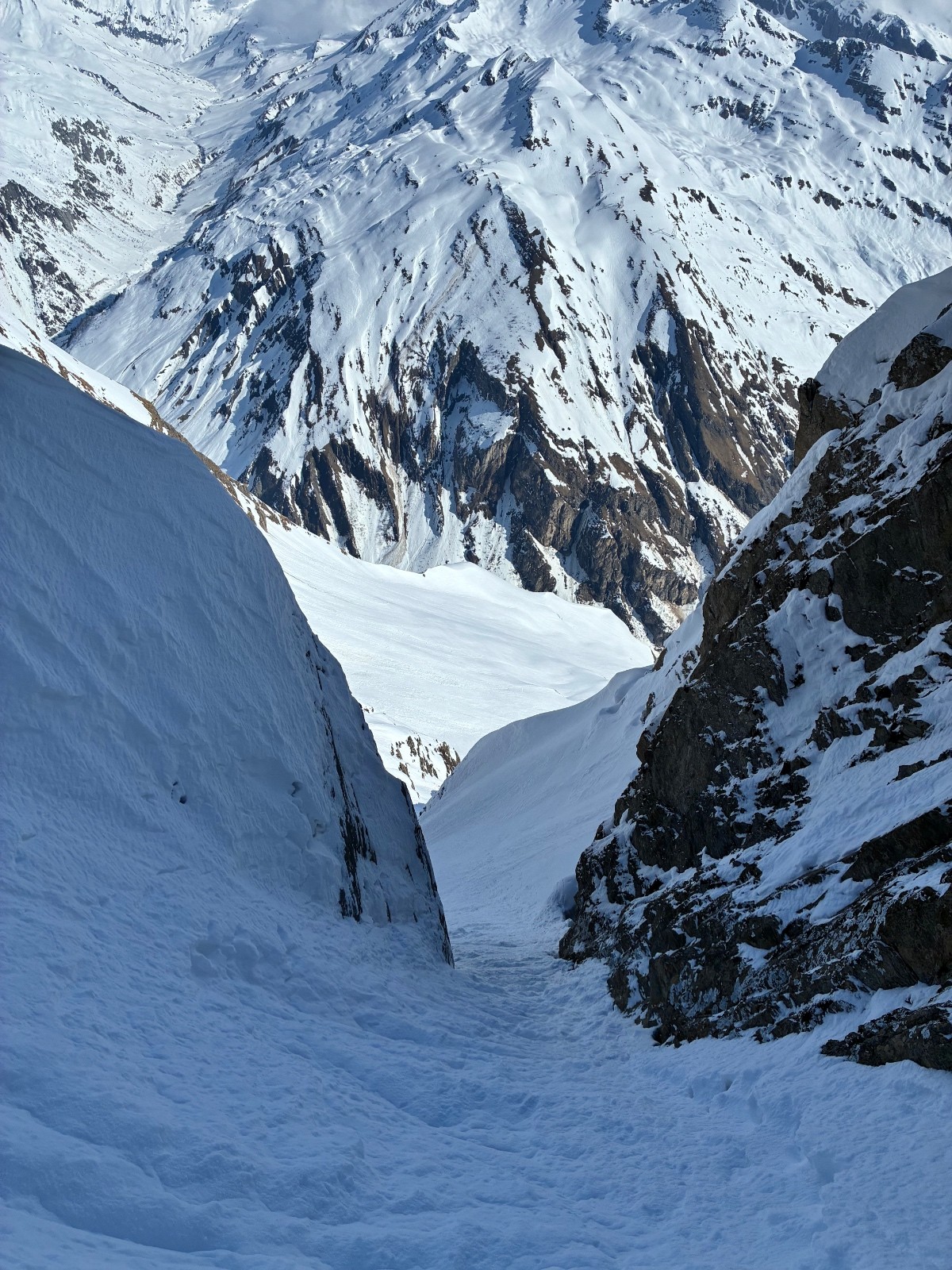 De tout aujourd’hui,premier couloir tout poudré ,une ou deux etroitures lissées par les 2 skieurs des jours précédents ,le départ était bien poudré puisque ils sont descendus à pied jusque au premier rapel (10m sangle enchâssée sur un bloc plus piton et maillon )ça se « saute bien « le ressaut fait 1 m50 ,je n ai pas sortis la corde mais j ai un peu ruiné mes lattes 😅lesquelles ne sont plus à ça prêt .un court ressault étroit où il faut bricoler avec les skis sur le cailloux ,avec mes 165 ça passait pas .