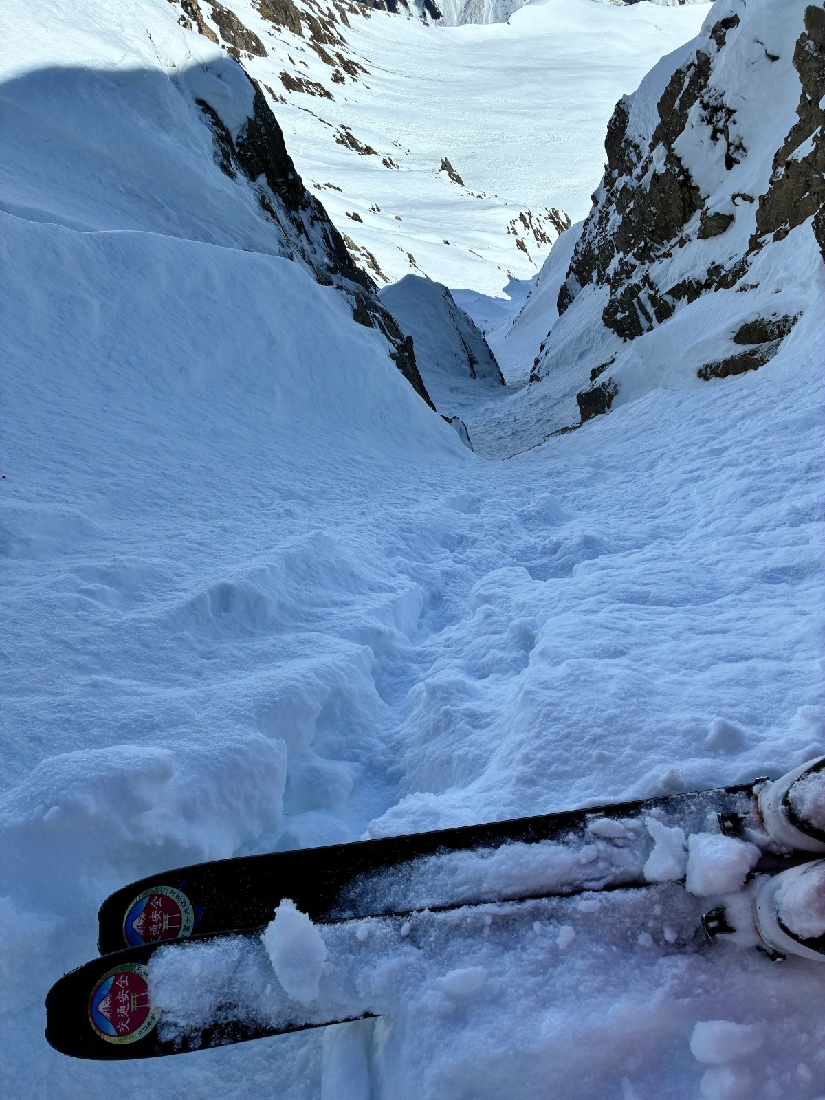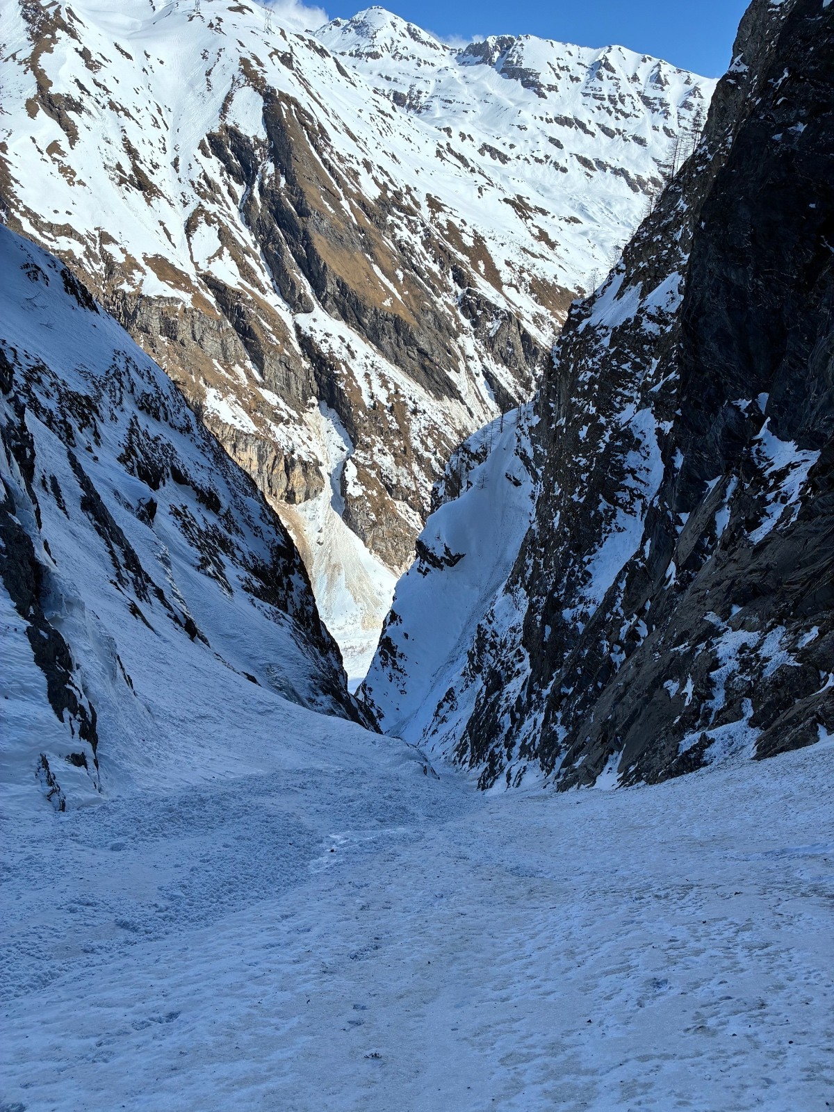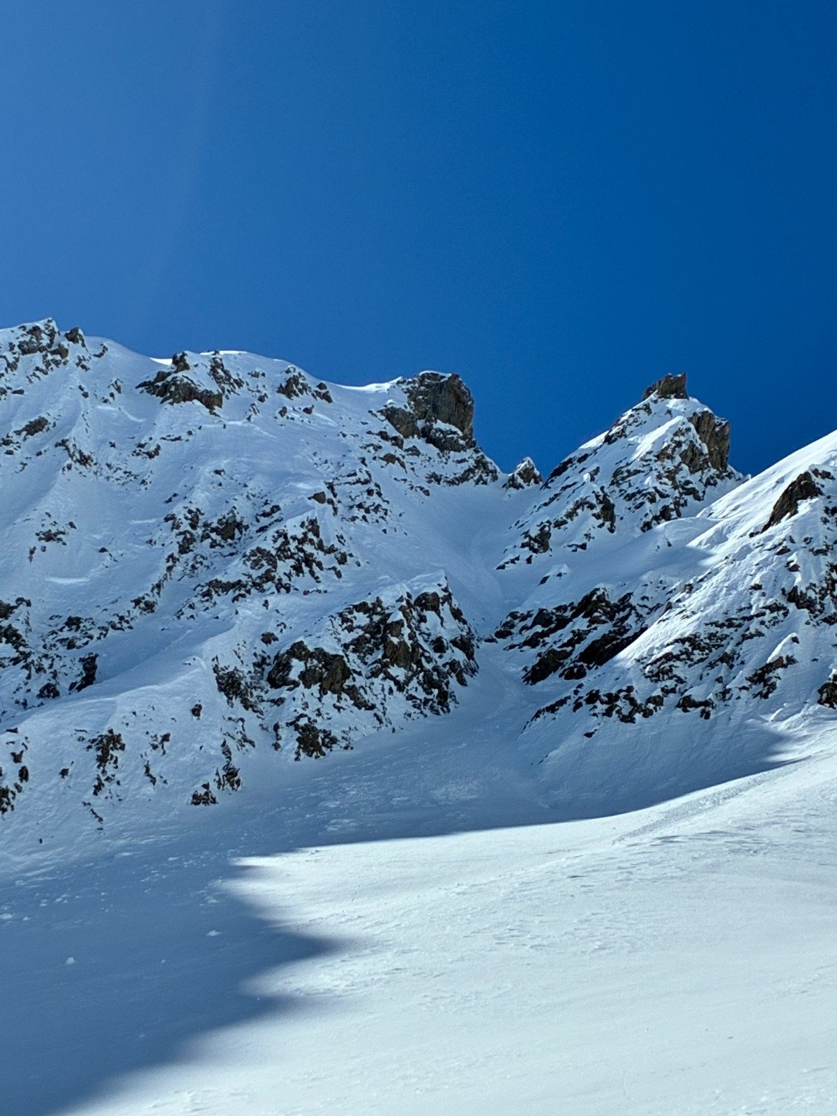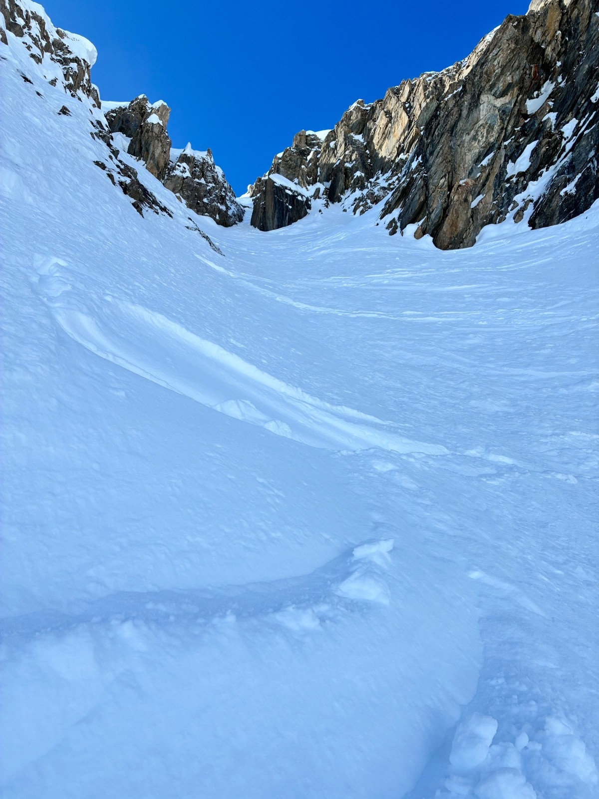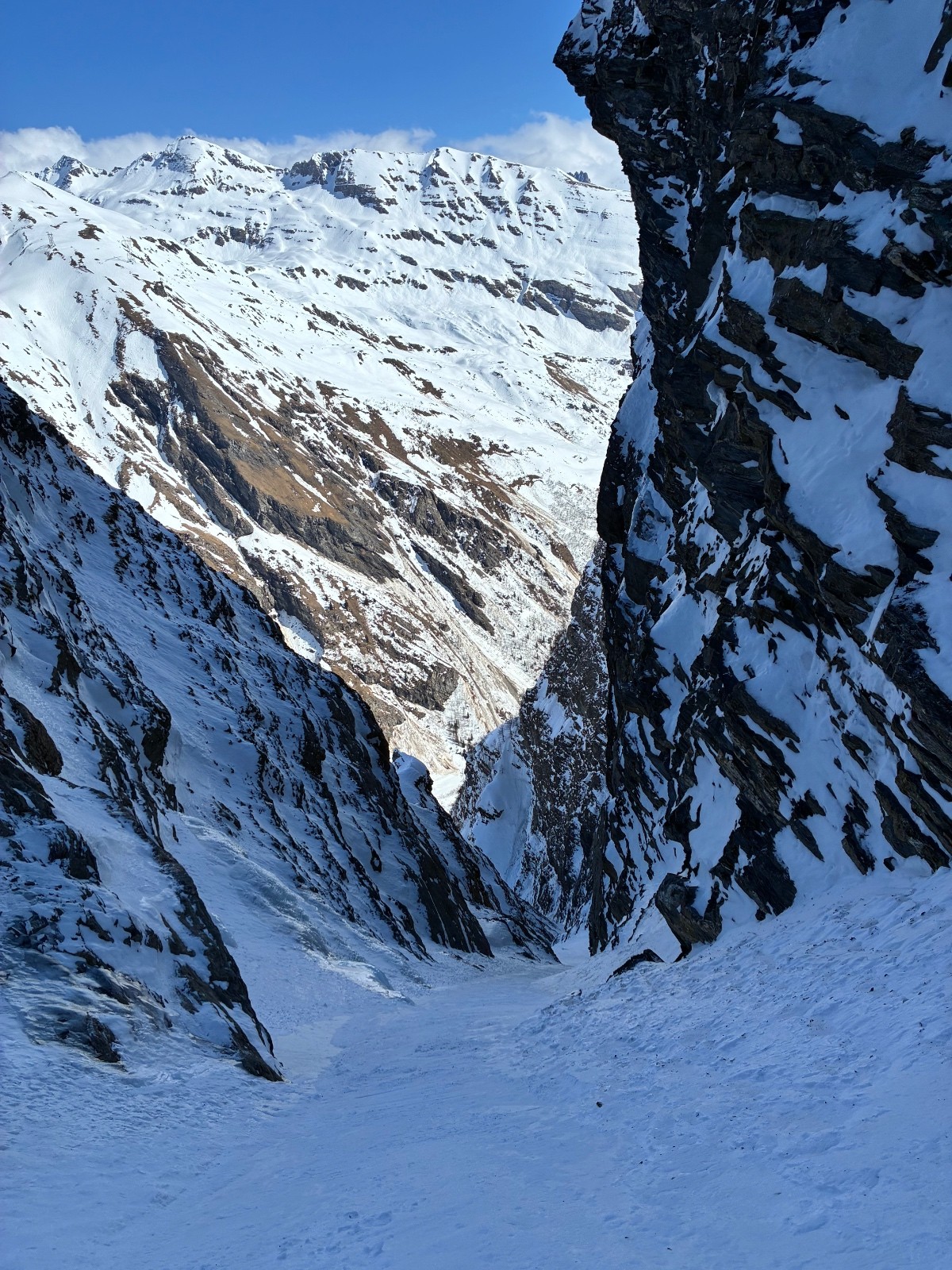 De tout aujourd’hui,premier couloir tout poudré ,une ou deux etroitures lissées par les 2 skieurs des jours précédents ,le départ était bien poudré puisque ils sont descendus à pied jusque au premier rapel (10m sangle enchâssée sur un bloc plus piton et maillon )ça se « saute bien « le ressaut fait 1 m50 ,je n ai pas sortis la corde mais j ai un peu ruiné mes lattes 😅lesquelles ne sont plus à ça prêt .un court ressault étroit où il faut bricoler avec les skis sur le cailloux ,avec mes 165 ça passait pas .