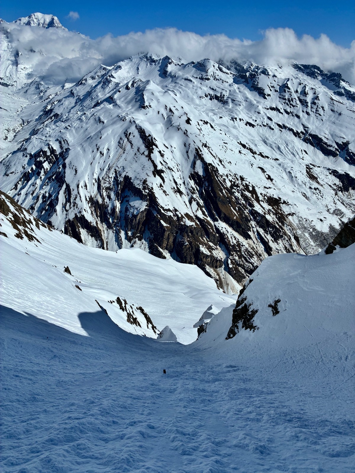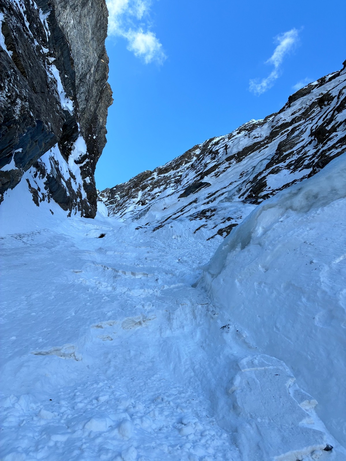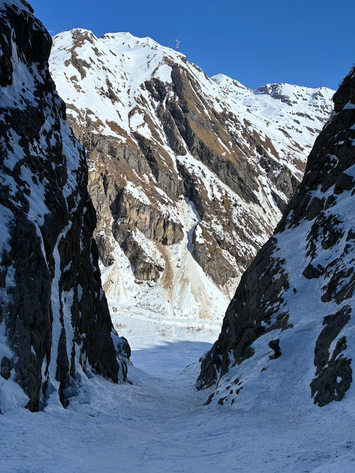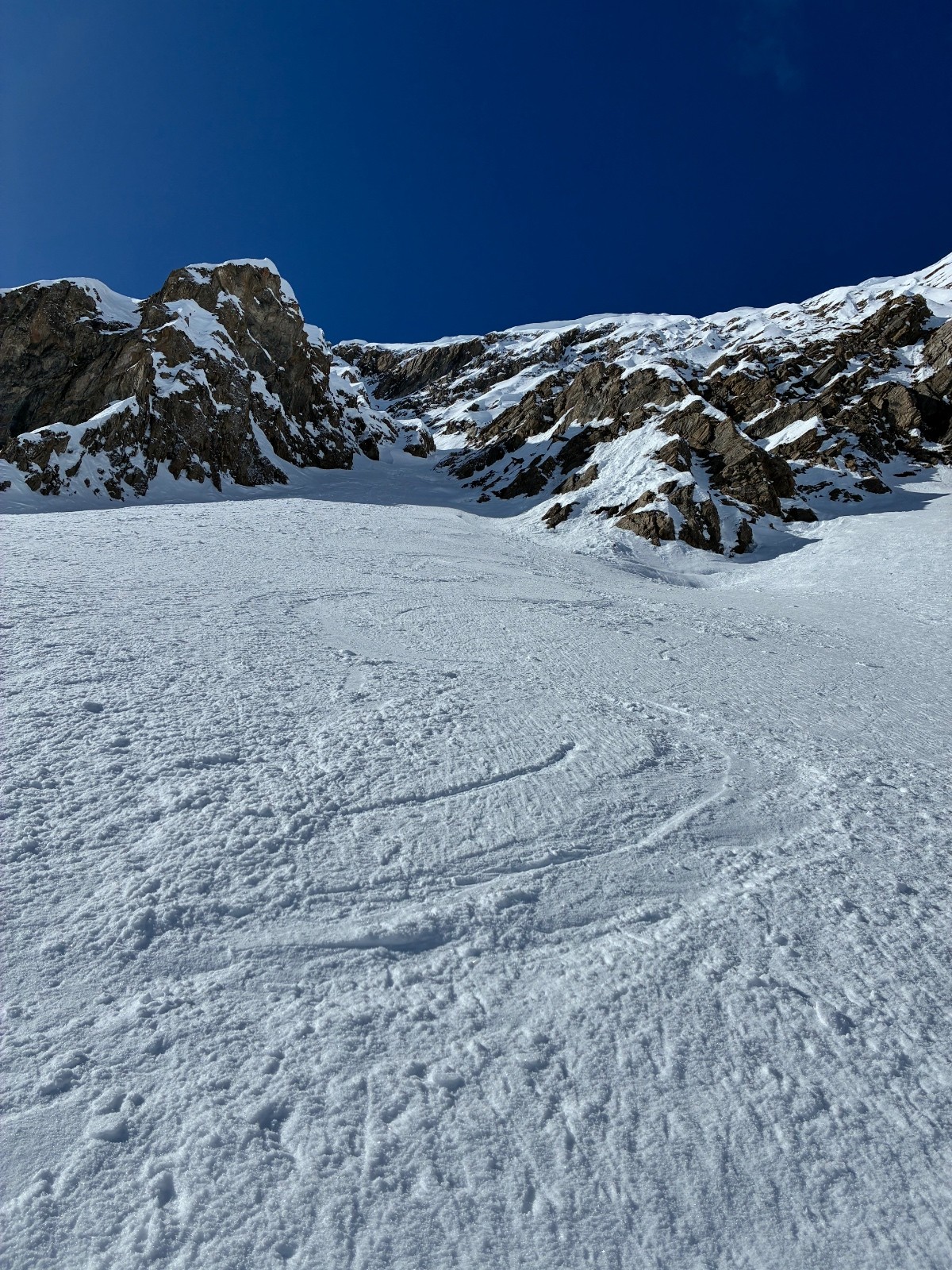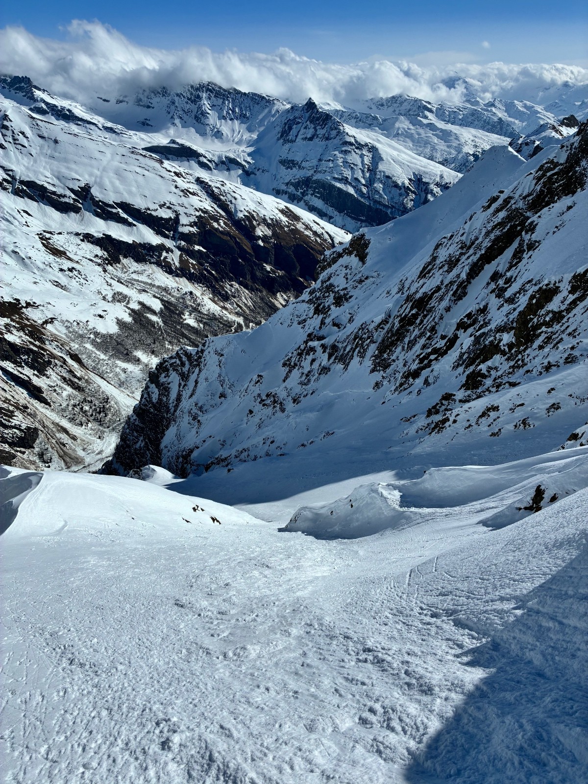 De tout aujourd’hui,premier couloir tout poudré ,une ou deux etroitures lissées par les 2 skieurs des jours précédents ,le départ était bien poudré puisque ils sont descendus à pied jusque au premier rapel (10m sangle enchâssée sur un bloc plus piton et maillon )ça se « saute bien « le ressaut fait 1 m50 ,je n ai pas sortis la corde mais j ai un peu ruiné mes lattes 😅lesquelles ne sont plus à ça prêt .un court ressault étroit où il faut bricoler avec les skis sur le cailloux ,avec mes 165 ça passait pas .