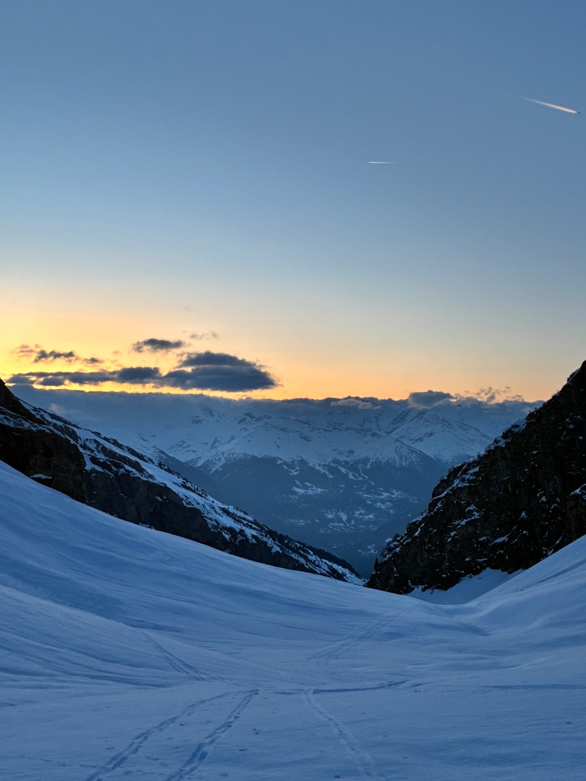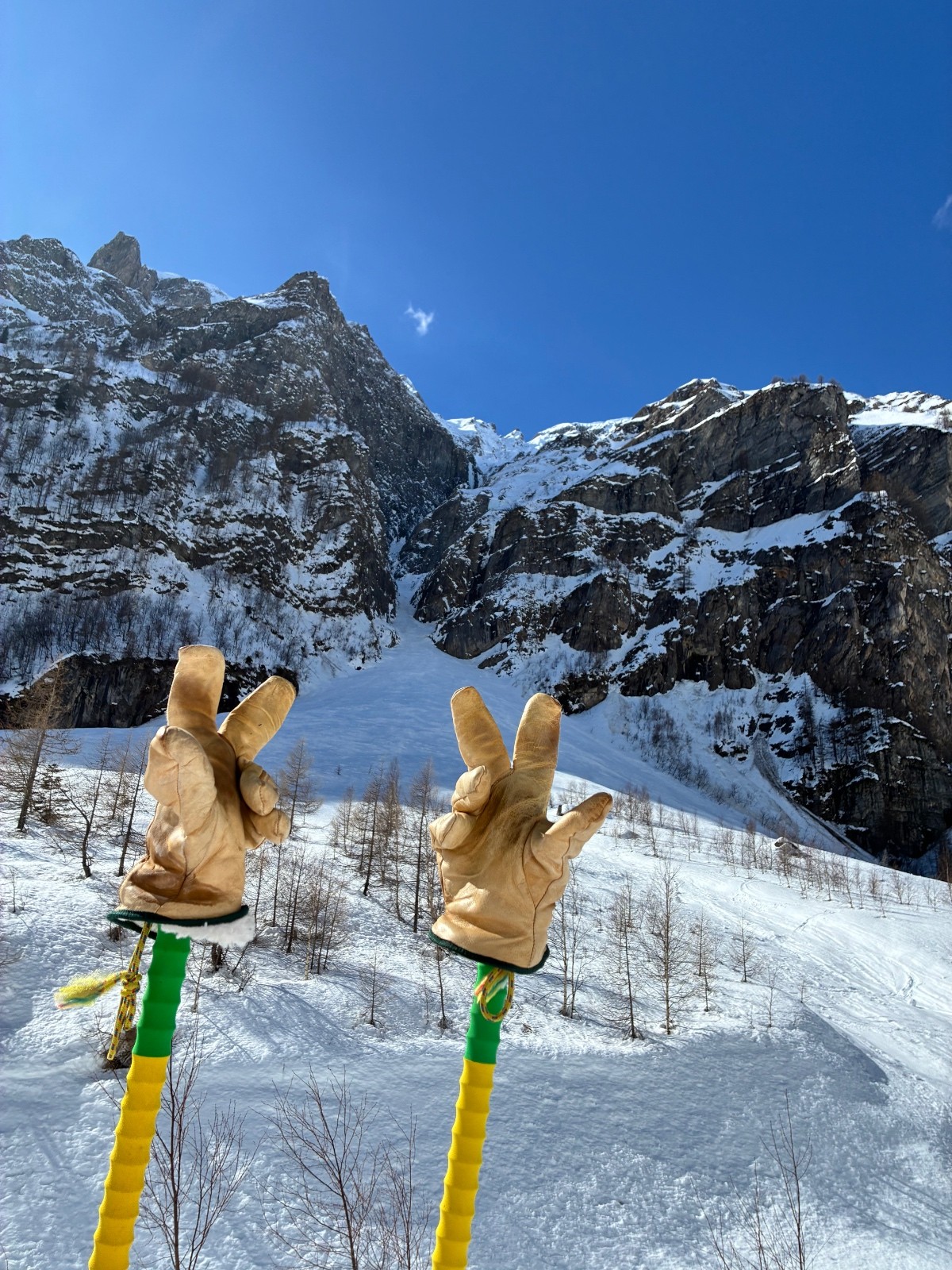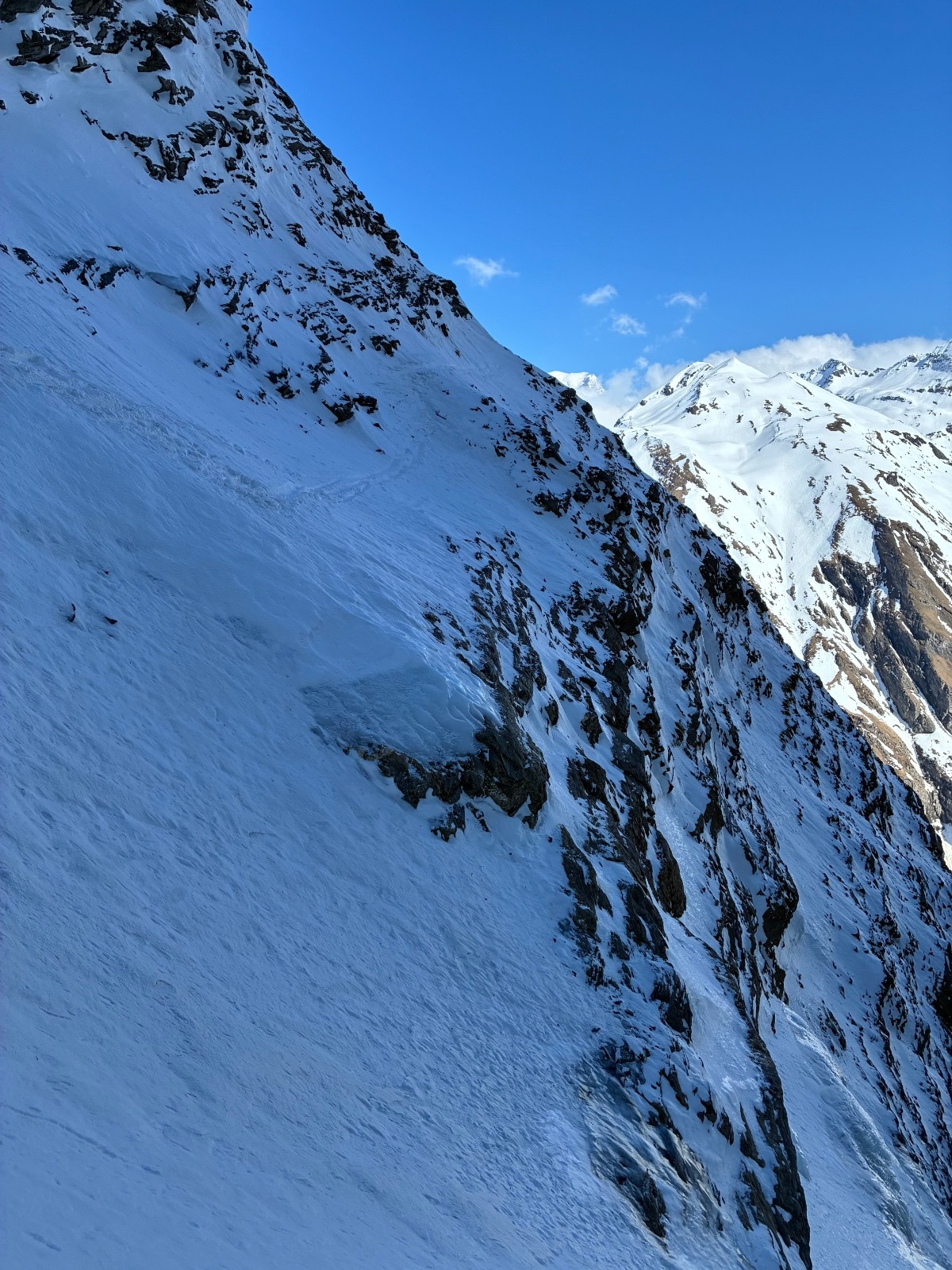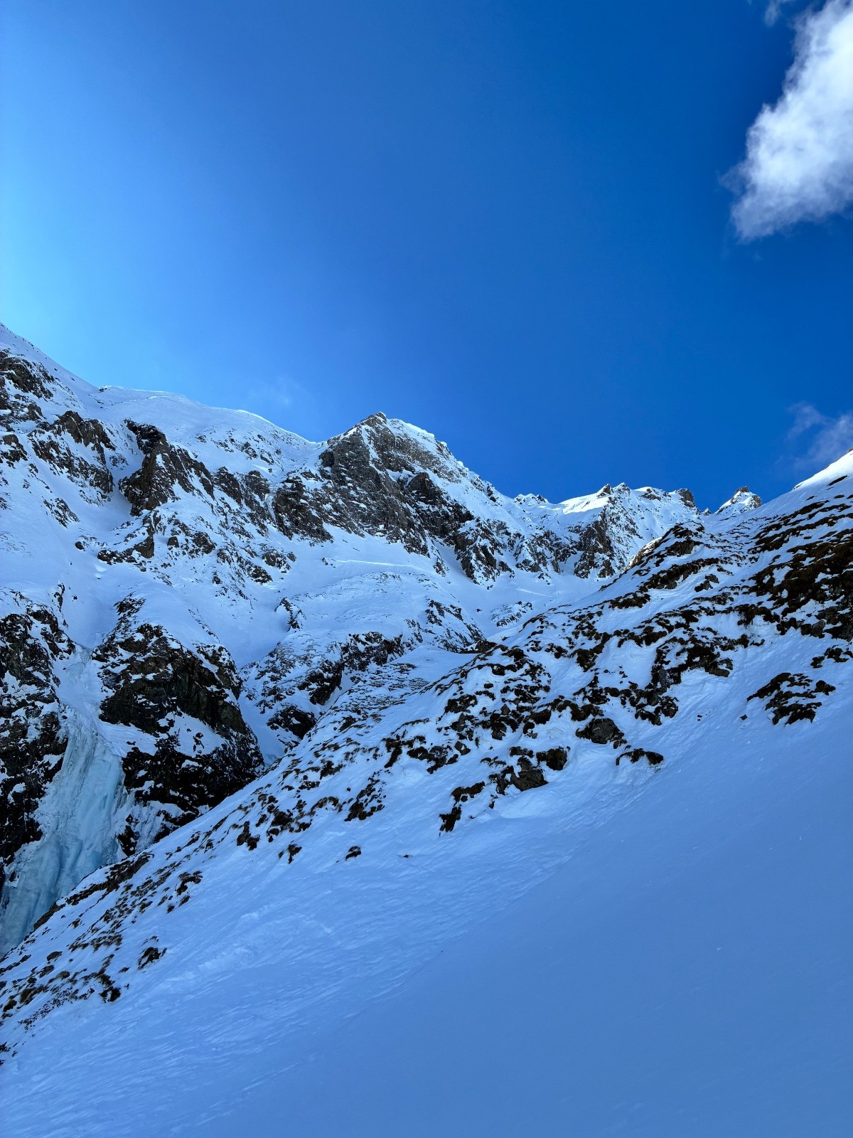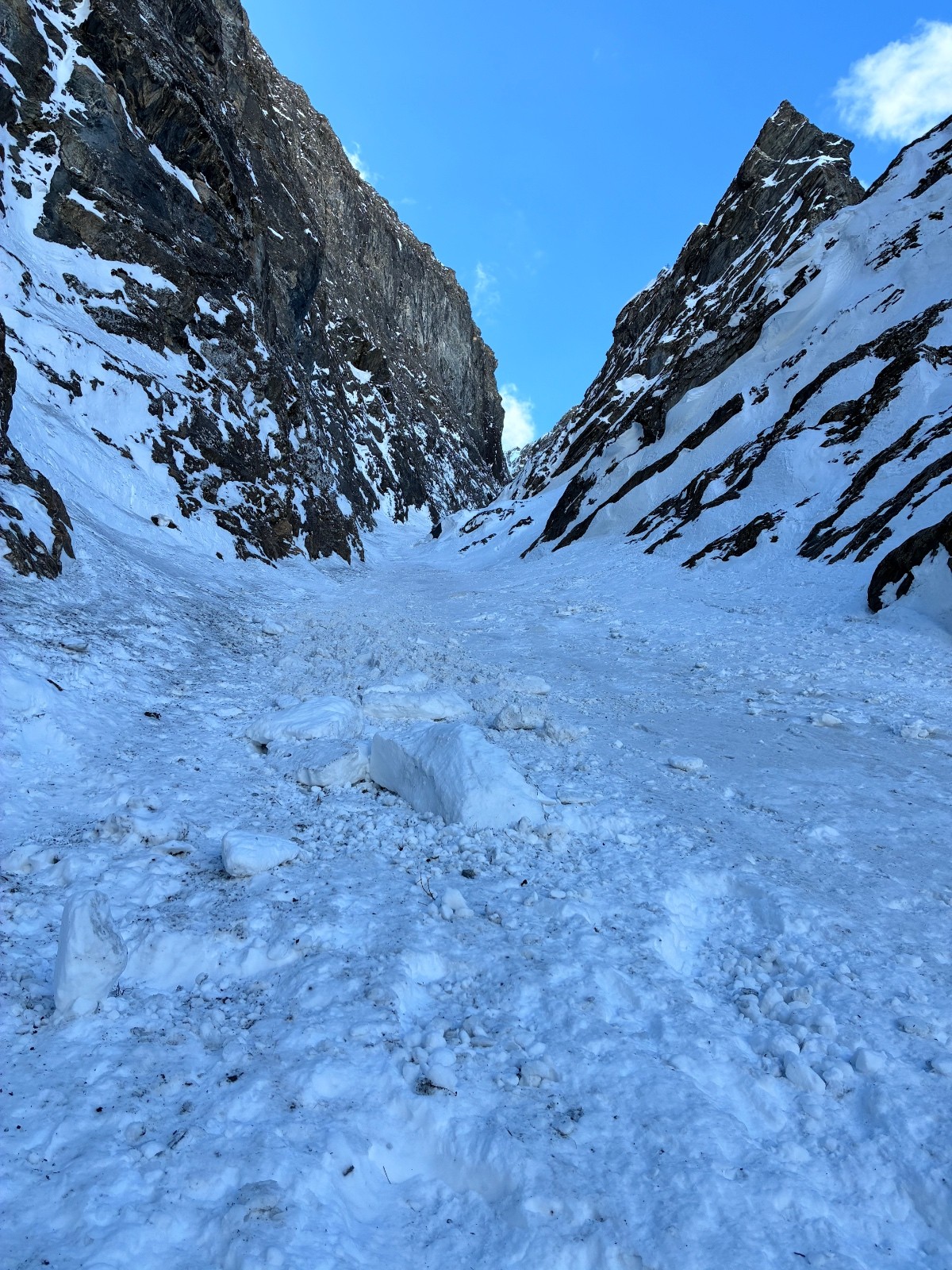 De tout aujourd’hui,premier couloir tout poudré ,une ou deux etroitures lissées par les 2 skieurs des jours précédents ,le départ était bien poudré puisque ils sont descendus à pied jusque au premier rapel (10m sangle enchâssée sur un bloc plus piton et maillon )ça se « saute bien « le ressaut fait 1 m50 ,je n ai pas sortis la corde mais j ai un peu ruiné mes lattes 😅lesquelles ne sont plus à ça prêt .un court ressault étroit où il faut bricoler avec les skis sur le cailloux ,avec mes 165 ça passait pas .