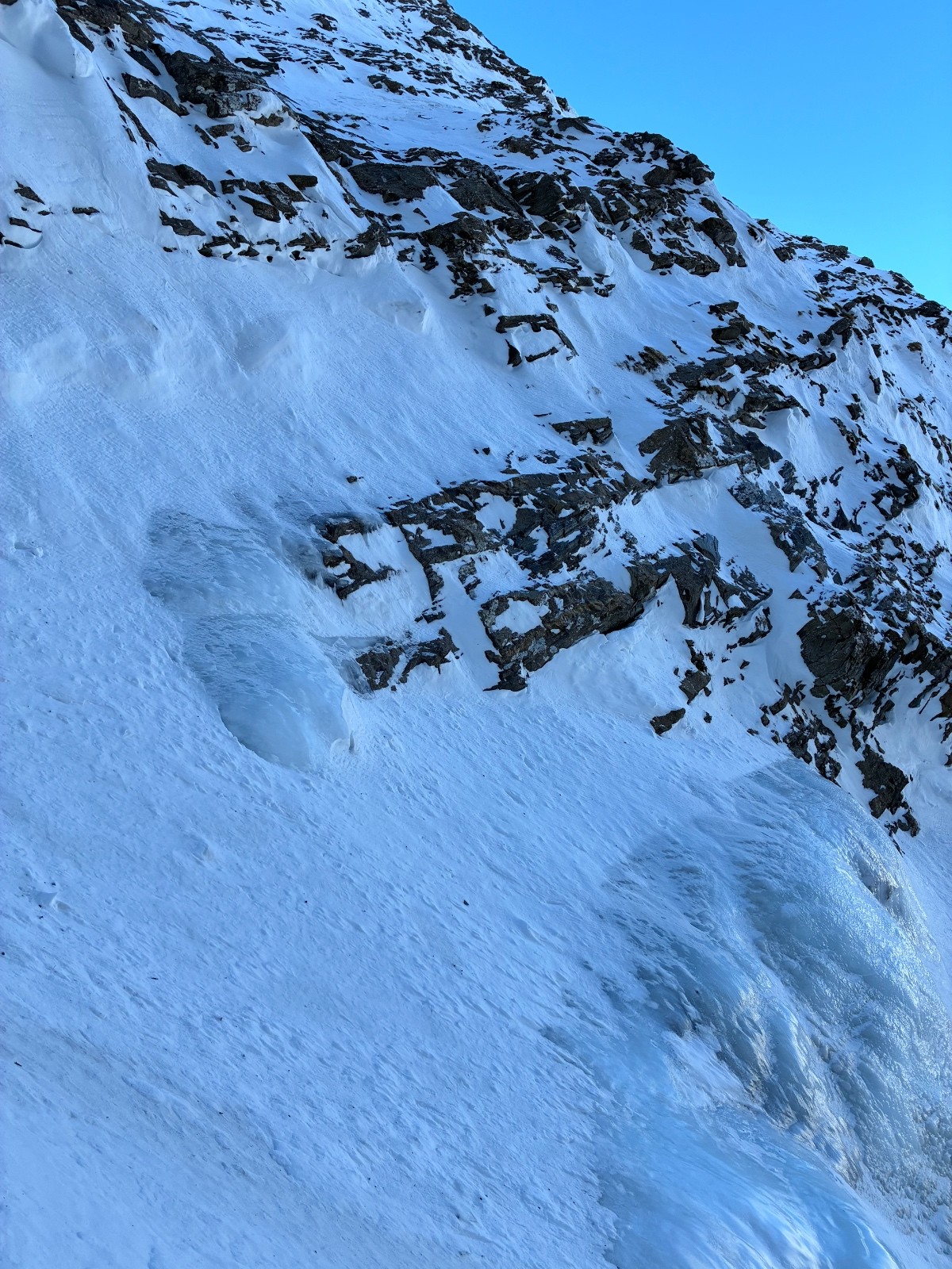 La banquette et le contournement de la barre sur moquette bien agréable à 11h ,la passage pour rejoindre l entonnoir en neige béton commençant à s en glacer (si pas de chutes de neige prochainement et si pas trop à l aise et passage en crampons une ou 2 broches seront utiles pour se sécuriser ,la c est pas extrême mais faut éviter de se la coller 🫣)