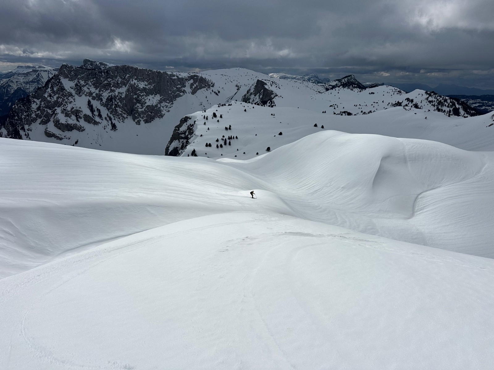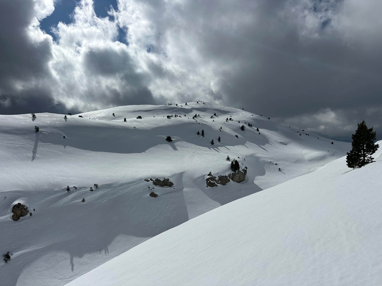 Conditions nivo et activité avalancheuse : neige dure à la montée. Ala descente : Dure sur le Petit Veymont. Decaillée à partir de 1950 m, puis moquette d’élite dans le ravin de Peyre rouge ( versant nord) , devenant de plus en plus molle. À nouveau dure bien decaillée dans le pré après l’accrobranche.