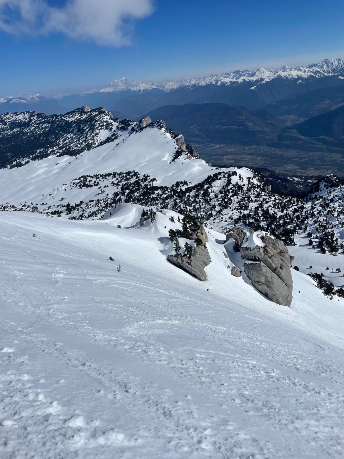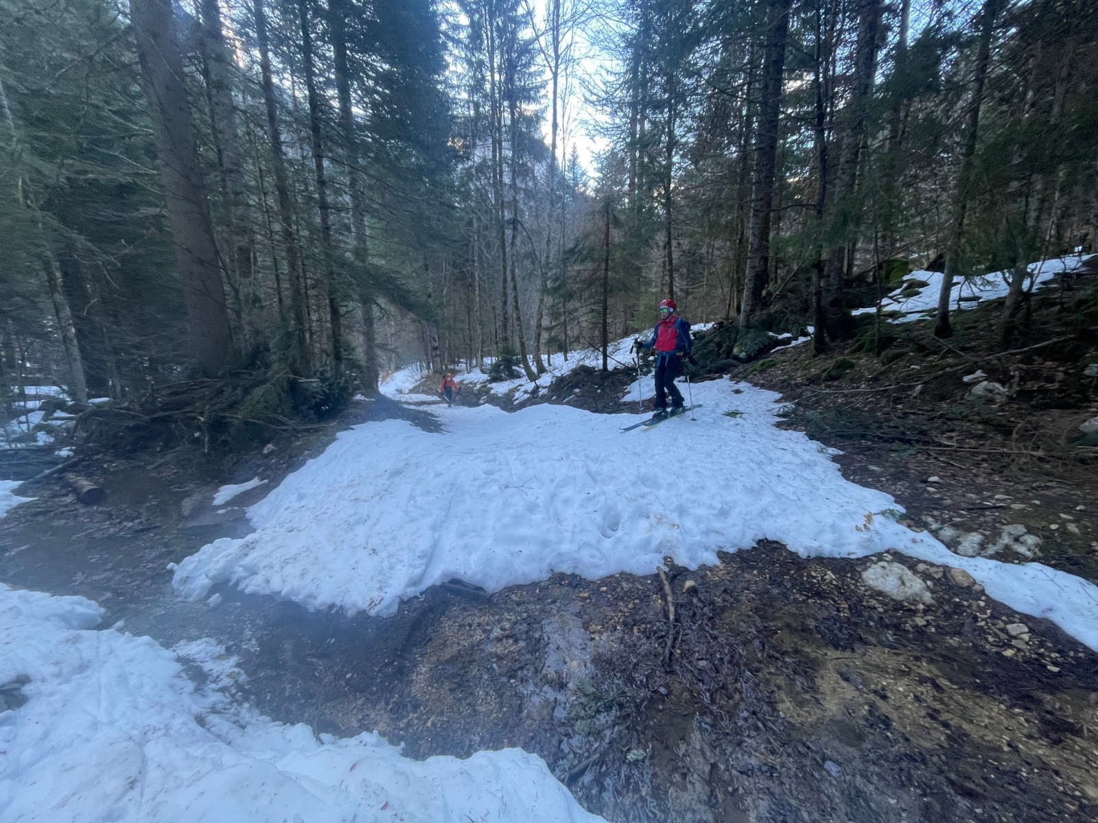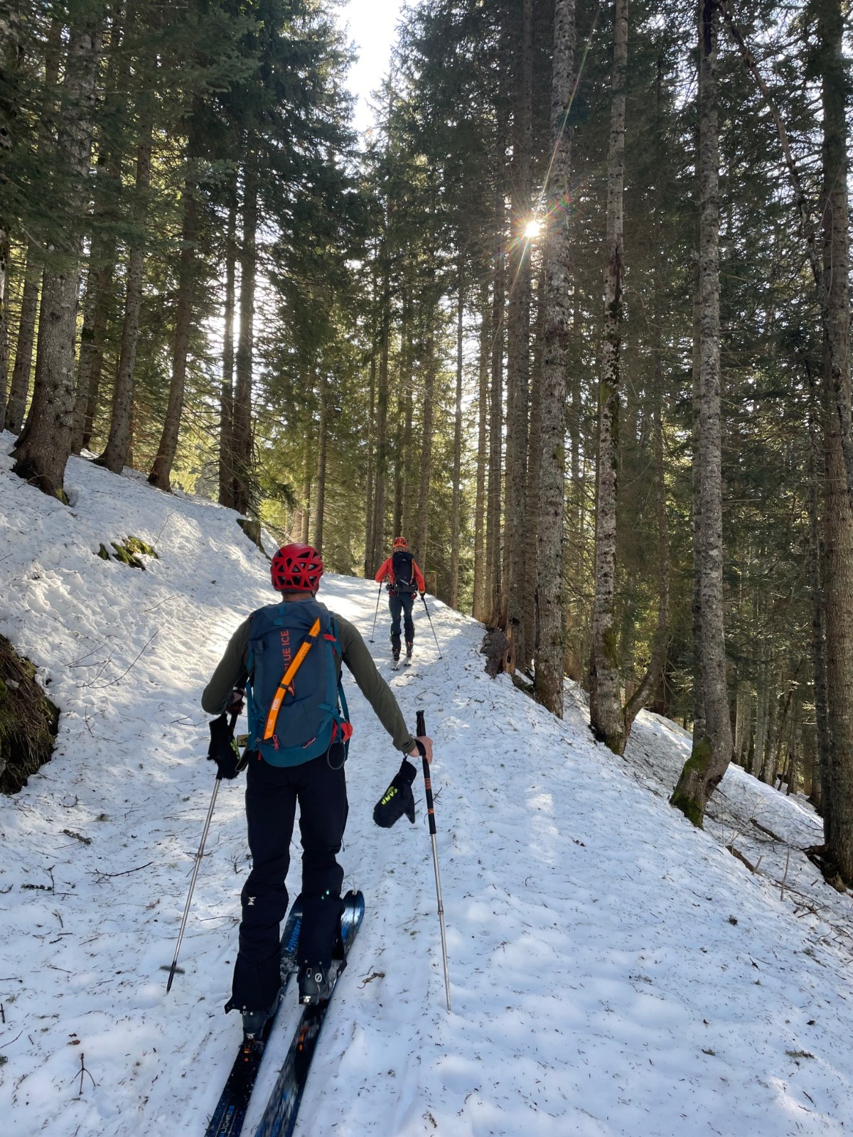 On s’offre une dernière superbe descente dans la prairie sous le couloir, avant un retour un peu sportif par la forêt jusqu’à la voiture sans déchaussage si on ose poser les lattes sur quelques mottes de terres caillouteuses…