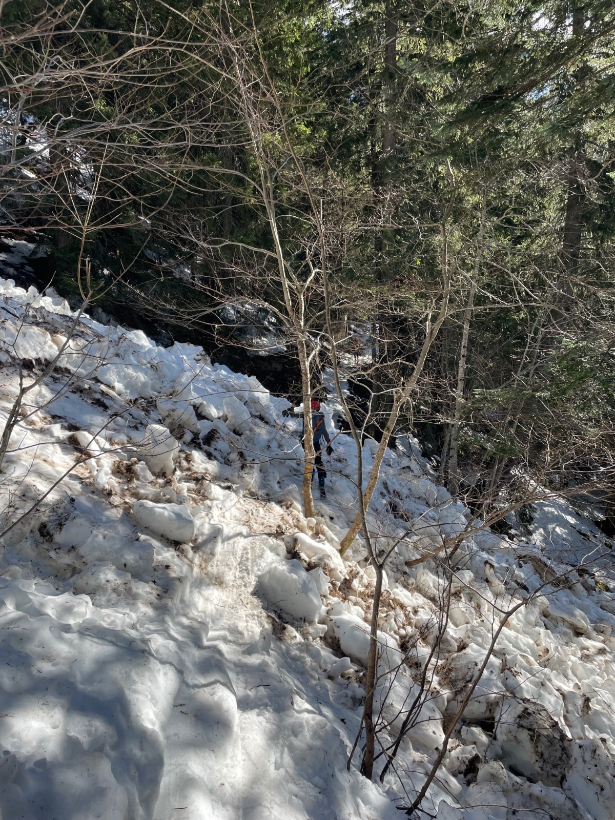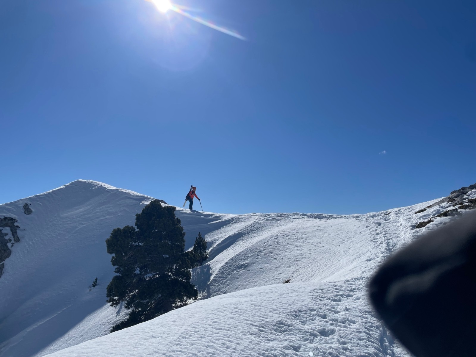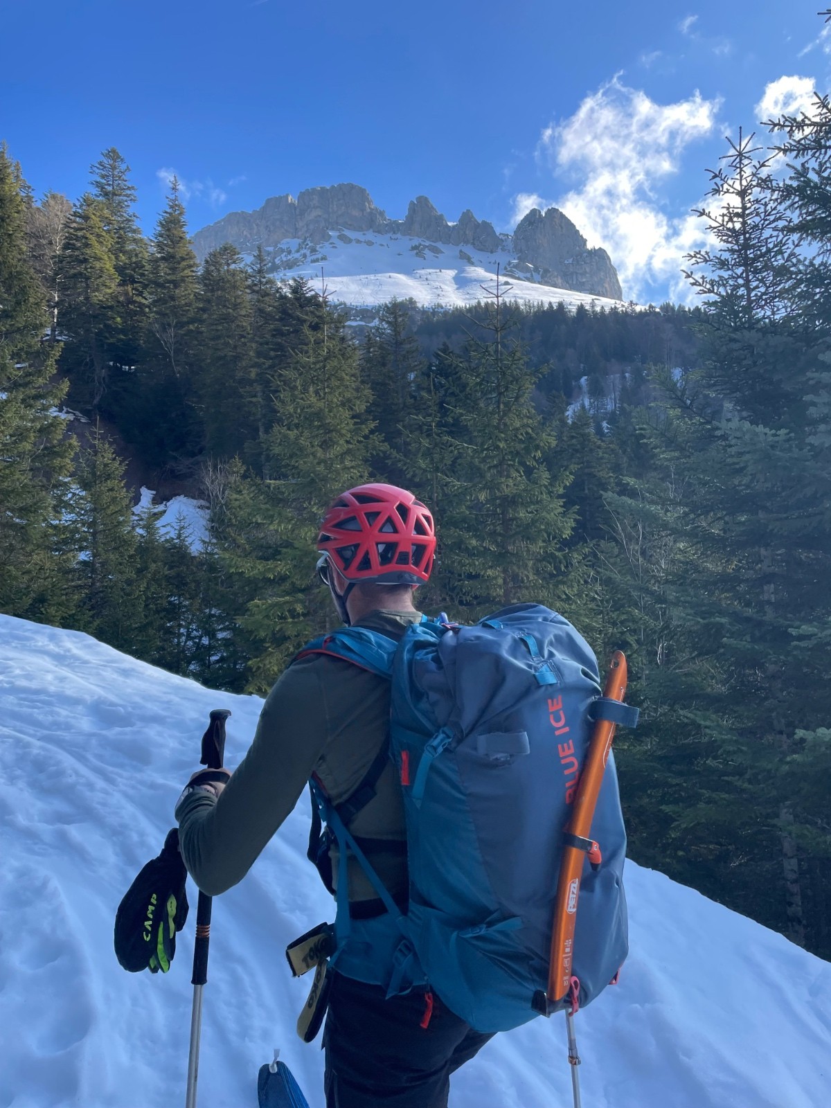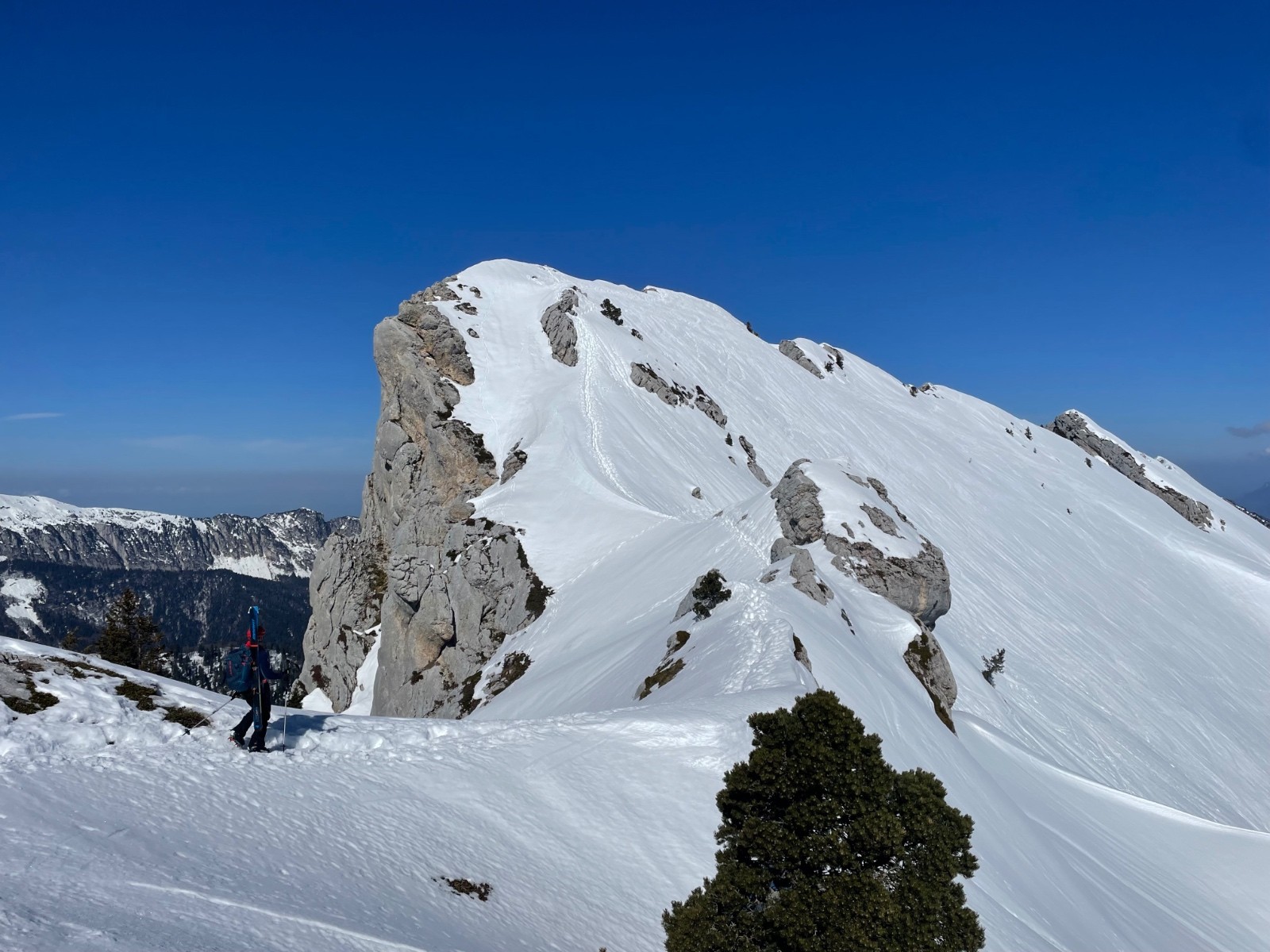 On s’offre une dernière superbe descente dans la prairie sous le couloir, avant un retour un peu sportif par la forêt jusqu’à la voiture sans déchaussage si on ose poser les lattes sur quelques mottes de terres caillouteuses…