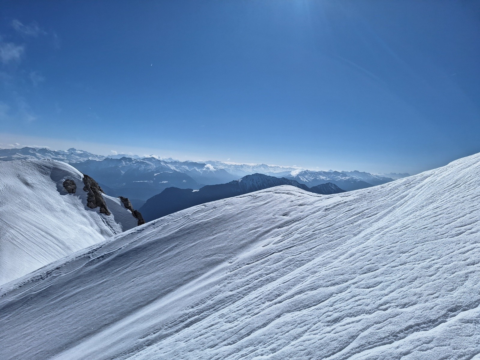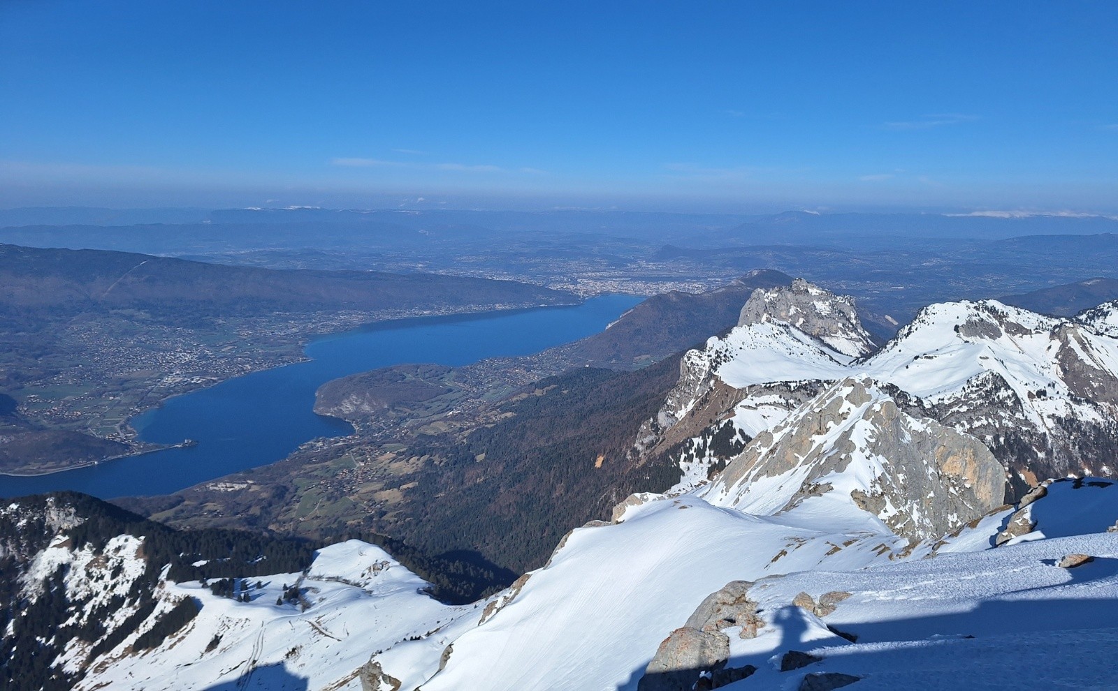 On met rapidement les crampons puis direction le sommet, histoire de profiter de la vue magnifique sur le Mont-blanc et le Lac d'Annecy! C'est vrai que le coin a de la gueule 😄