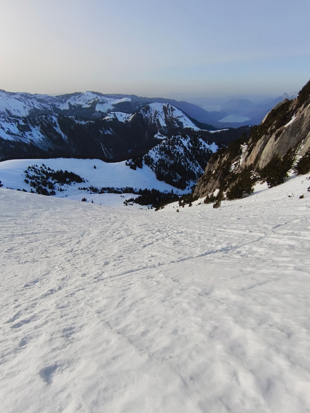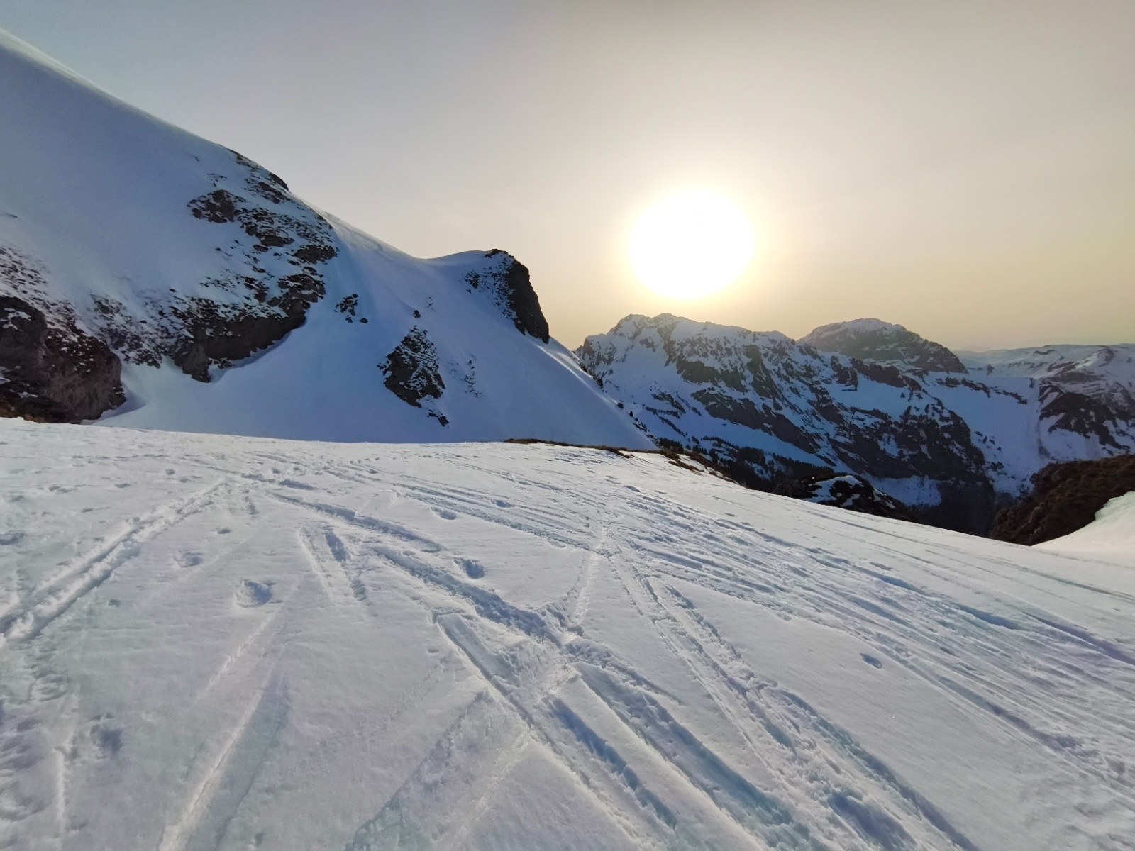 Un petite Sambuy rapide aftertaf, je traine pas trop pour espérer avoir encore du soleil à la descente dans la Linguale et éviter de descendre dans une neige pourrie. Pour la montée le soleil s'est déjà fait la malle, la neige redurcie très rapidement. Pas génant sur la piste, un peu plus glissant pour la partie finale, sans pour autant mettre les couteaux. Je retrouve le soleil au sommet et m'engage dans la Linguale. Elle est également au soleil couchant, ça sera moquette 5* jusqu'en bas du couloir. La sortie est bien remplie, et ça déroule encore moquette jusqu'à la forêt. Après... c'est fini, neige redurcie bien dégueu. Le chemin est lui aussi bien dégueu, défoncé par les traces de piétons. Un déchaussage sur quelques metres sinon ça arrive au parking ski au pieds sans toucher.