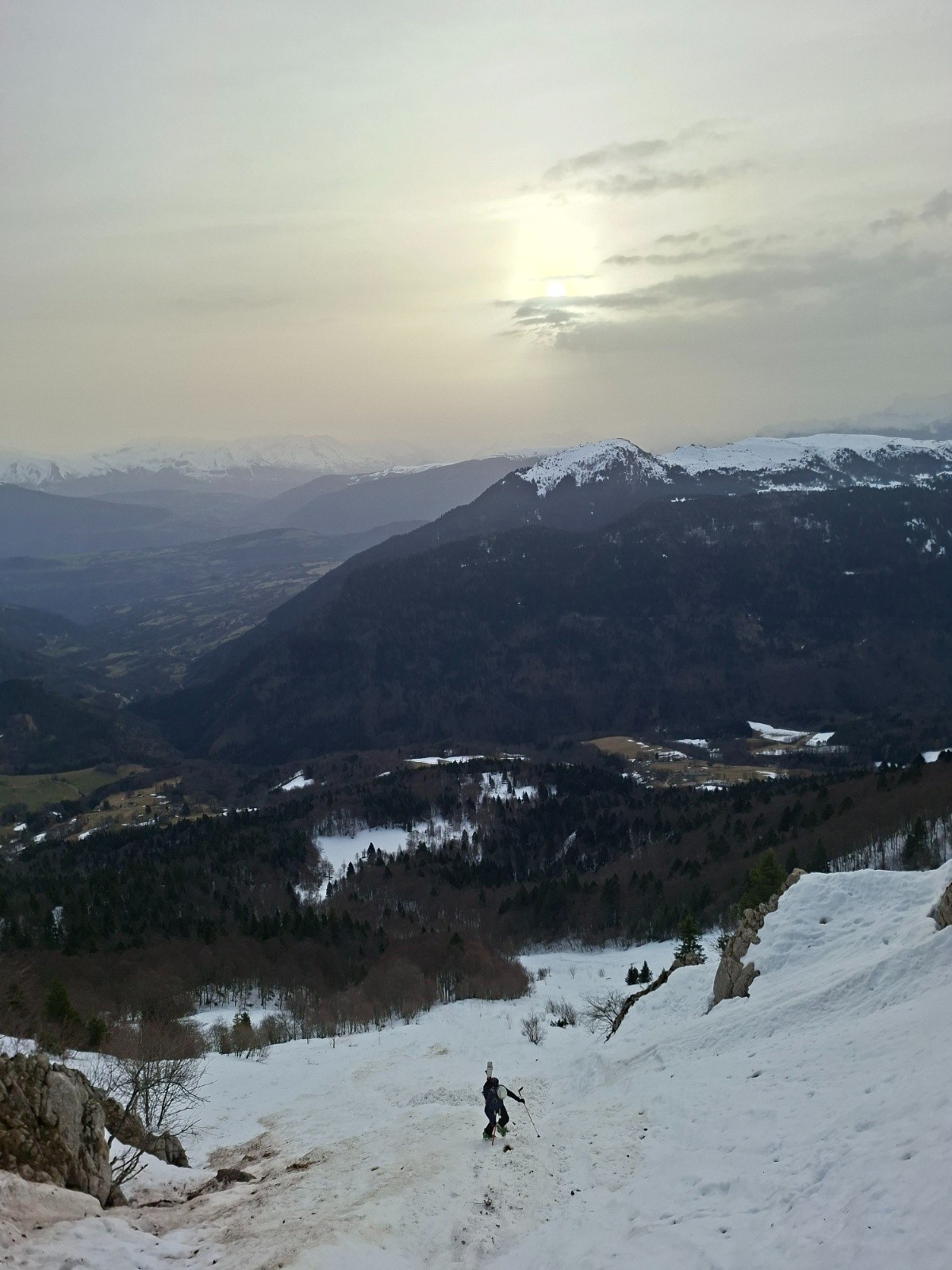 DEROBEE, la vue sur le taillefer et au-delà, la faute là encore au voile saharien qui s'est épaissi très fortement sur ces massifs tandis que le ciel bleu résistait encore sur le Vercors.