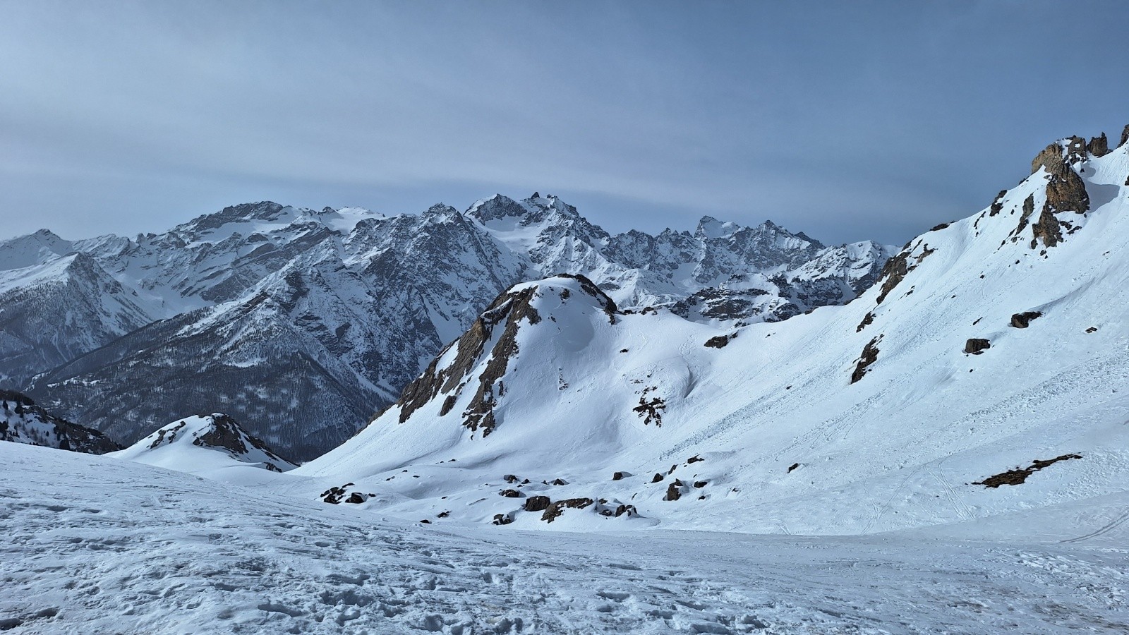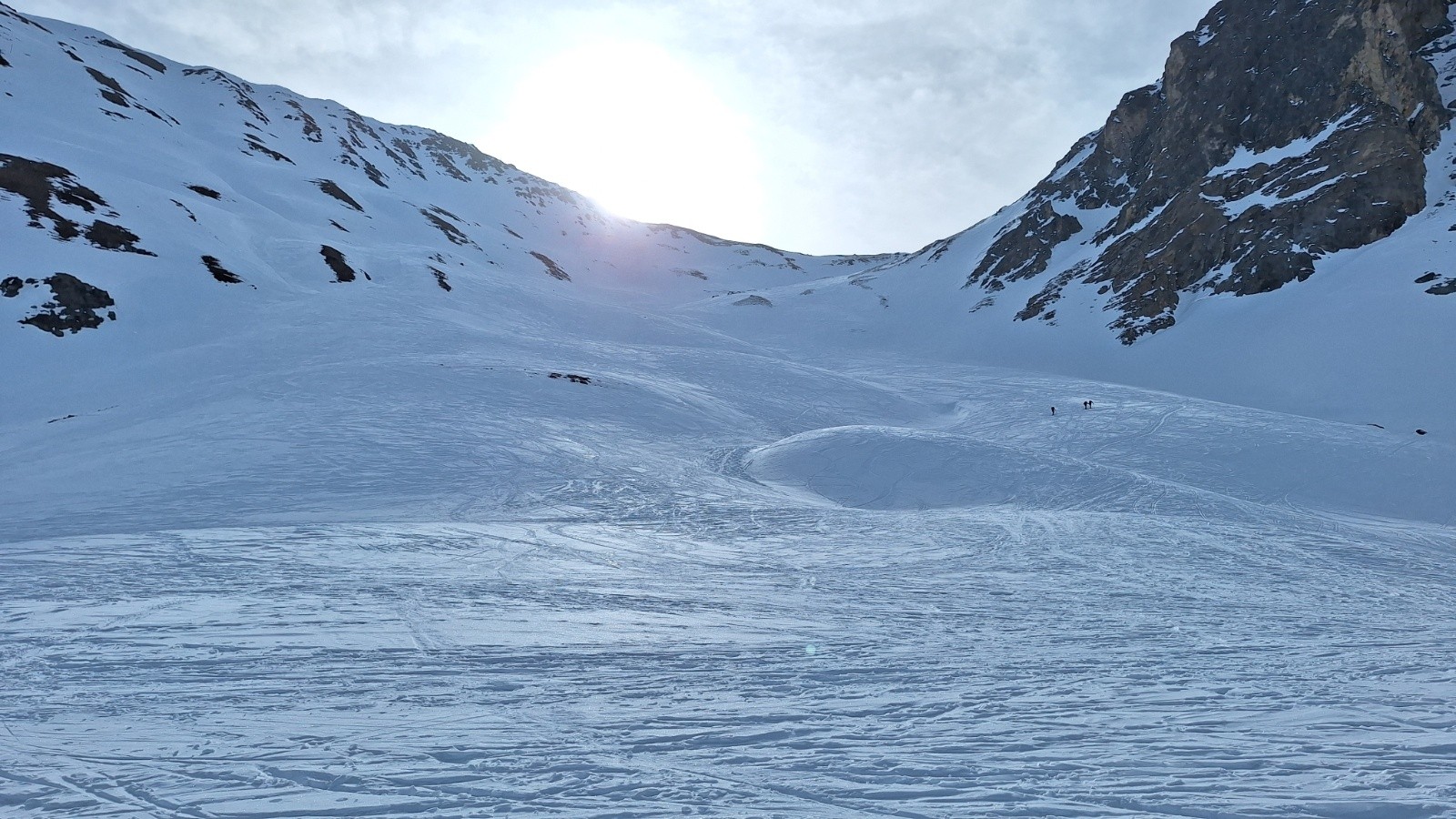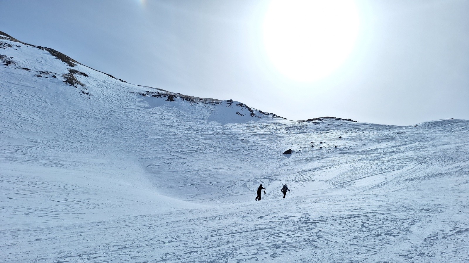 Conditions pour le ski : neige dure sous le Crete, poudre tassée agréable sous le col de l'Aiguillette, Neige béton immonde à skier sur la descente orientation ouest. La faute aux multiples traces de raquettes, au sable du Sahara qui maintenait une température plus fraîche que prévue.. et mauvais choix pour l'orientation.