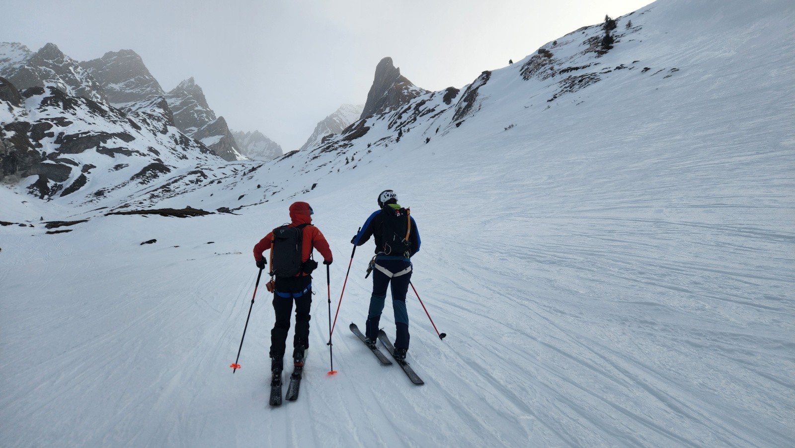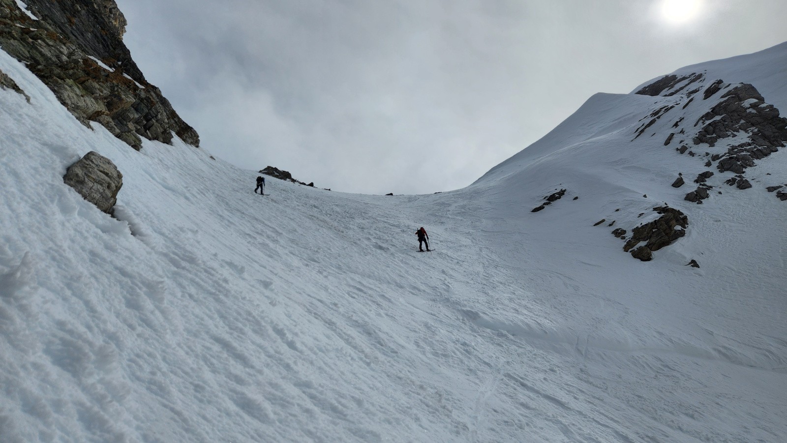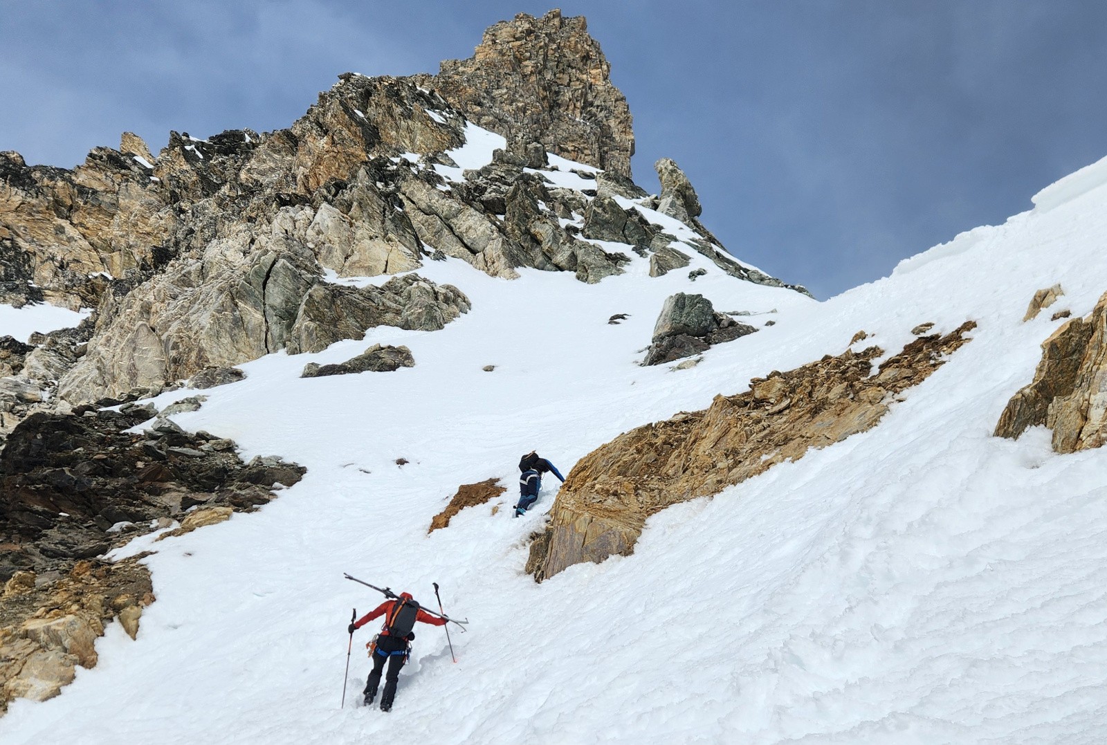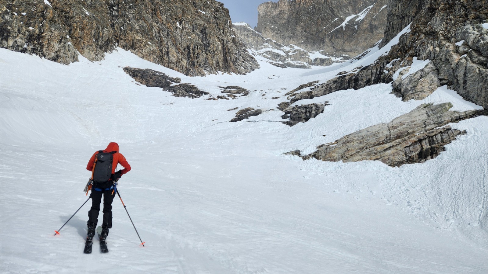 La montée s'avale assez vite. Le verrou passe ski aux pieds, couteaux fortement conseillés, la glace bleue apparaît. Arrivé sous le col, je vois bien que ça va être horrible à descendre mais Christian insiste en me disant que c'est un bon exercice. Sauter la corniche d'un mètre pour atterrir dans une pente béton avec de vielles boules gelées, merci bien pour l'exercice. Au final on travaillera surtout le dérapage sous l’œil goguenard de Kévin qui lui pas fou à fait l'aller retour à pied. Sur le glacier, la neige est pas mal, poudre tassée avec quelques zones plus dures mais avec du grip. Ensuite on s'est accroché aux chaussettes jusqu'au verrou. En dessous, le décaillage commence. On remonte au col des Schistes, un bon choix, après quelques mètres de descente à pied dans des zones de schistes du col éponyme on peut rechausser dans une belle pente parfaite revenue. On retrouvera encore quelques zones de poudre tassée en grattant les pentes rives gauche. Cela aurait été plus beau sans ce sable. Dommage.