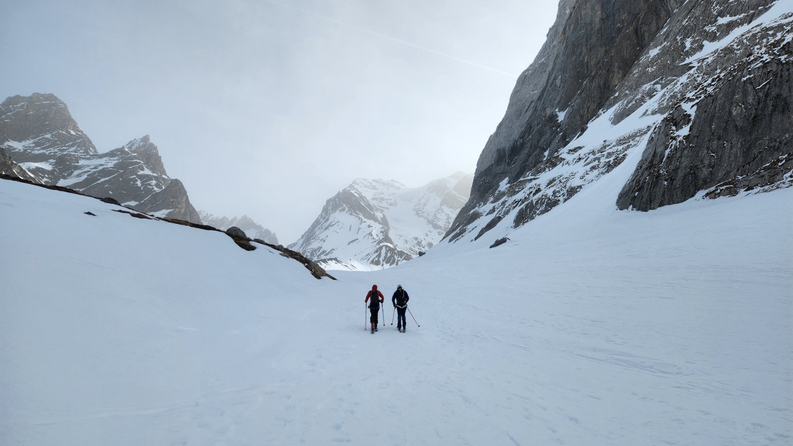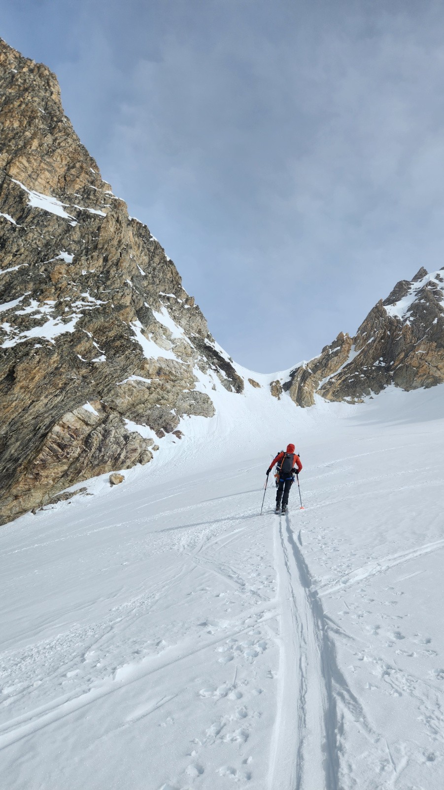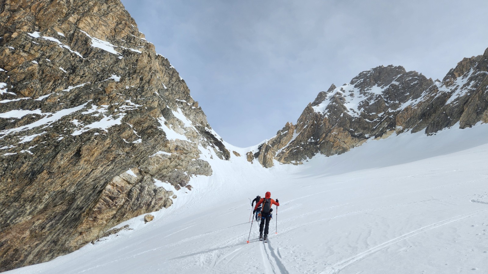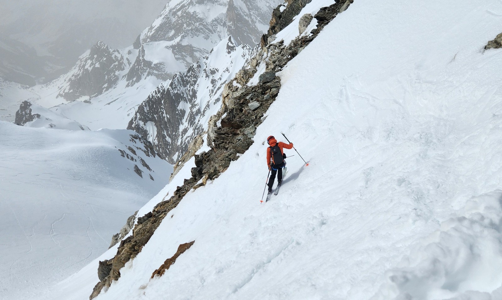 La montée s'avale assez vite. Le verrou passe ski aux pieds, couteaux fortement conseillés, la glace bleue apparaît. Arrivé sous le col, je vois bien que ça va être horrible à descendre mais Christian insiste en me disant que c'est un bon exercice. Sauter la corniche d'un mètre pour atterrir dans une pente béton avec de vielles boules gelées, merci bien pour l'exercice. Au final on travaillera surtout le dérapage sous l’œil goguenard de Kévin qui lui pas fou à fait l'aller retour à pied. Sur le glacier, la neige est pas mal, poudre tassée avec quelques zones plus dures mais avec du grip. Ensuite on s'est accroché aux chaussettes jusqu'au verrou. En dessous, le décaillage commence. On remonte au col des Schistes, un bon choix, après quelques mètres de descente à pied dans des zones de schistes du col éponyme on peut rechausser dans une belle pente parfaite revenue. On retrouvera encore quelques zones de poudre tassée en grattant les pentes rives gauche. Cela aurait été plus beau sans ce sable. Dommage.