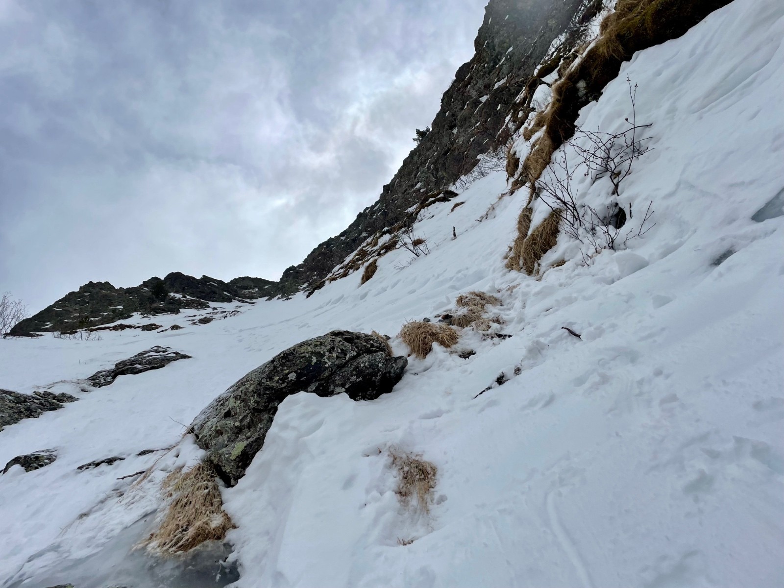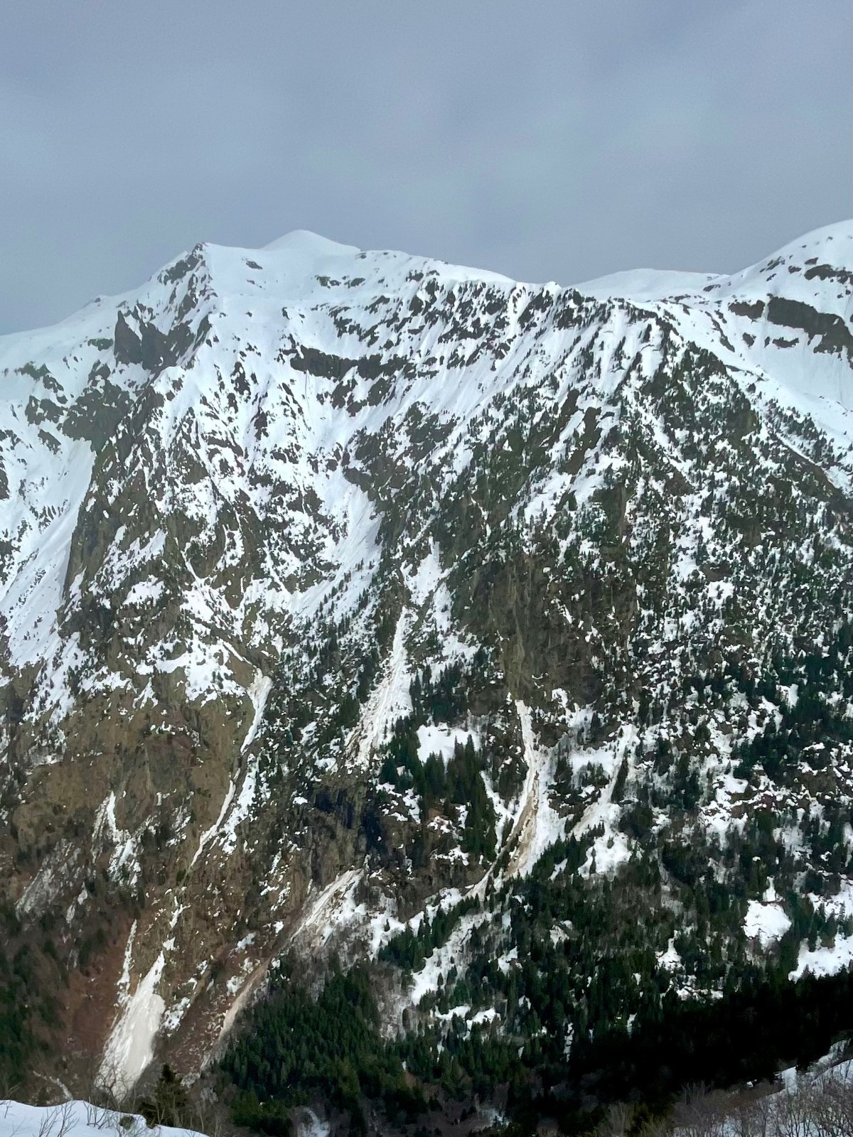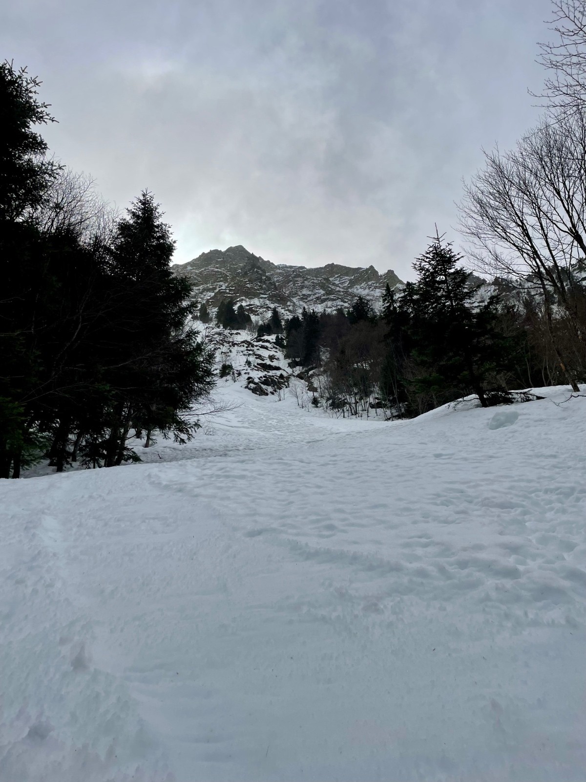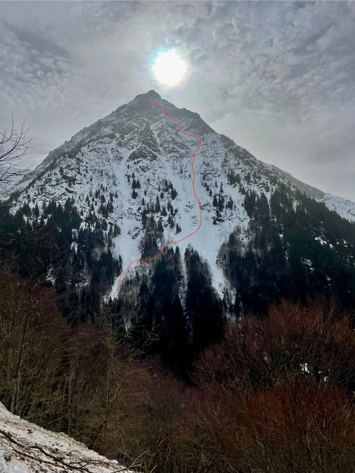 Tout commence il y a 3 semaines alors que j’allais surfer la fameuse goulotte de droite sur le même sommet. Lors de l’approche, au hasard d’une trouée dans le bois je leve le nez et aperçoit la possibilité d’un itinéraire sur l’immense versant Nord de cette impressionnante pyramide.
