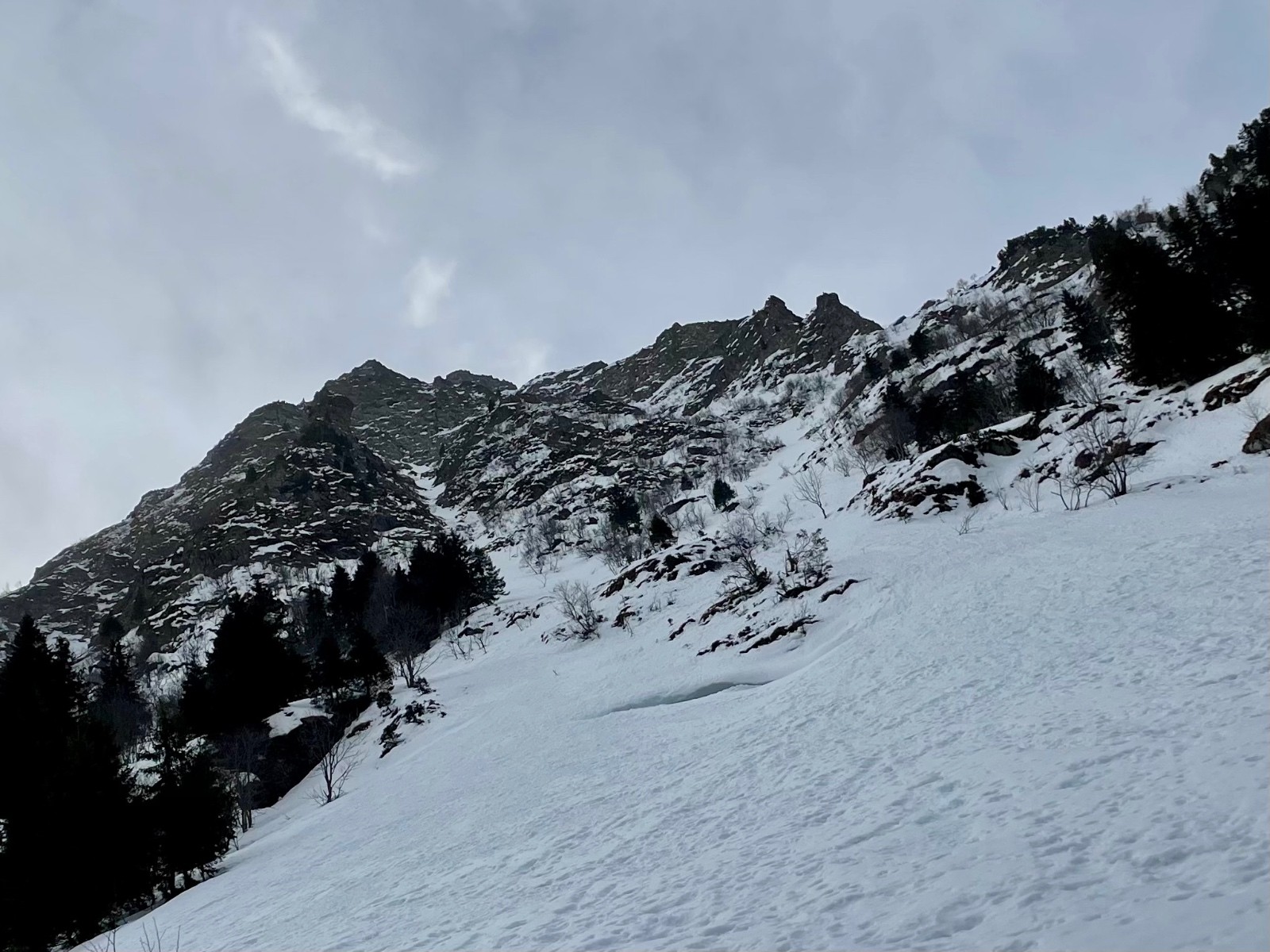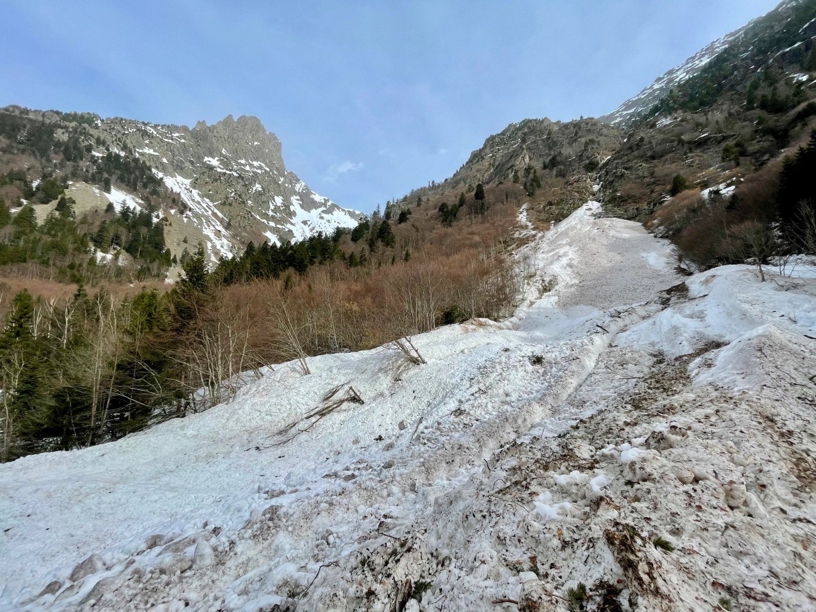 Approche sans encombre. Plusieurs déchaussages imposés par les torrents et les dépôts d’avalanches gargantuesques, je vire à droite après la passerelle du torrent de Vaunoire.