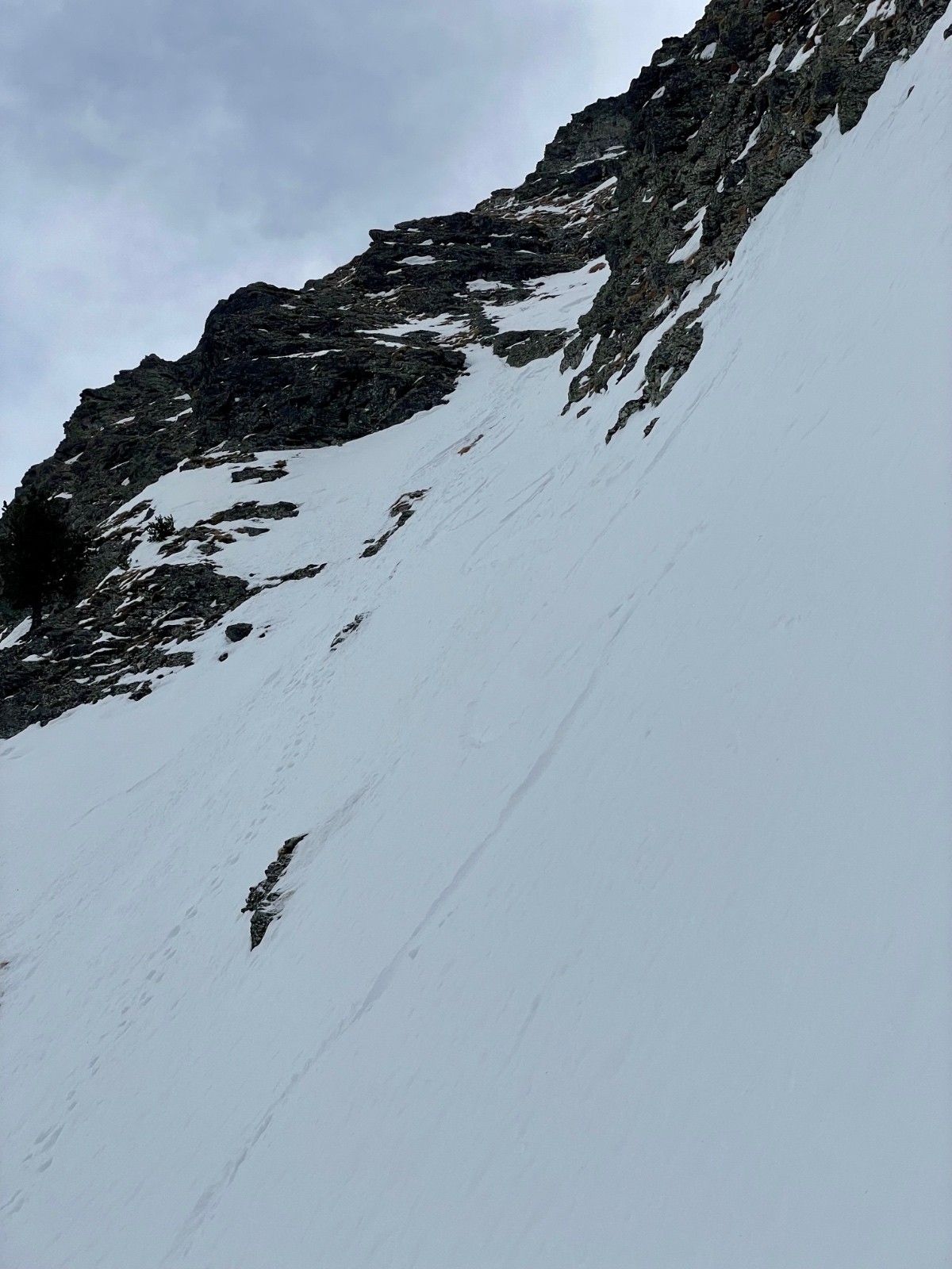 Ensuite c’est une longue ascension qui m’attend. 600m de face de la base au sommet et cette pente très forte dès le départ qui jamais ne faiblira jusqu’à devenir très soutenue dans le tiers supérieur.