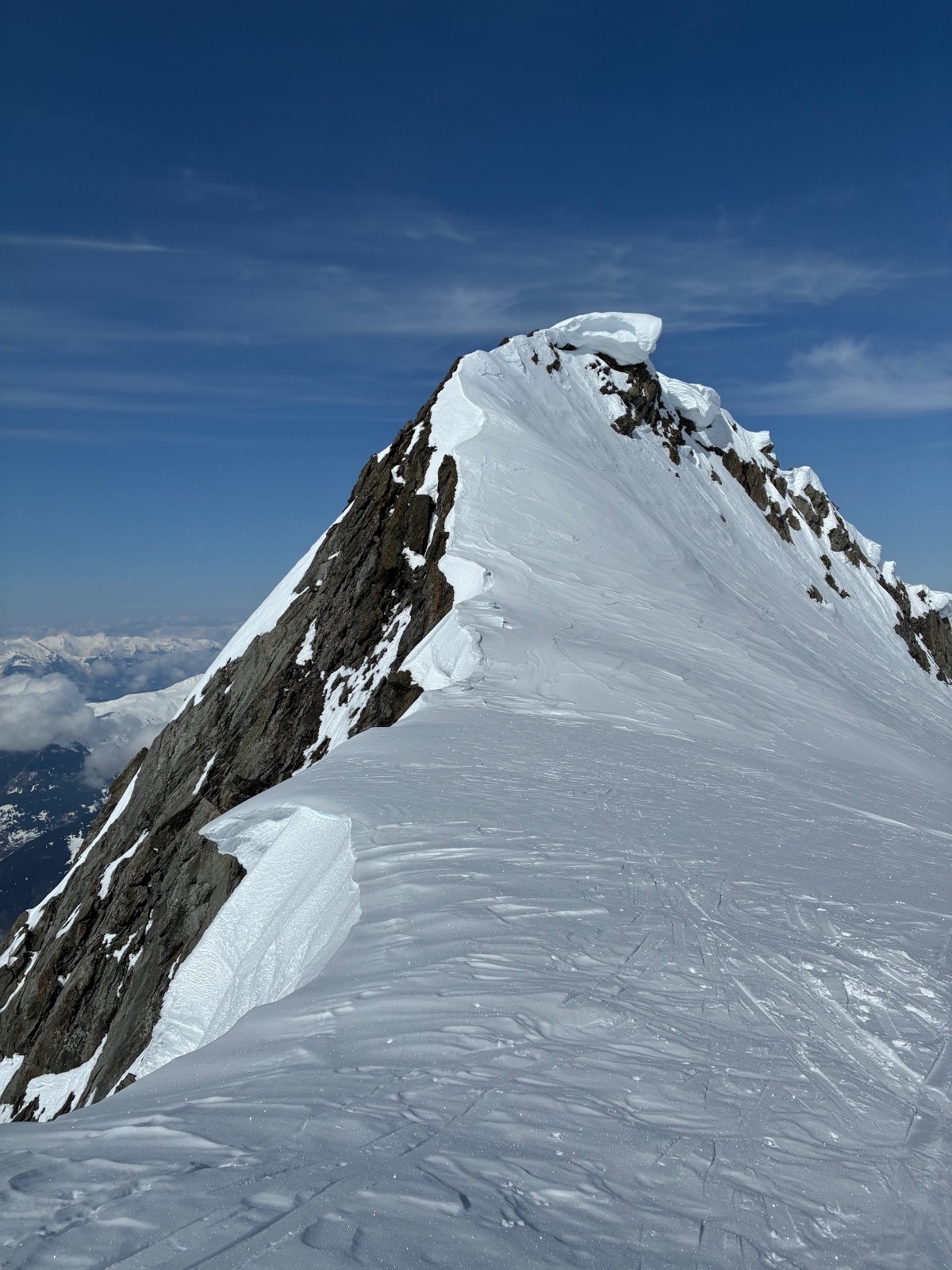 Glacier : Passage par l'épaule à gauche (un peu raide). Glace vive visible par endroits, mais l'ensemble était très sain et stable. Sortie sur le plateau supérieur du glacier pour rejoindre l'arête sommitale.