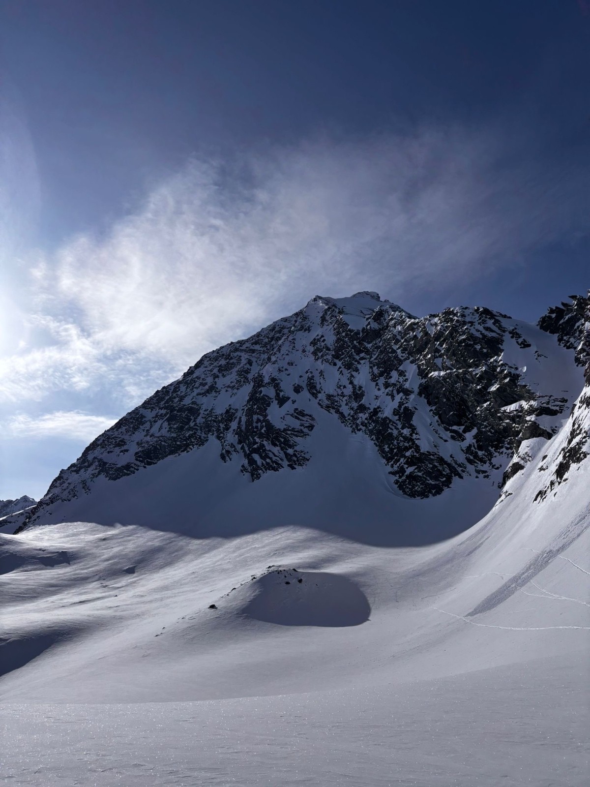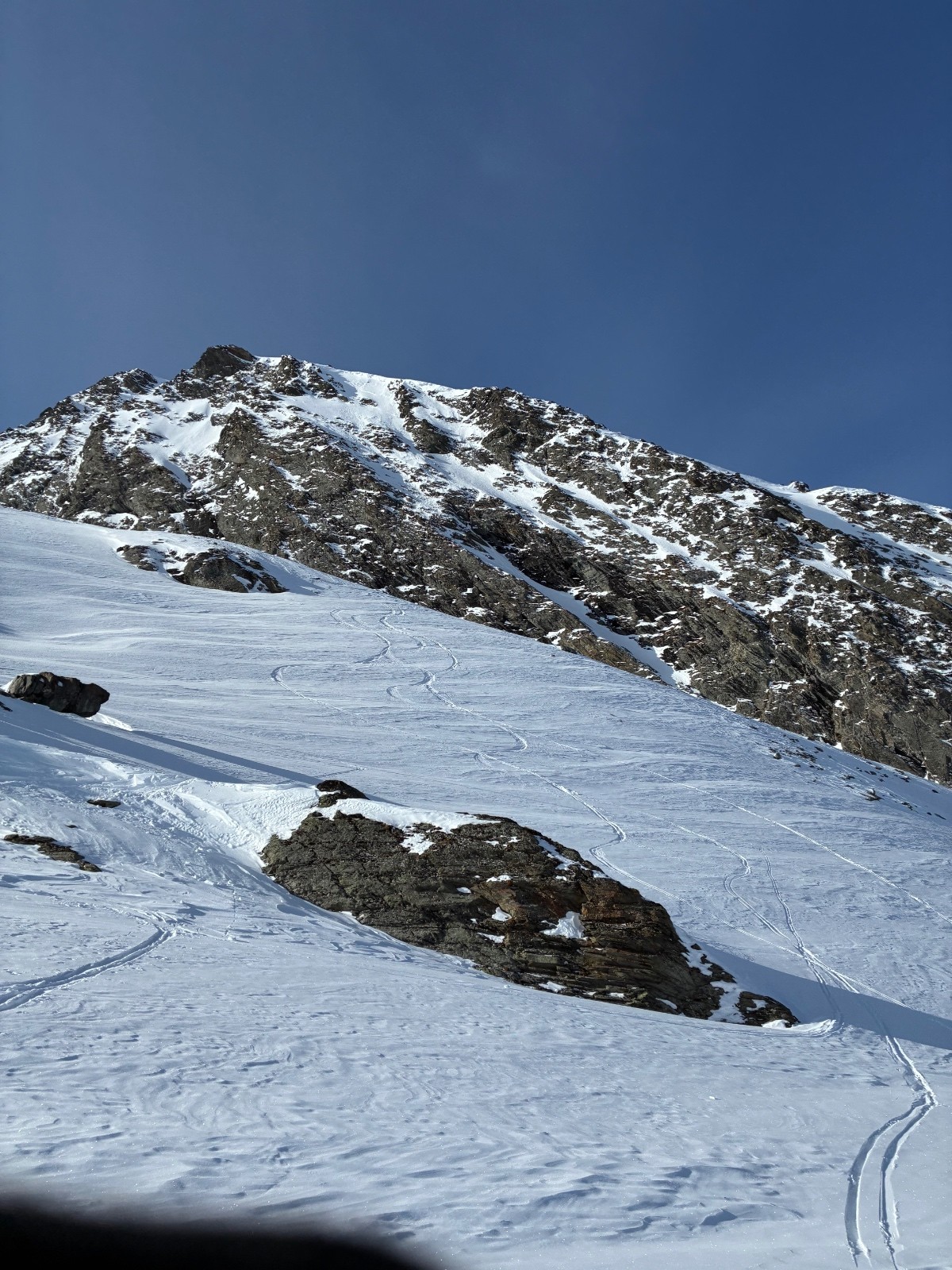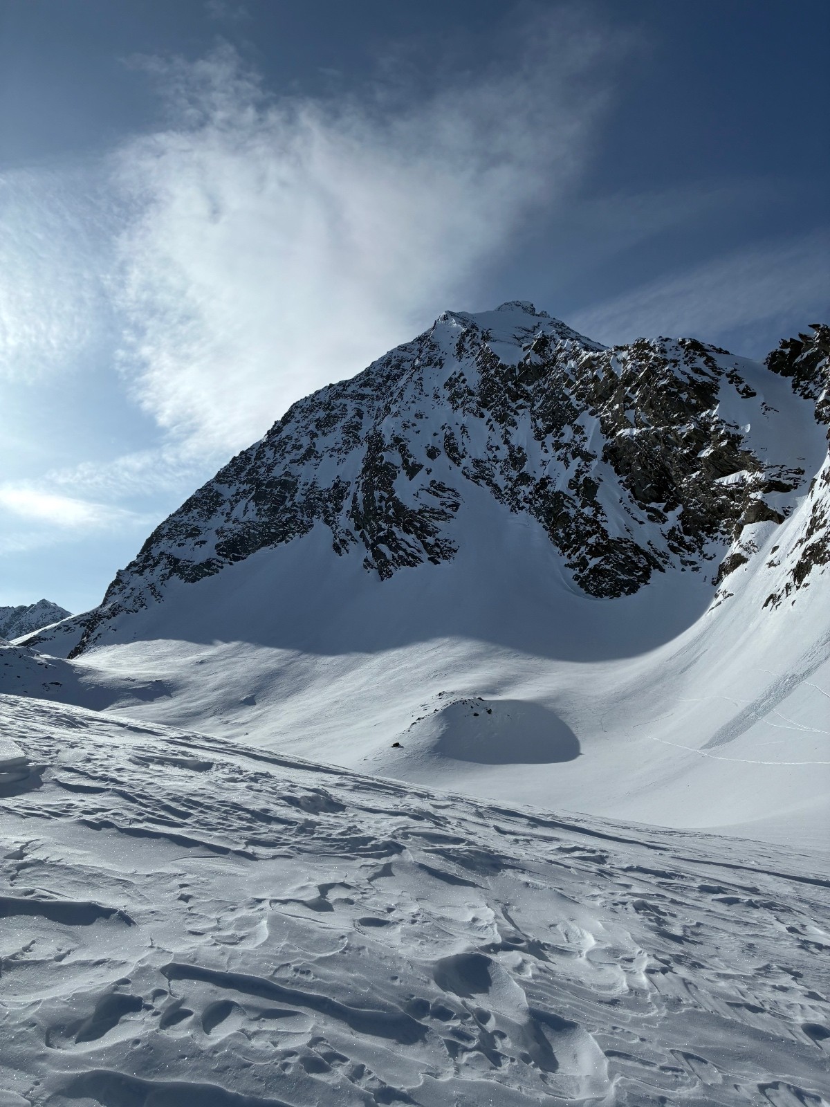 Milieu (3000m - Refuge) : Dès qu'on est à l'abri du vent, on retrouve une "vieille poudre" de surface (5-10 cm) sur fond dur. Excellent ski.