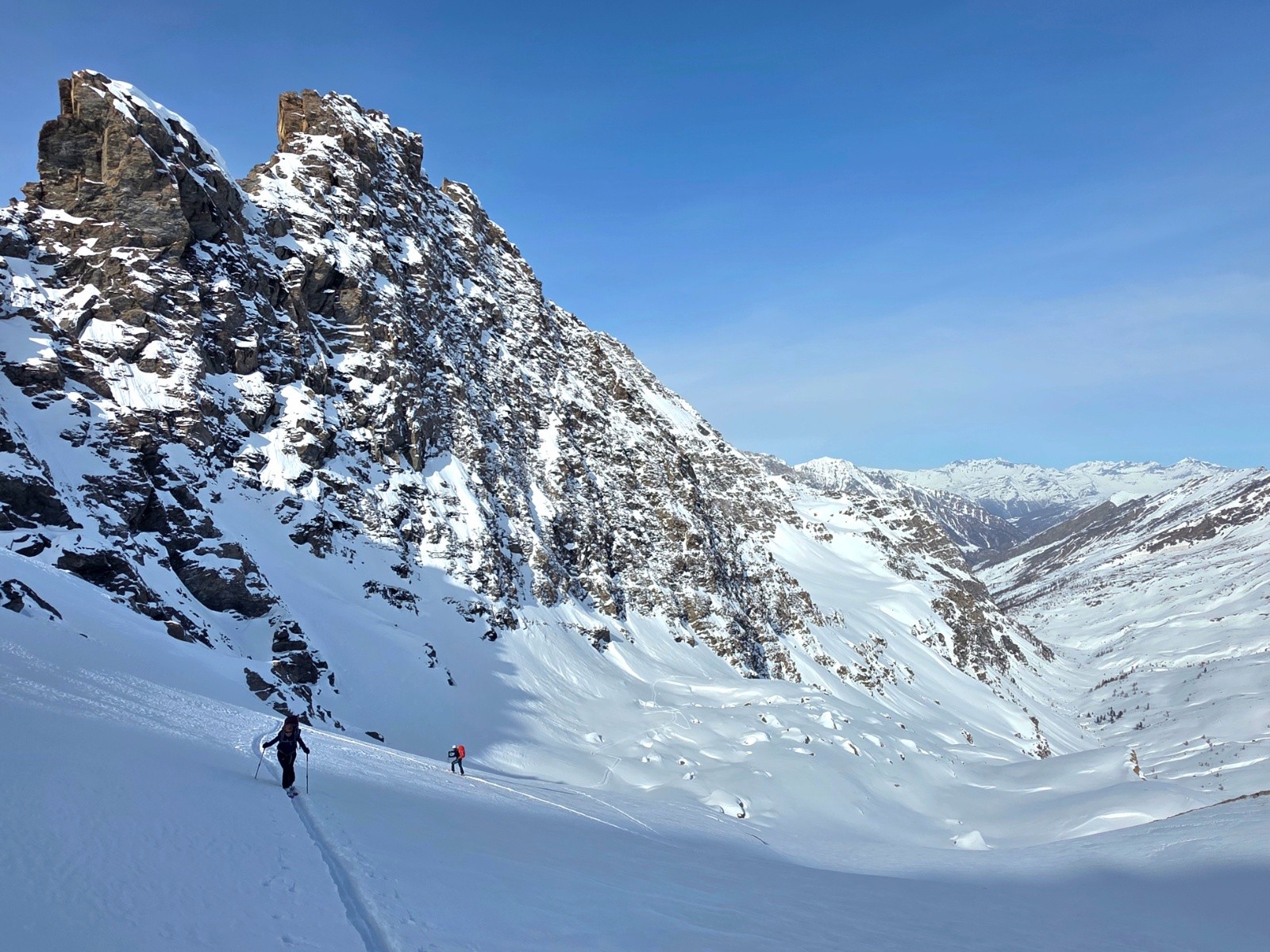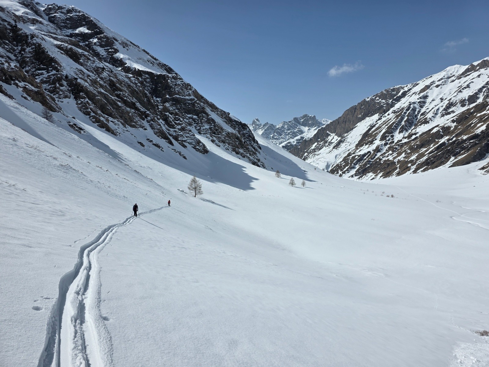 Superbe raid en boucle realisé a 4, assez original dans son tracé malgré quelques etapes classiques, varié et esthetique entre Ubaye, Viso et Queyras. A cette époque de l hiver, plusieurs refuges etant fermés, il n y a personne en montagne donc un certain engagement malgre tout pour ce raid sérieux.