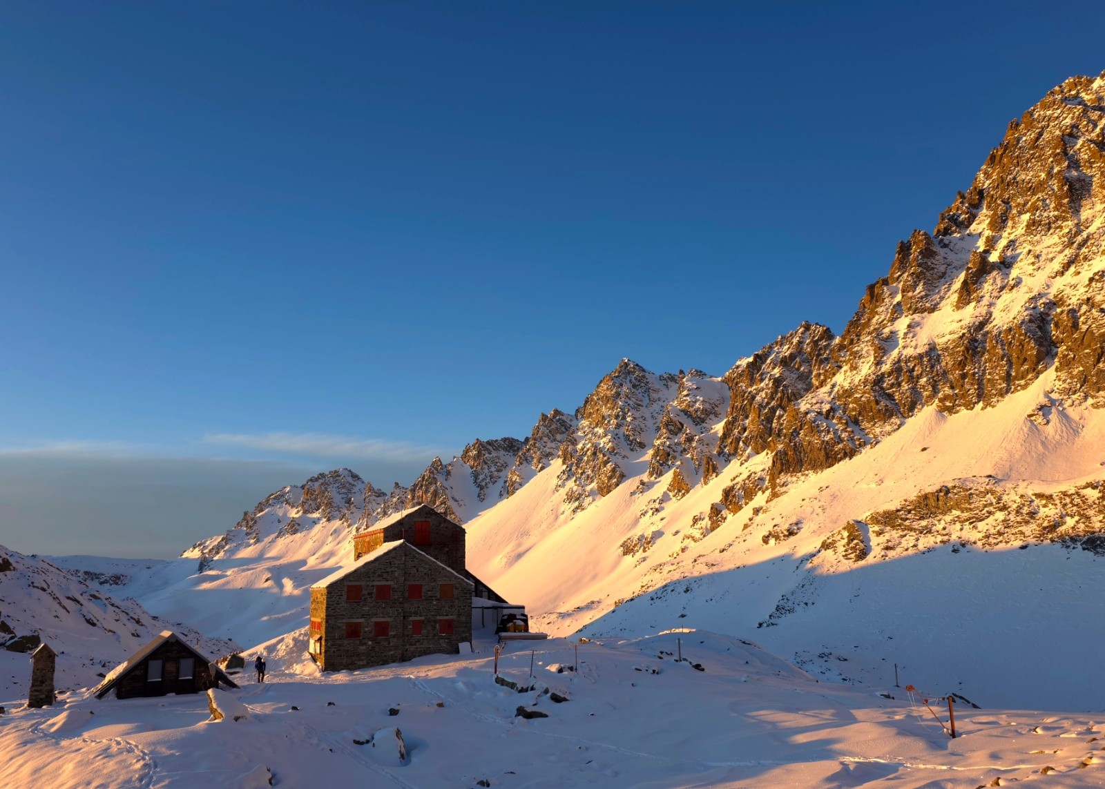 Ciel bleu au petit matin. Superbe montée vers le col de Soustre dans une neige un peu surprenante. Montee tres esthetique. On hesite entre 2 cols. On choisit le plus evident. Bonne pioche. Depuis la crête, au loin on voit Ristolas et les sources du Guil d un côté, de l autre le long vallô deseet qui part vers Chianale.. Le vallon qui redescend vers Gr del Rio, tres sauvage sans une trace est magnifique dans une neige bien décaillée. Longue remontée assez plate ensuite vers le col Agnel et descente très courte vers le refuge. On avait envisagé le matin de faire le pain de Sucre si la forme etait au RV mais réalisme oblige, on reste sagement au refuge pour siroter des bières et jouer aux cartes.