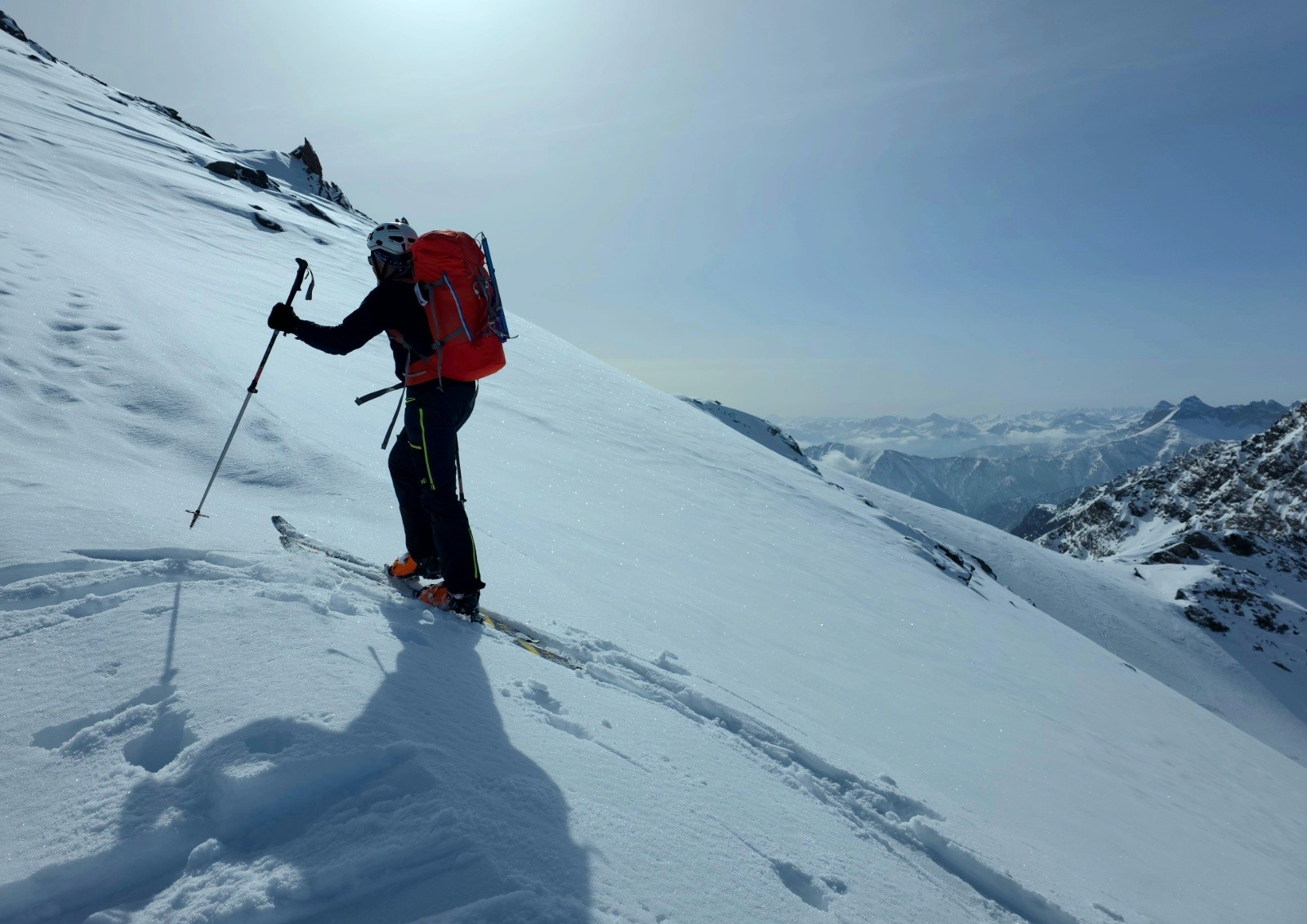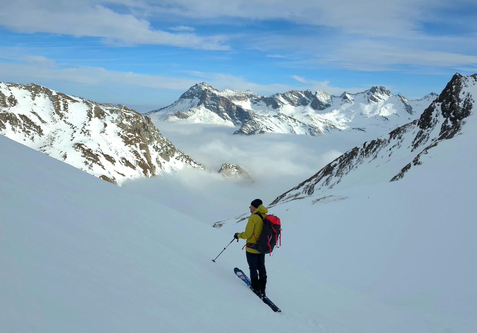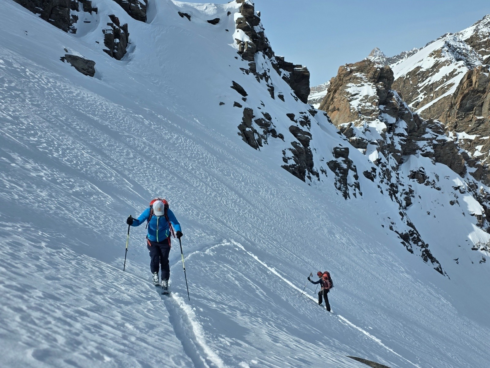Peu de neige en Versant sud en partant de Meleze mais on peut quand meme chausser. Montée régulière entre 1800 et 2900 depuis le val de Bellini jusqu'a la crête de Bondormir. On rencontre une superbe harde de bouquetins dans le semi brouillard. Traversée assez dangereuse sur les 250 derniers mètres a flanc raide qu il faut je pense eviter si regel insuffisant ou si depart trop tard par beau temps. La pente est bien fuyante. Belle descente dans les melezes jusqu'à Pontechianale versant N. Marche de 3km jusqu a Castello puis remontée de 200m ski sur le sac jusqu au petit bijou de refuge/Auberge de Grongio Martre. Merci a Laila et Lucas pour l accueil, les echanges et le formidable diner.