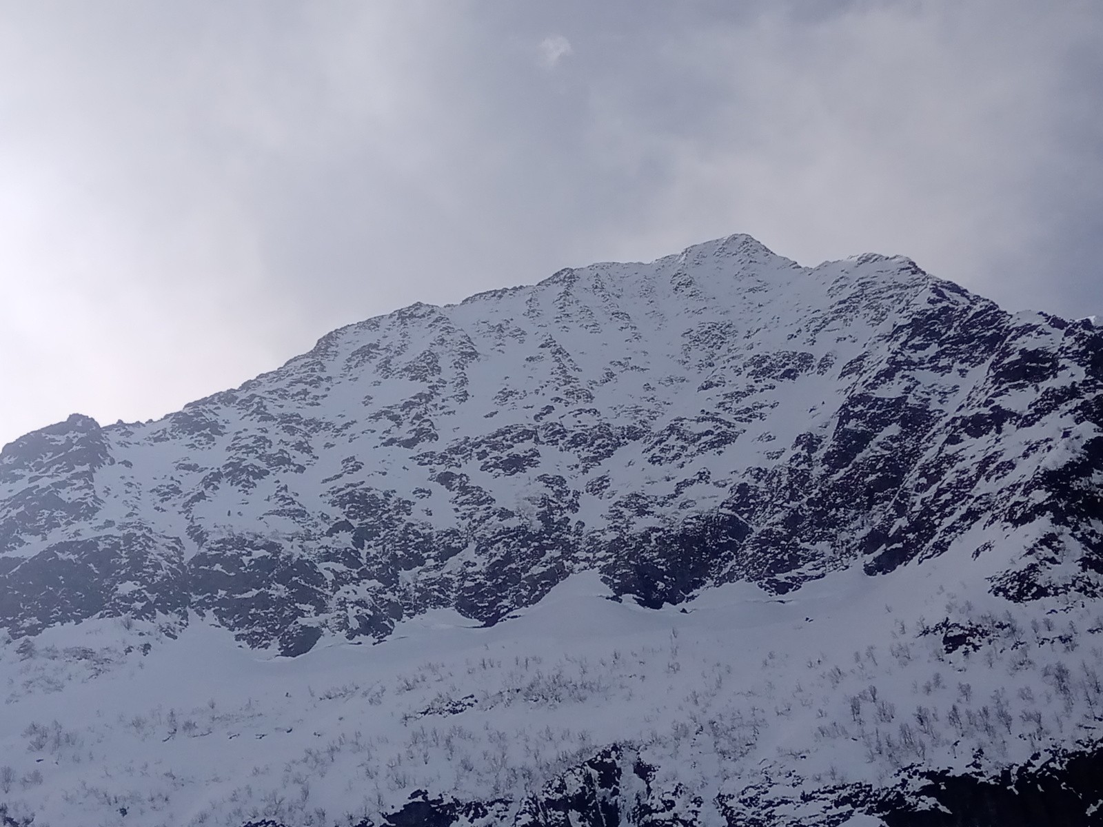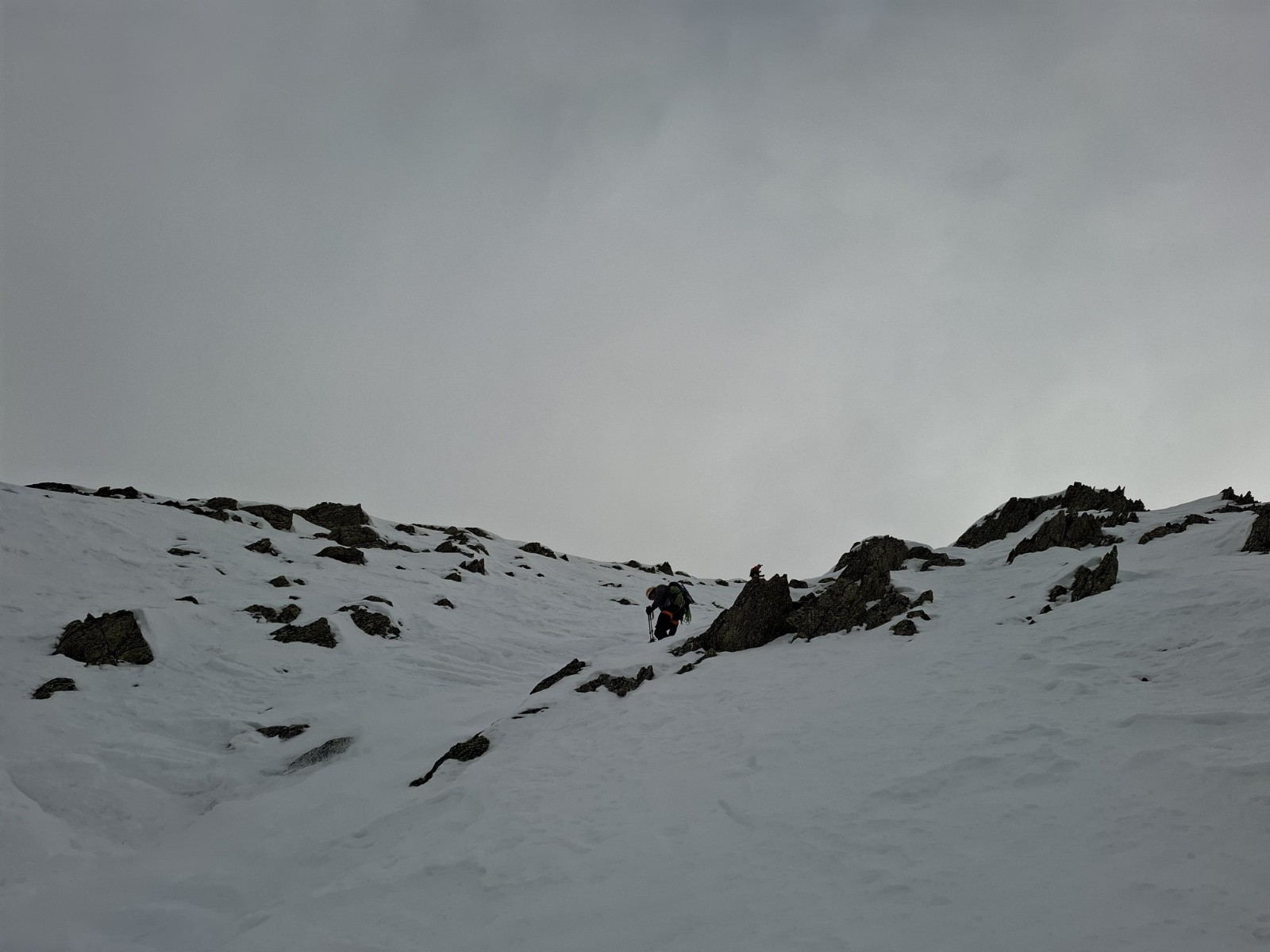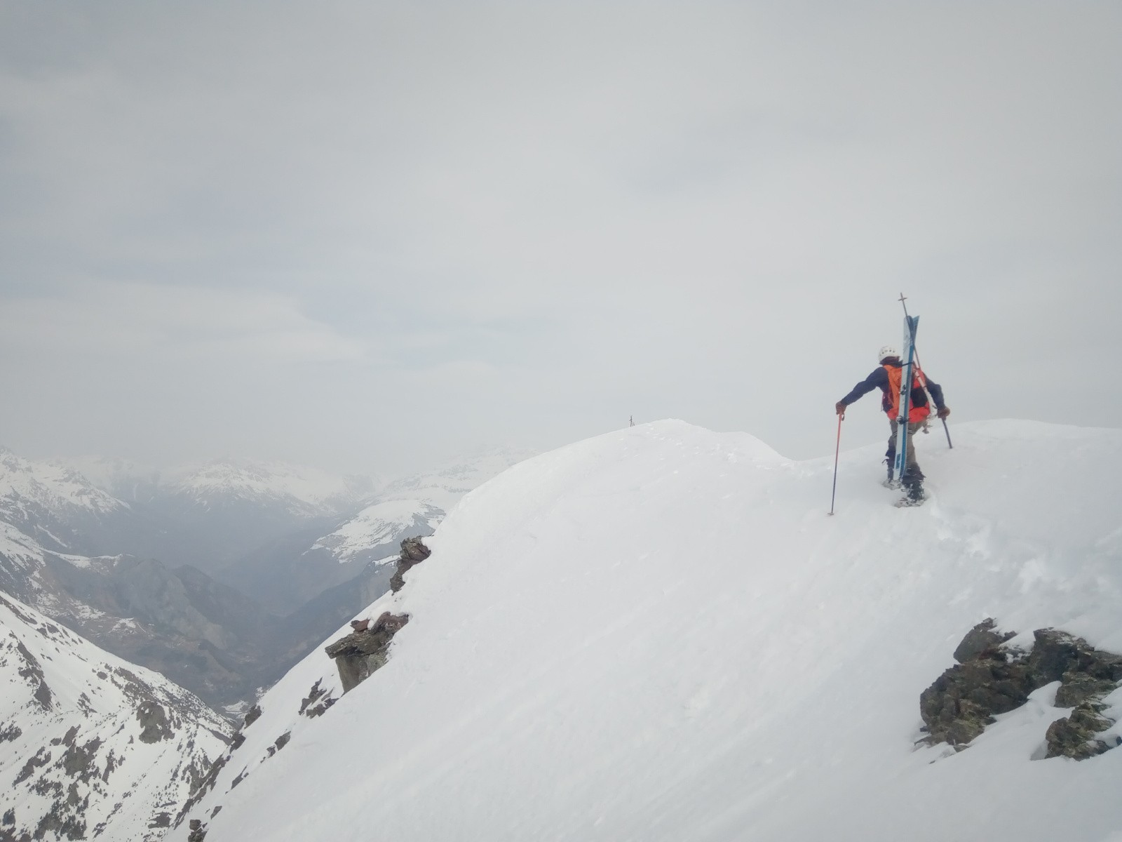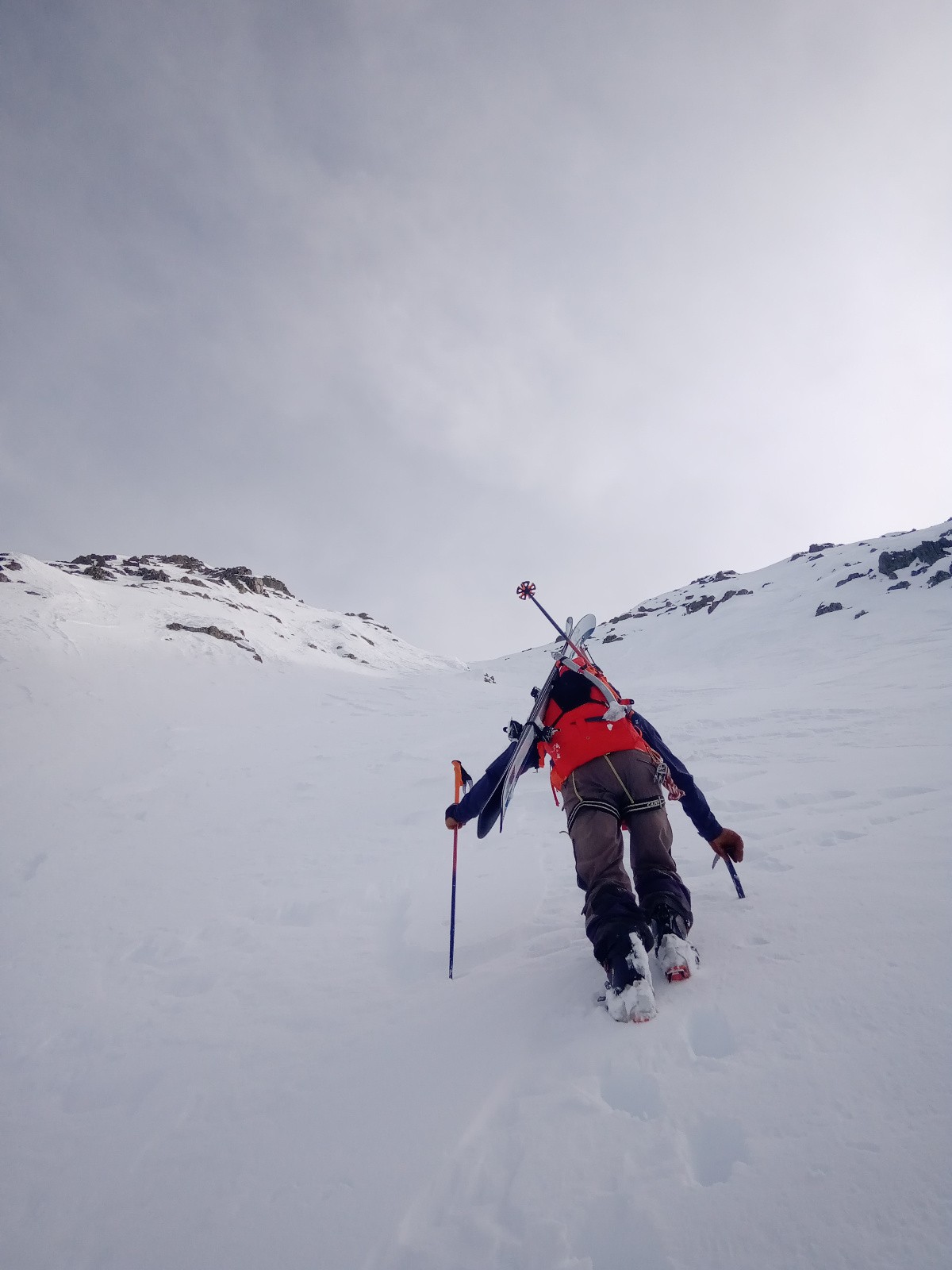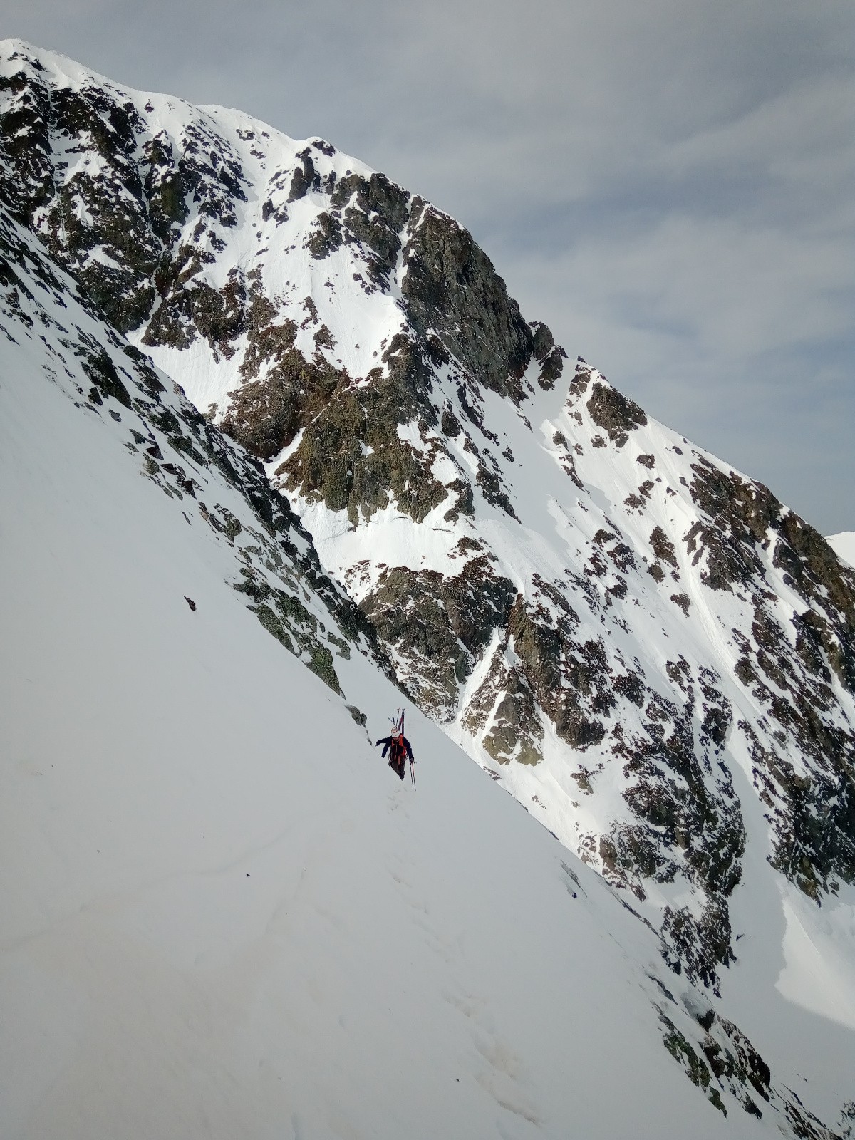 Longue montée, laborieuse (comme d’hab), des traces à pieds et de descentes à skis dans la banquette en bas de la petite face nord, parfait. Malheureusement toutes les traces s’interrompent au bout de la banquette, on trace donc la face, l’enfoncement est pas énorme heureusement, la neige est parfaite on espère la même dans la face nord. Sommet, de vagues traces à pieds semblent provenir de l’arrête depuis Plancol, il se passe des trucs étranges ici…