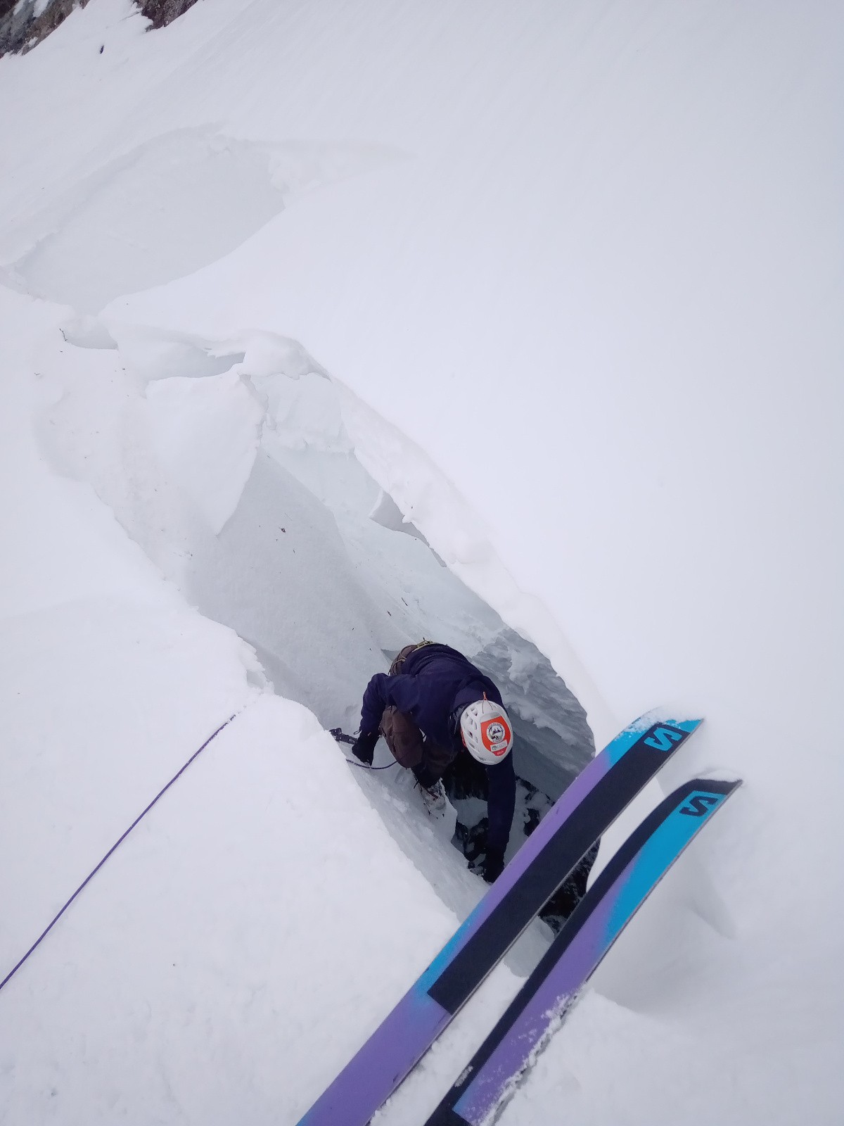 Pour réellement conclure, Seb décide de rajouter à la sortie la petite anecdote qui sert à terminer un CR (et cela malgré ses railleries sur ma pratique skitourienne) : un gant qui se fait la malle dans la « rimaye ». Le bougre semble y tenir particulièrement cher et nous fait ressortir la corde, le baudard et les pioches pour l’assurer dans une aventure de spéléologie quand tout le monde ne rêve que de rentrer boire de l’eau à la voiture. Et tout ça pour faire choux blanc !