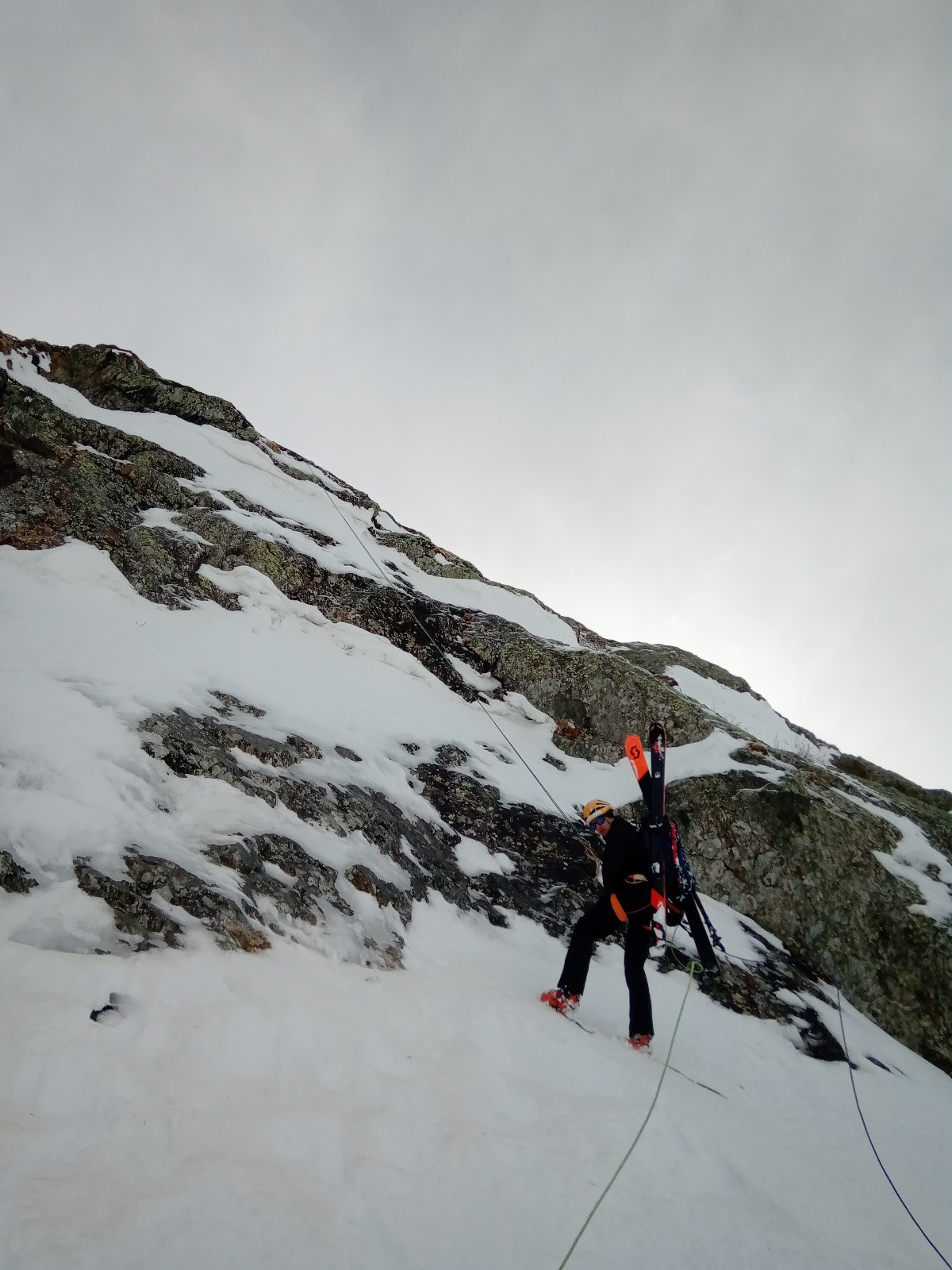Les 100 premiers mètres sous le sommet, la partie raide en fait, sont en gobelets sous fine croûte, c’est pas magique mais ça skie quand même. La section se conclue par 10m d’iceski avec des ancrages piolets miséreux, impeccable. Puis de là jusqu’au relais du ressaut on retrouve la belle poudre rencontrée dans la petite face nord, le ski est génial malgré un léger manque de lumière. Un peu de recherche d’itinéraire pour contourner deux trois cailloux rendent la face moins monotone, c’est bien organisée l’affaire. Et pour conclure Antoine au yeux d’aigles nous flaire le relais à 50m ! Seb nous rajoute un piton béton et une cordelette neuve, rappel de 50m (pas moins!) et hop, la PLD de Matheysine c’est fait. Les deux comparses sont toujours aussi insouciants, moi je m’évertue à leur répéter que c’est quand même un sacré coup qu’on vient de se faire.
