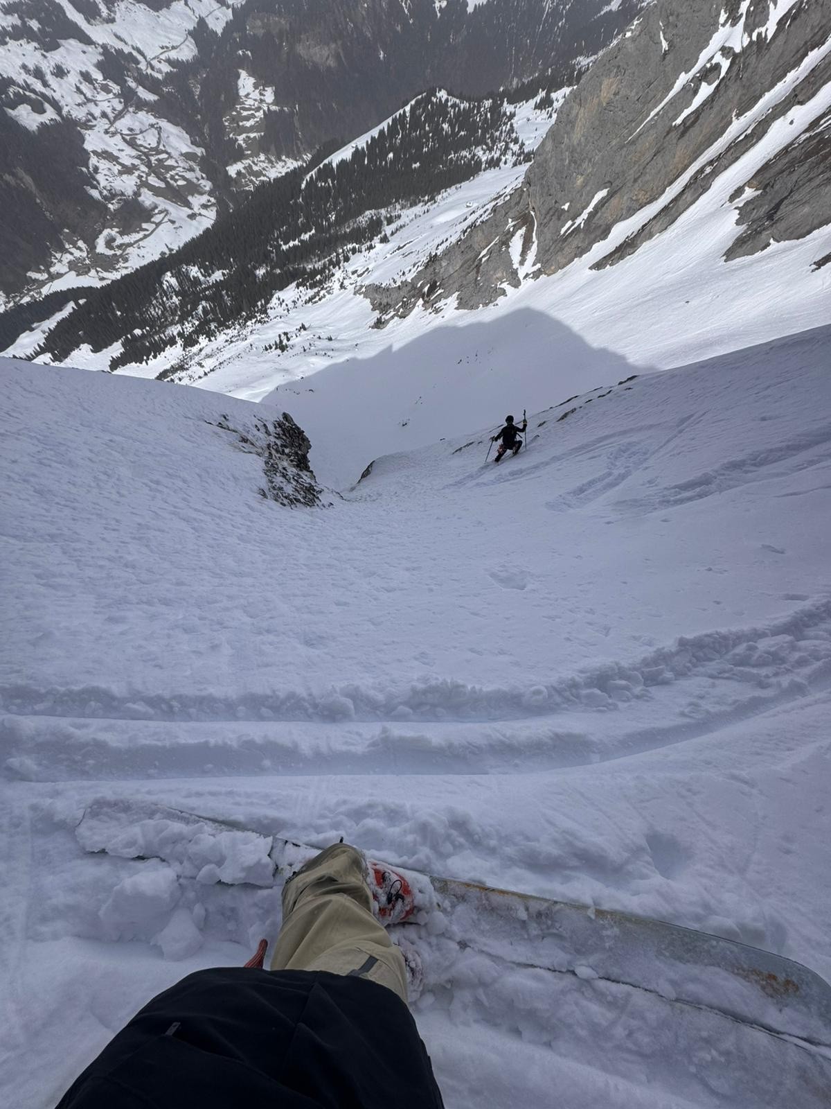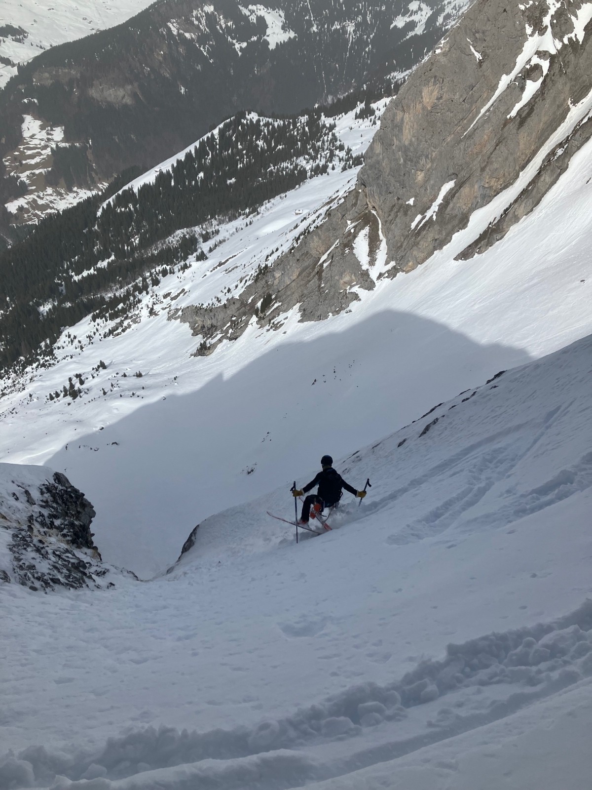 On rejoint enfin les pentes du bas, pour du bon ski avec moins de dangers, avant de rejoindre les traces d'Arav' et la tranquillité d'esprit. Je suis bien content car le raidard sous le rappel passe bien mieux avec une neige plus douce.