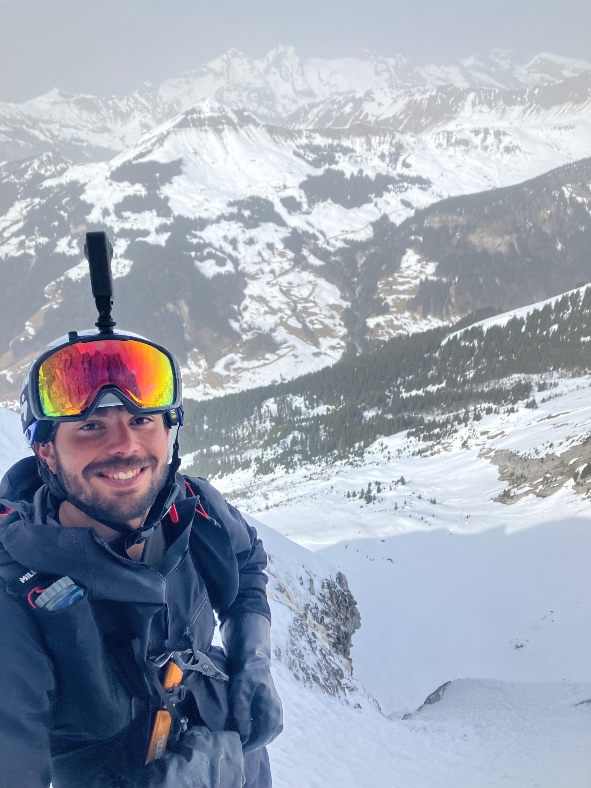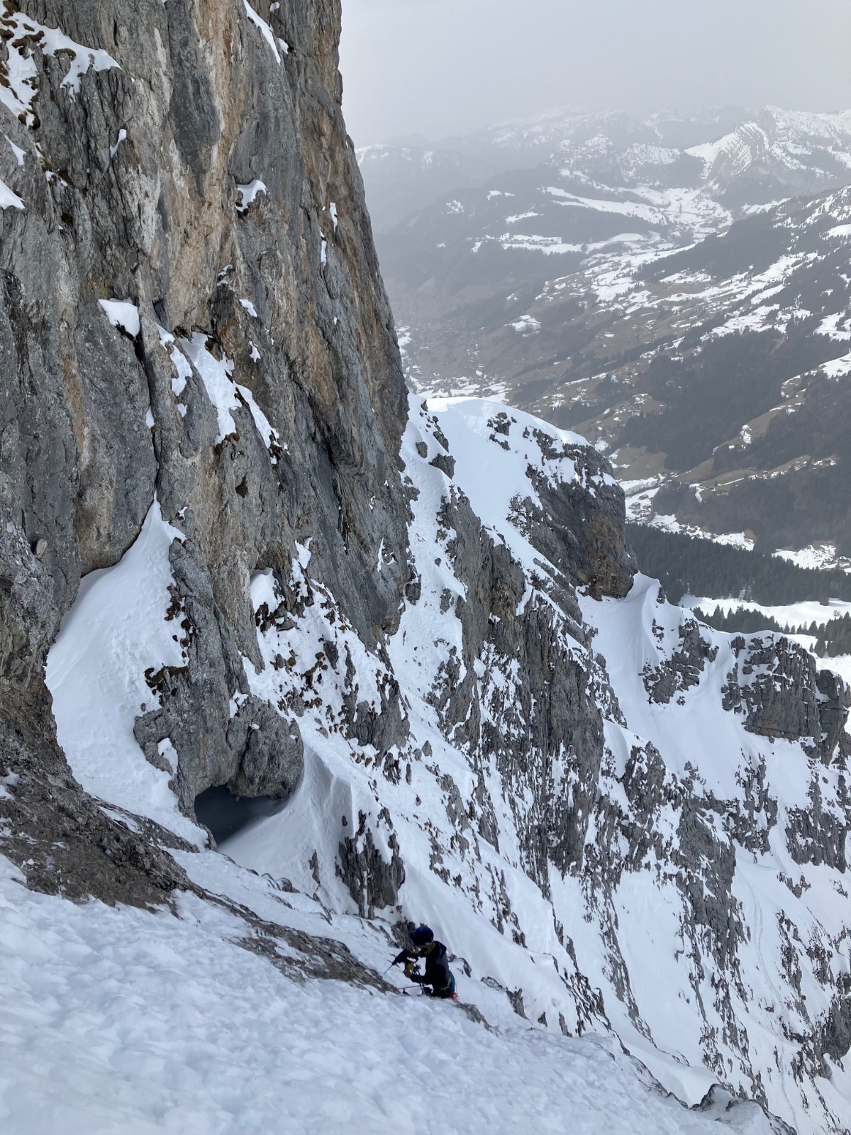 Ski à nouveau, Marian en tête car on arrive au rappel de la grotte. Malheureusement, la traversée ne semble pas faire intégralement, les dalles rocheuses trop présentes comme le vide en dessous. Deux spits, un nœud qui fait de la résistance, et c'est parti pour un rappel en fil d'araignée d'anthologie.