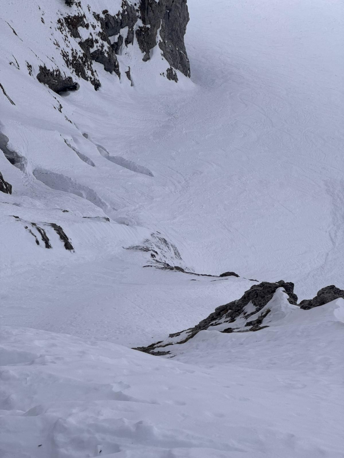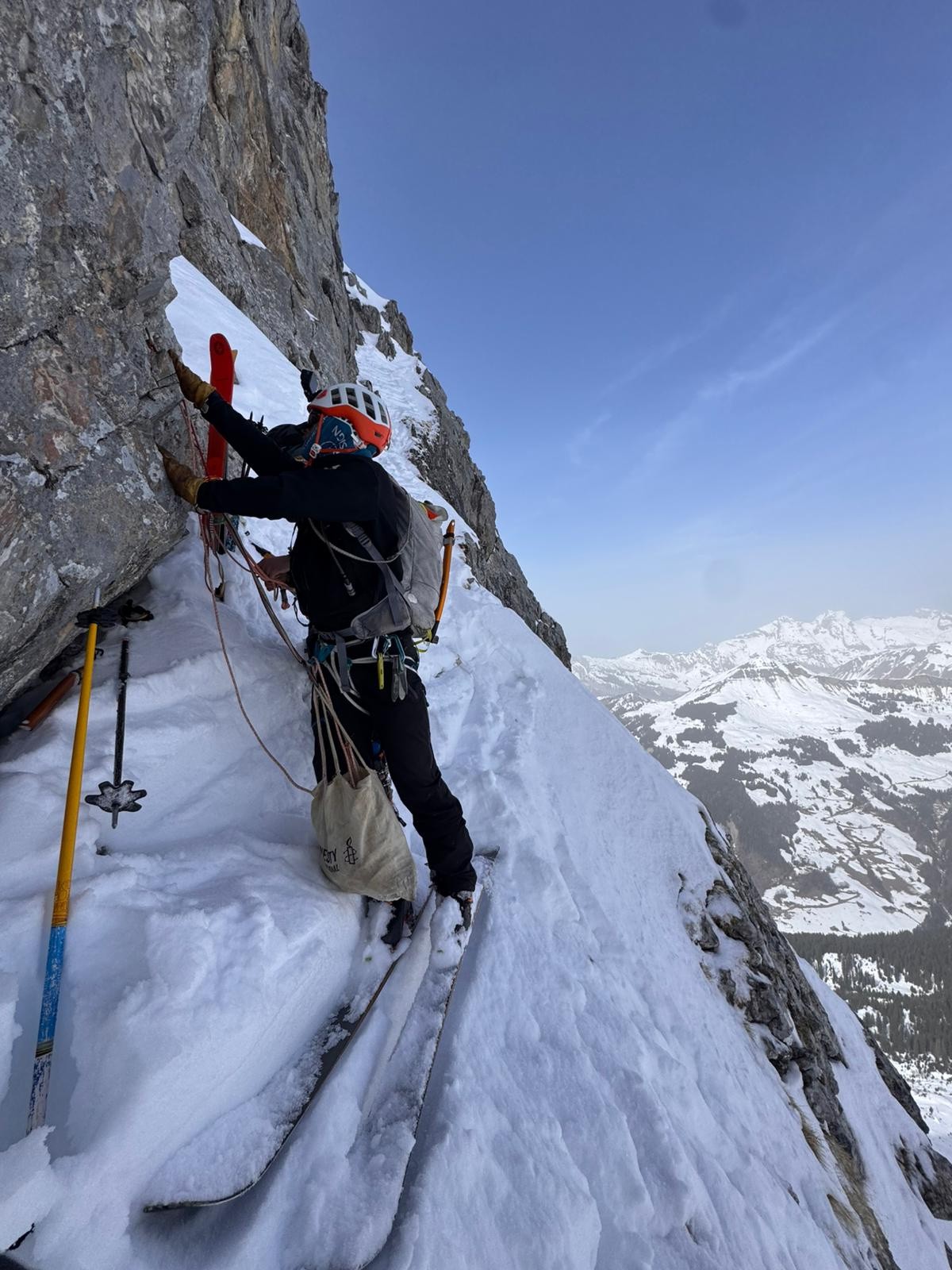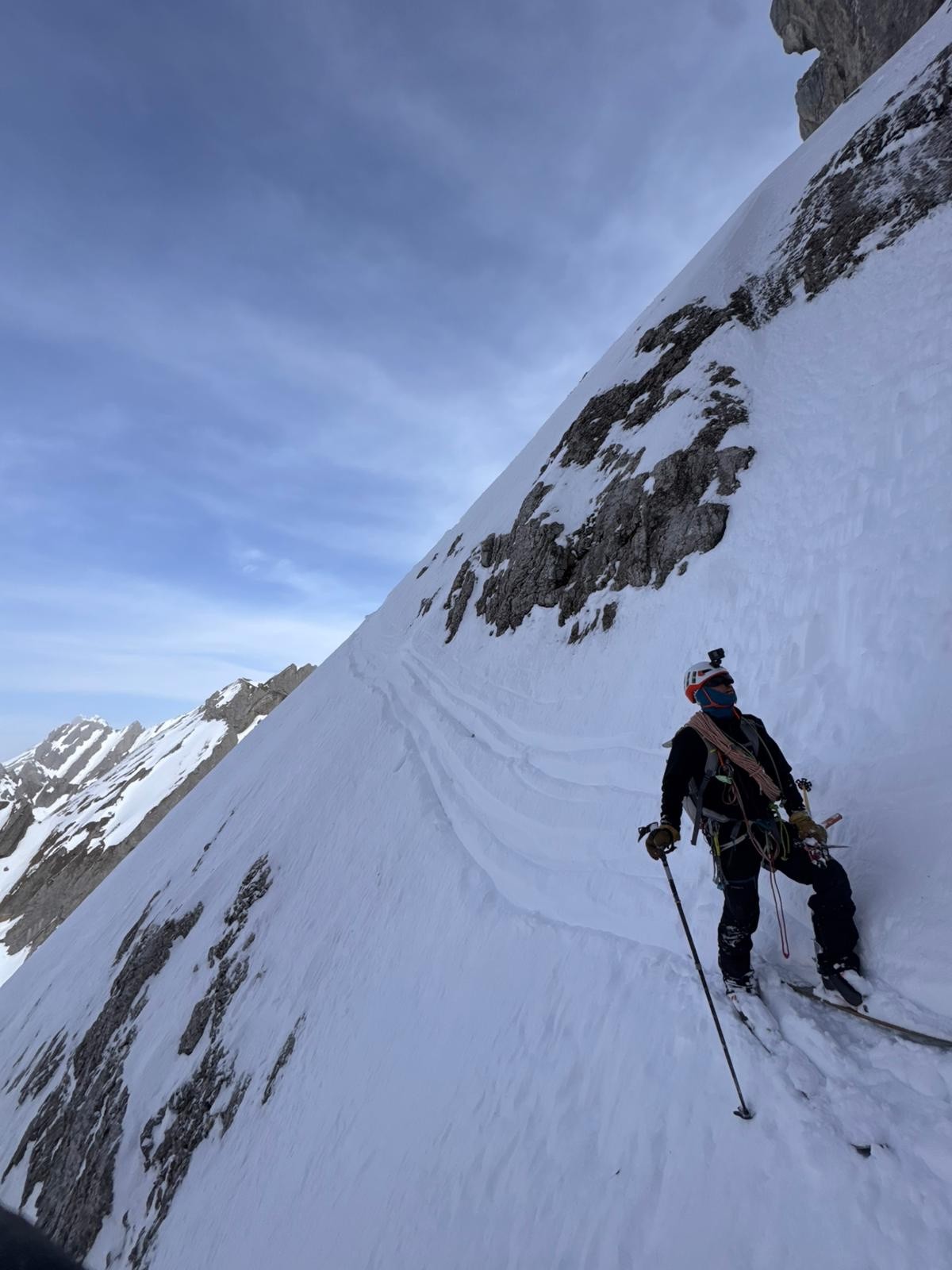 Du bon ski ensuite pour rejoindre le "crux" prévu. A nouveau un Z, avec du rocher bien affleurant et assez dalleux. Encordé à nouveau, ça passe bien grasse à de bonnes mains et bons ancrages, mais parfois il faut littéralement se pendre sur les mains.