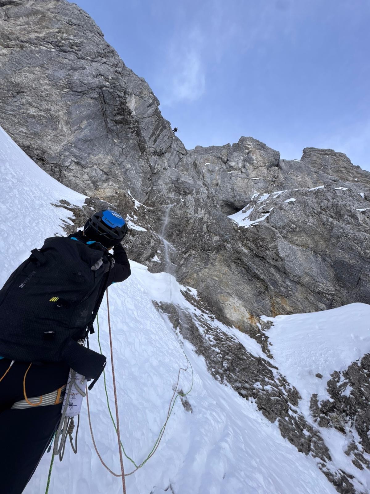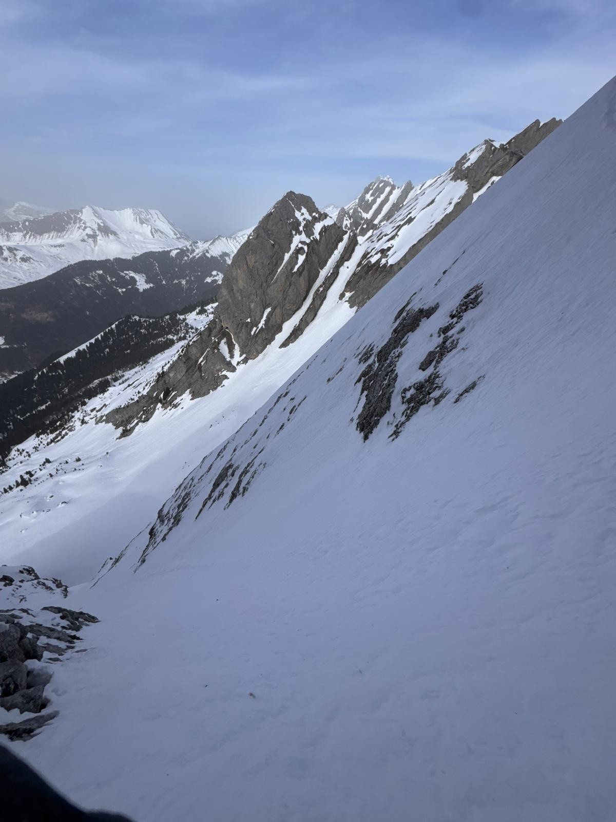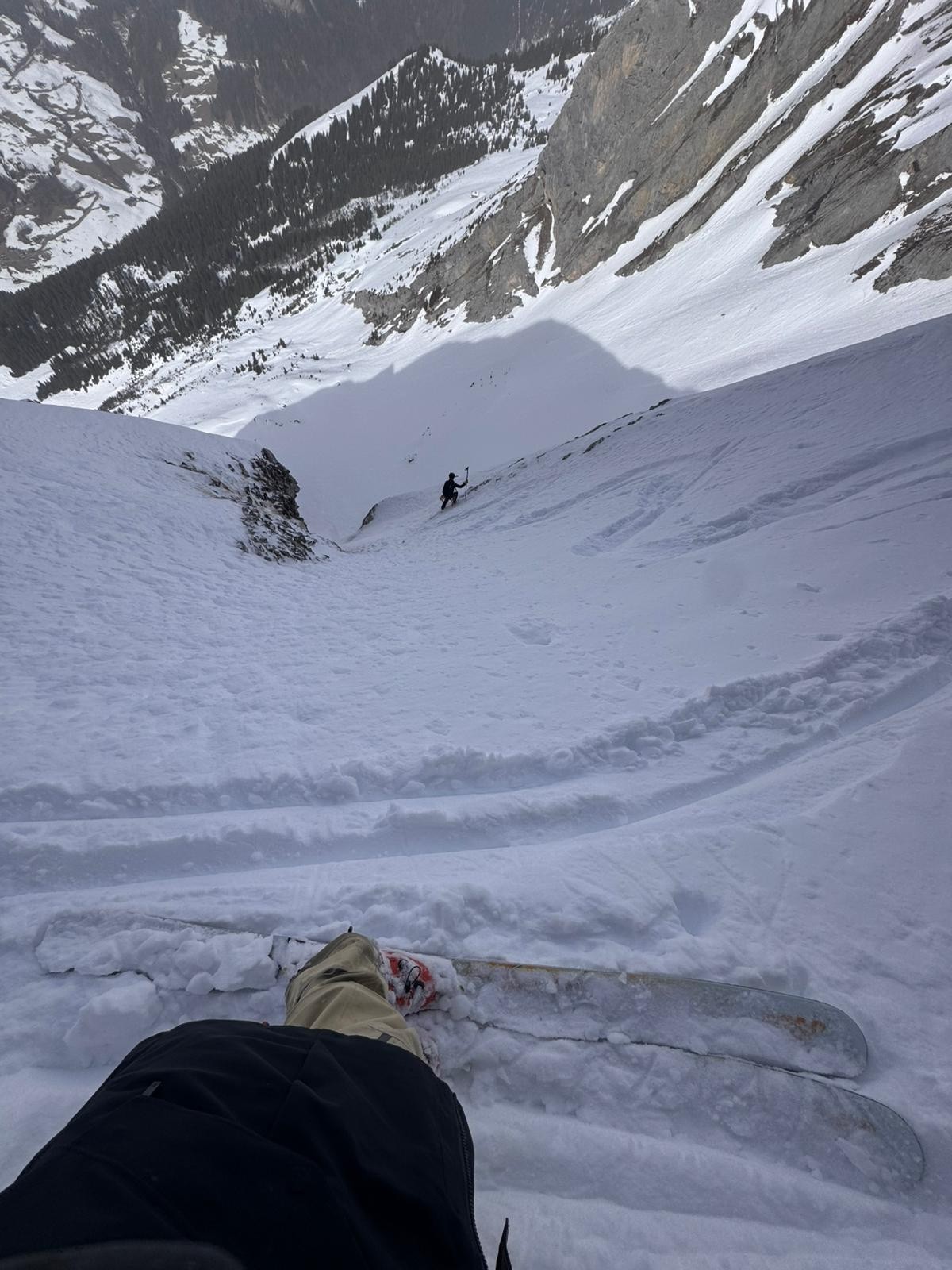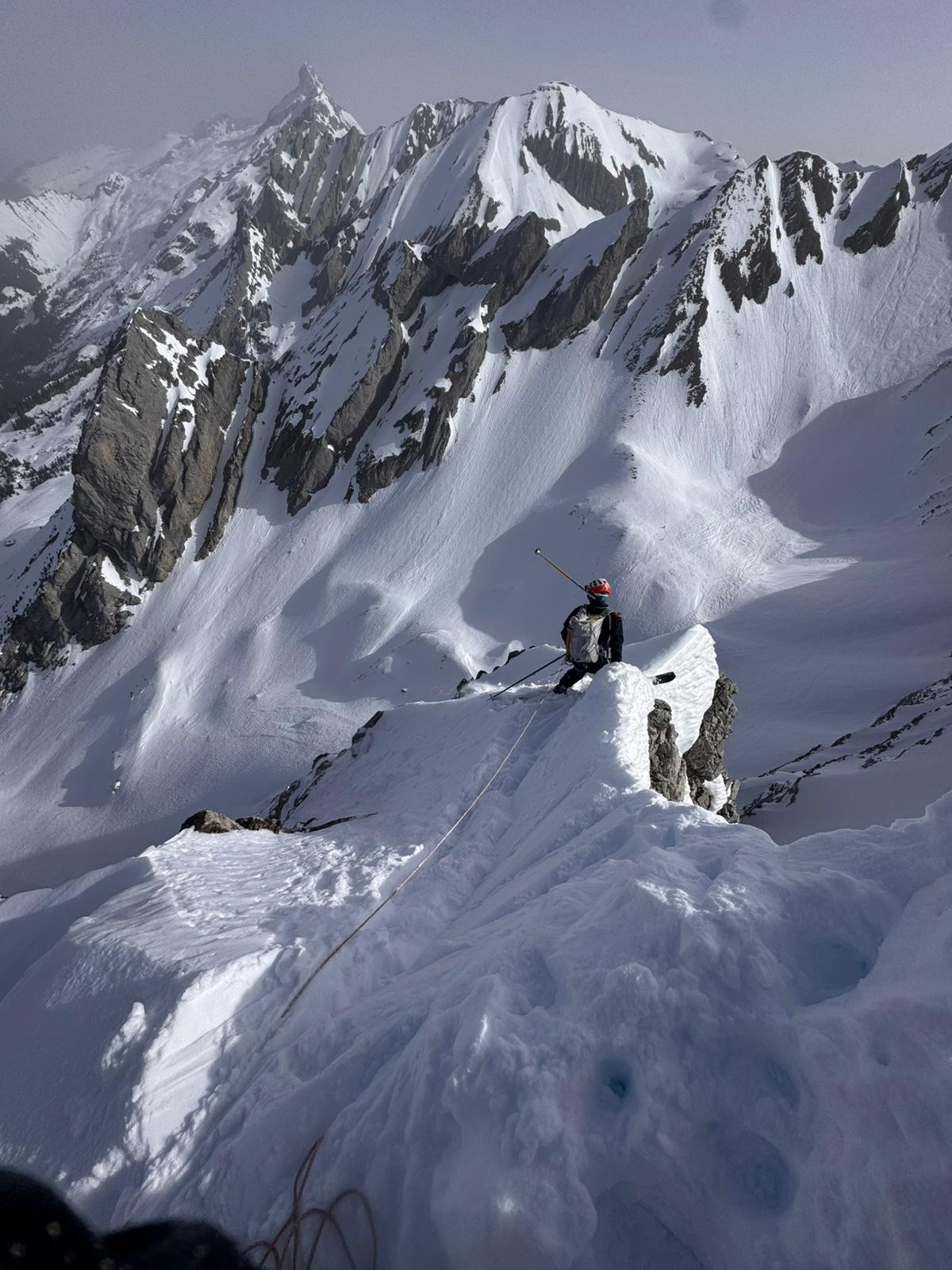 Du bon ski ensuite pour rejoindre le "crux" prévu. A nouveau un Z, avec du rocher bien affleurant et assez dalleux. Encordé à nouveau, ça passe bien grasse à de bonnes mains et bons ancrages, mais parfois il faut littéralement se pendre sur les mains.