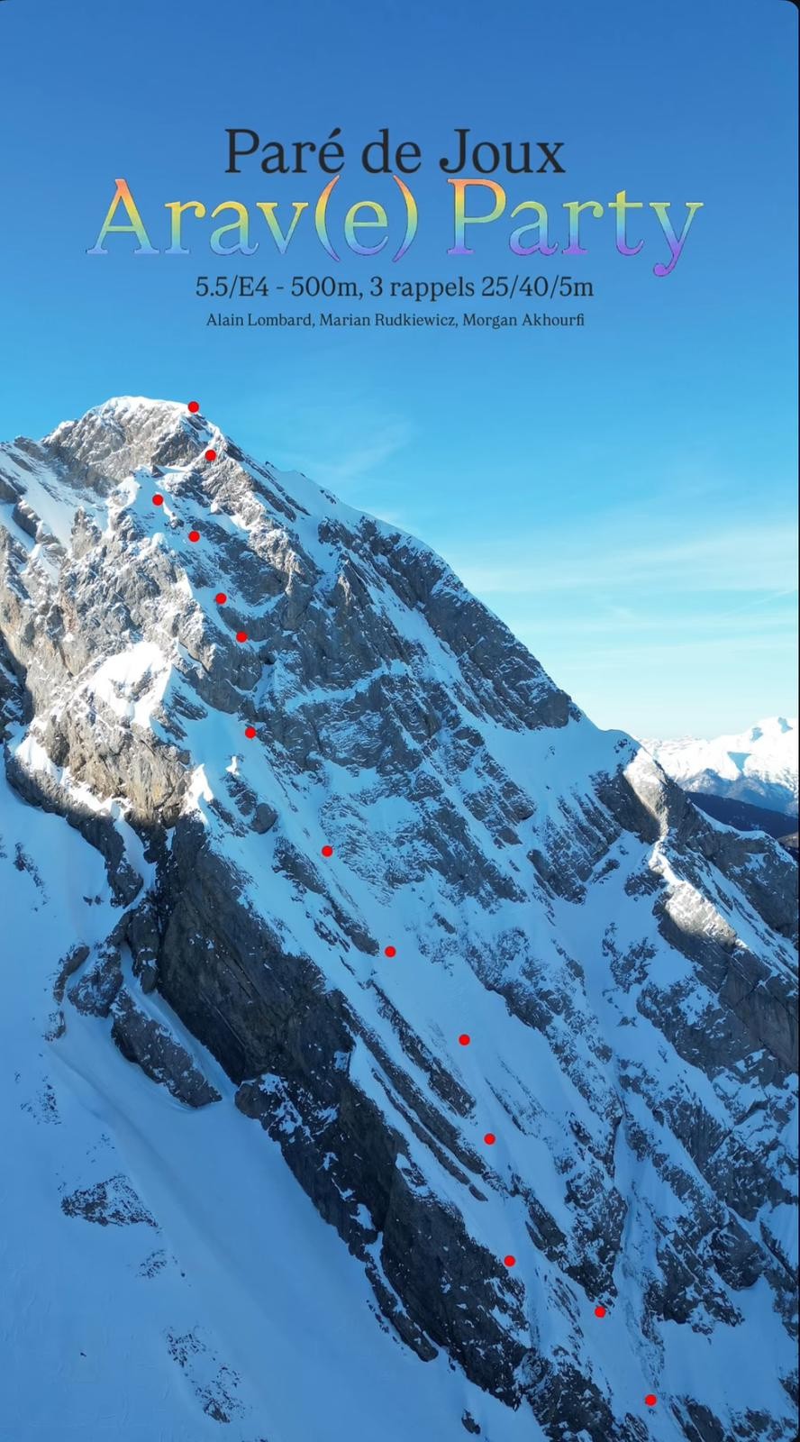 Assuré sur béquet, c'est dry ski sur un Z d'anthologie. Pas si dur au final, deux conversions impressionnantes, une arête très effilée, et un pas de dry ski très malcommode où il faut se lancer en avant pour se pendre à un "bac" (Morgan ne valide pas).